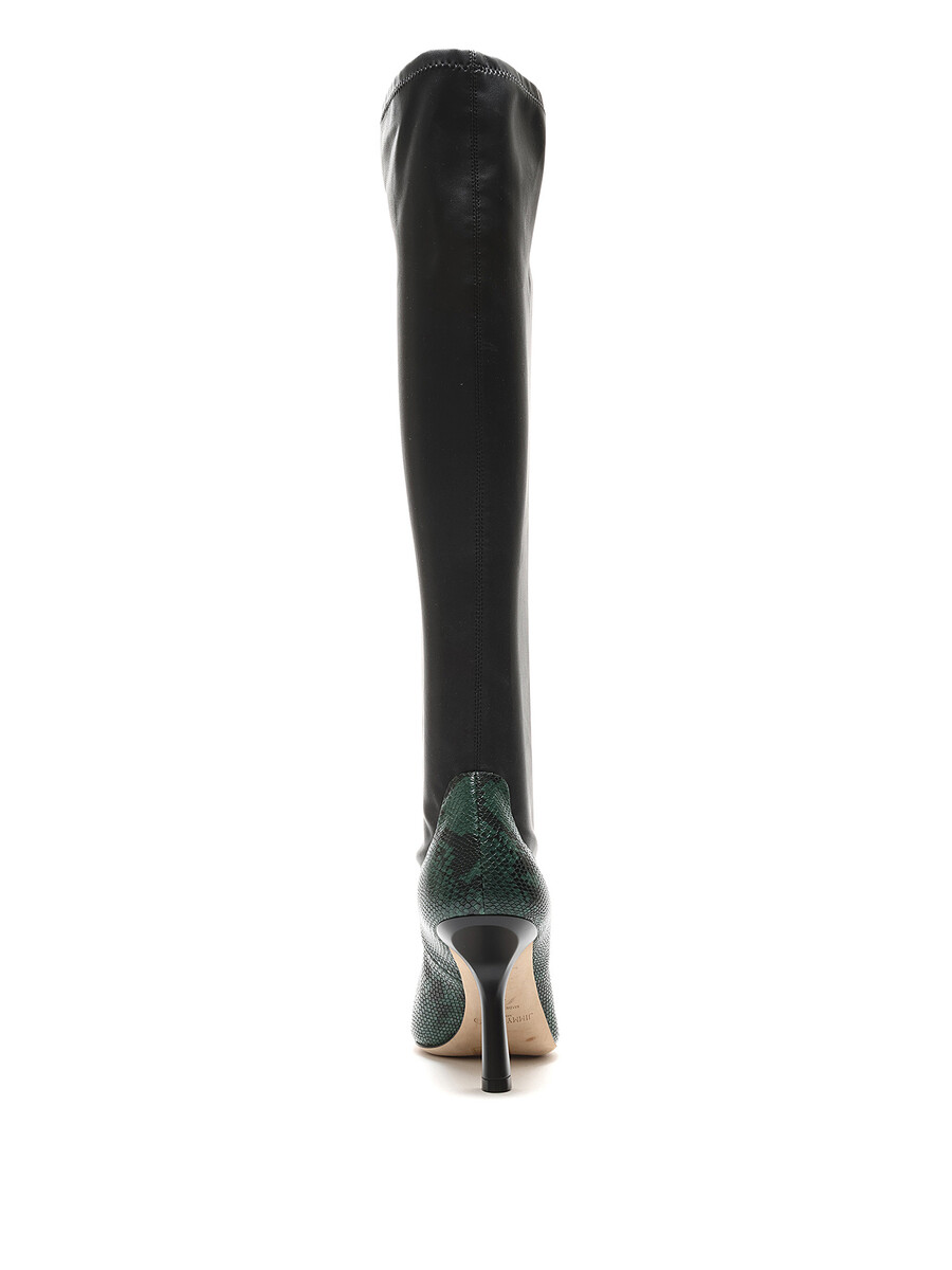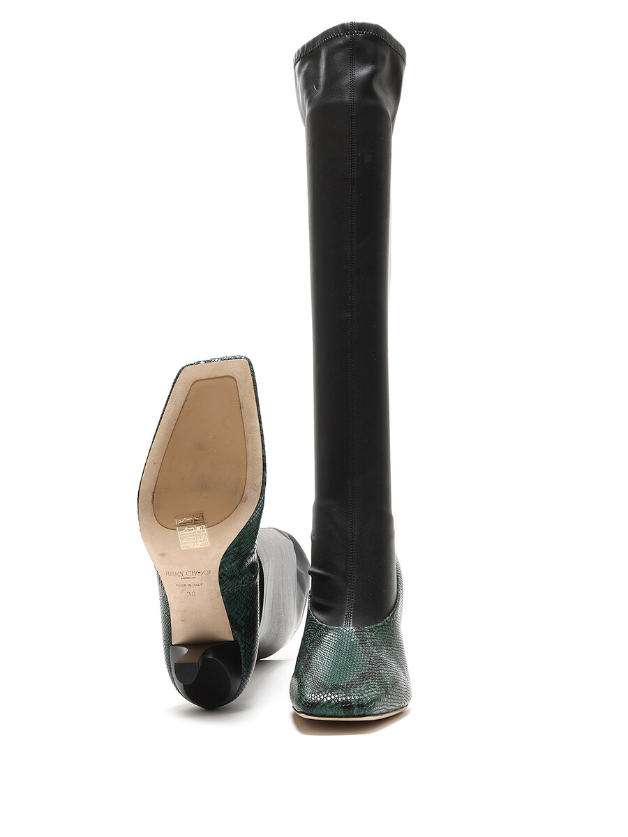Knee-high stretch leather boots with dark turquoise snake-print accents. Square toe. Stiletto heel.