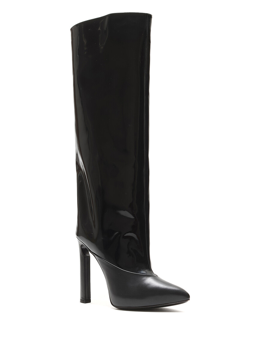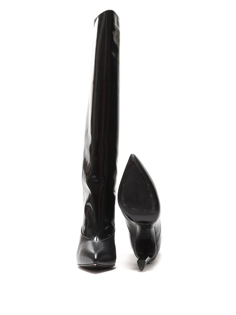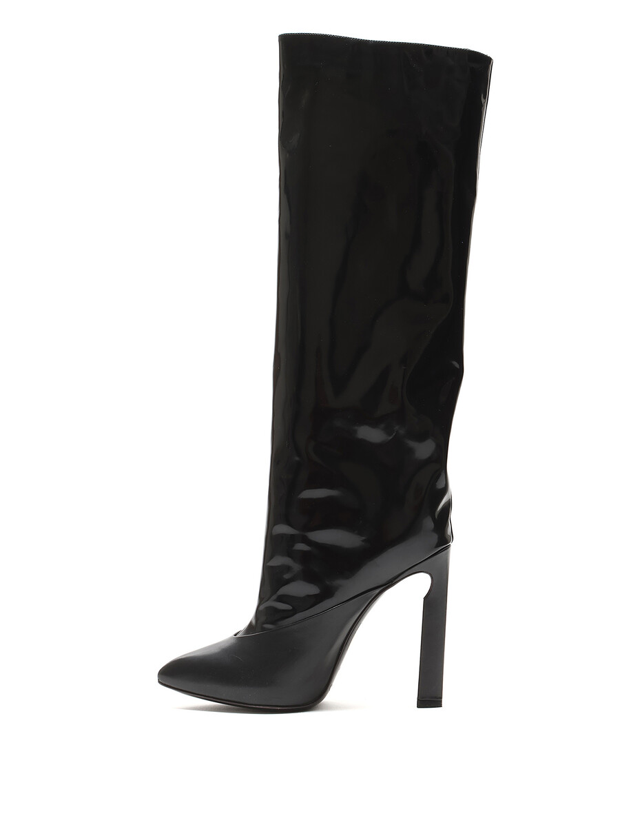 Smooth leather knee-high boots in black with a sleek silhouette. Pull-on design. Pointed toe and leather sole.