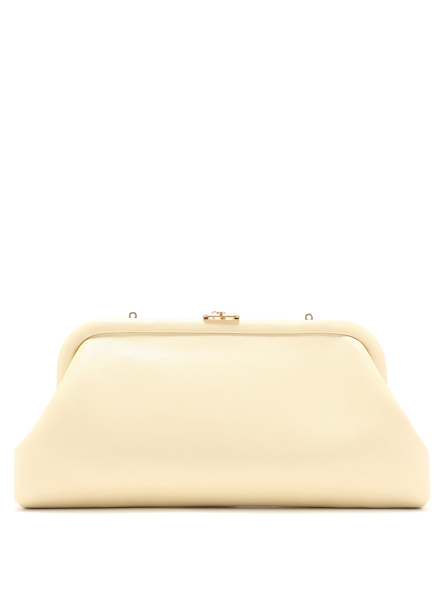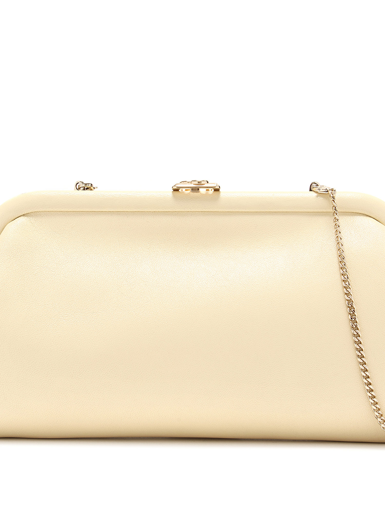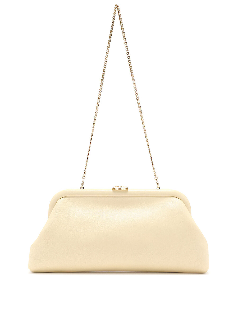 Ivory leather clutch with flap closure and gold-tone chain strap. Gold hardware detailing.