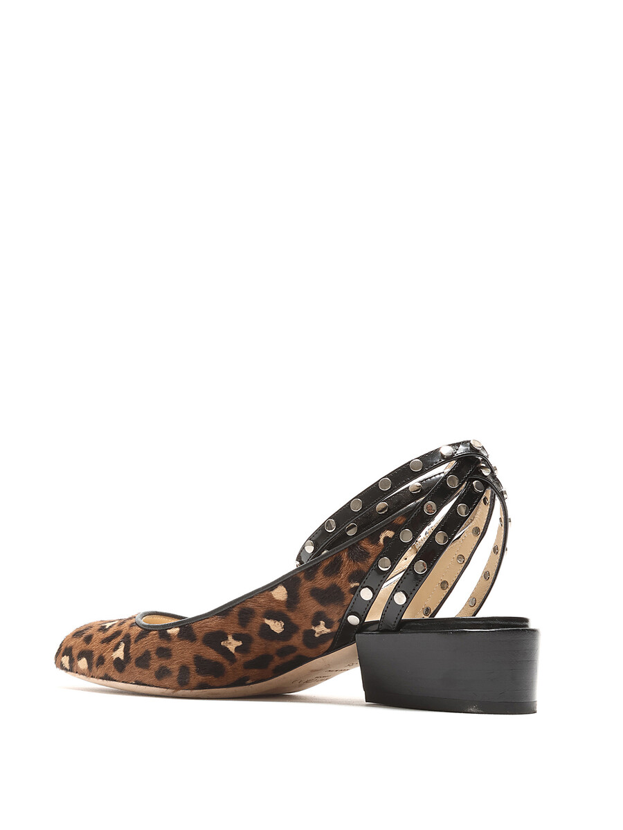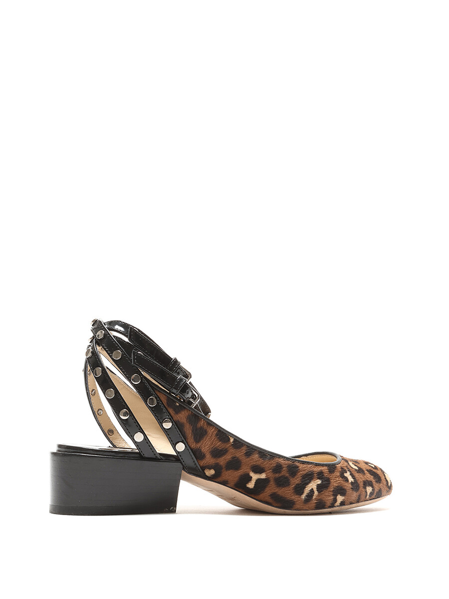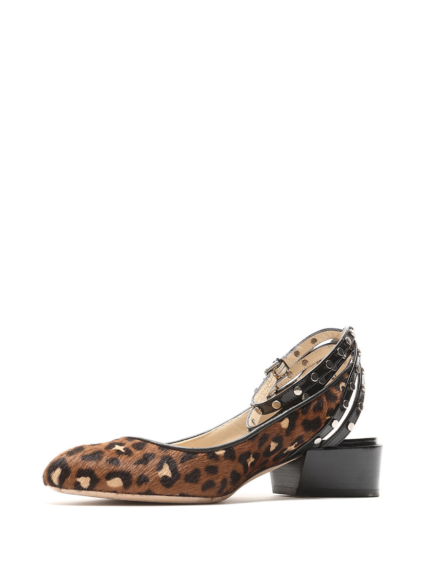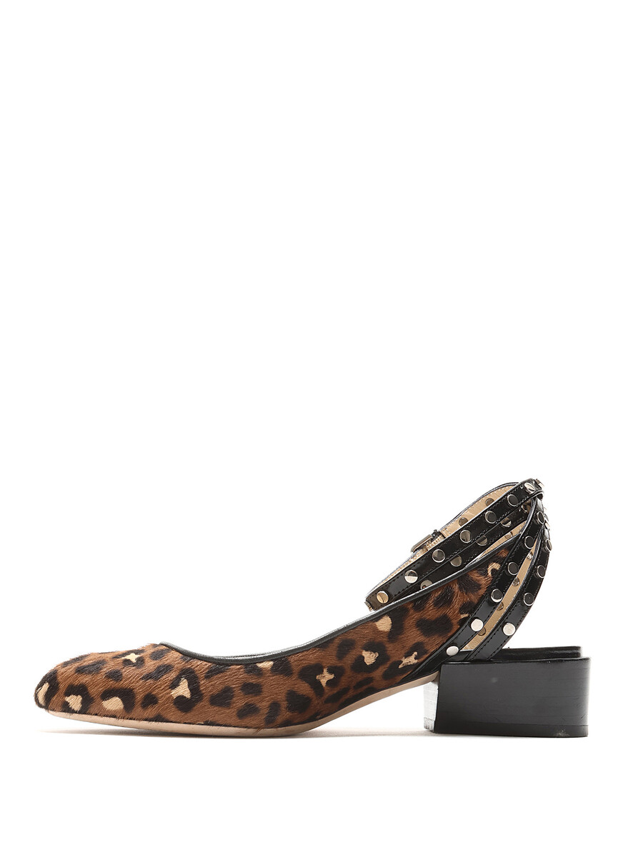 Heeled ballet flats in a short hair leopard pattern. Featuring a pin-buckle fastening and pointed toe. Leather sole.