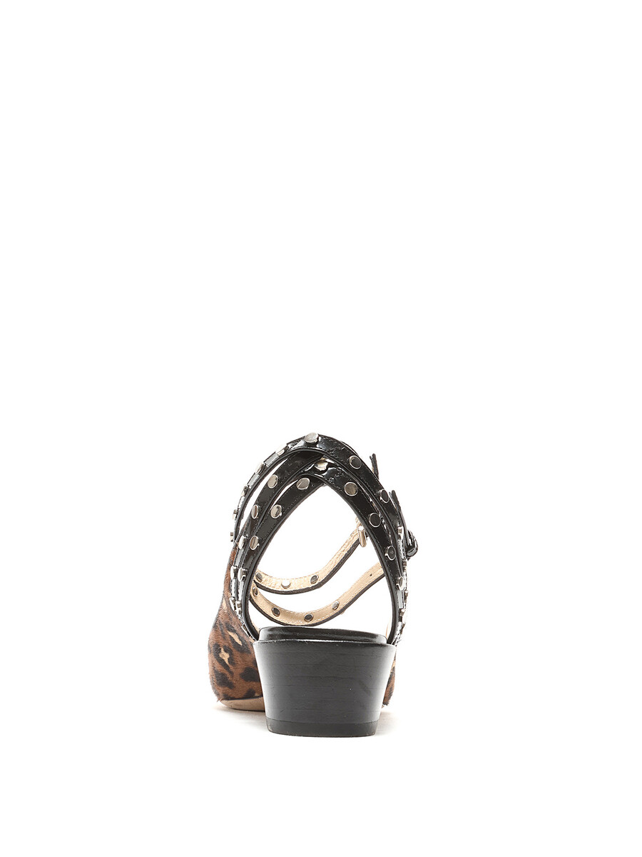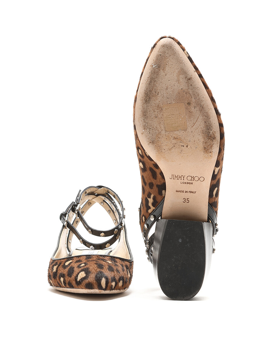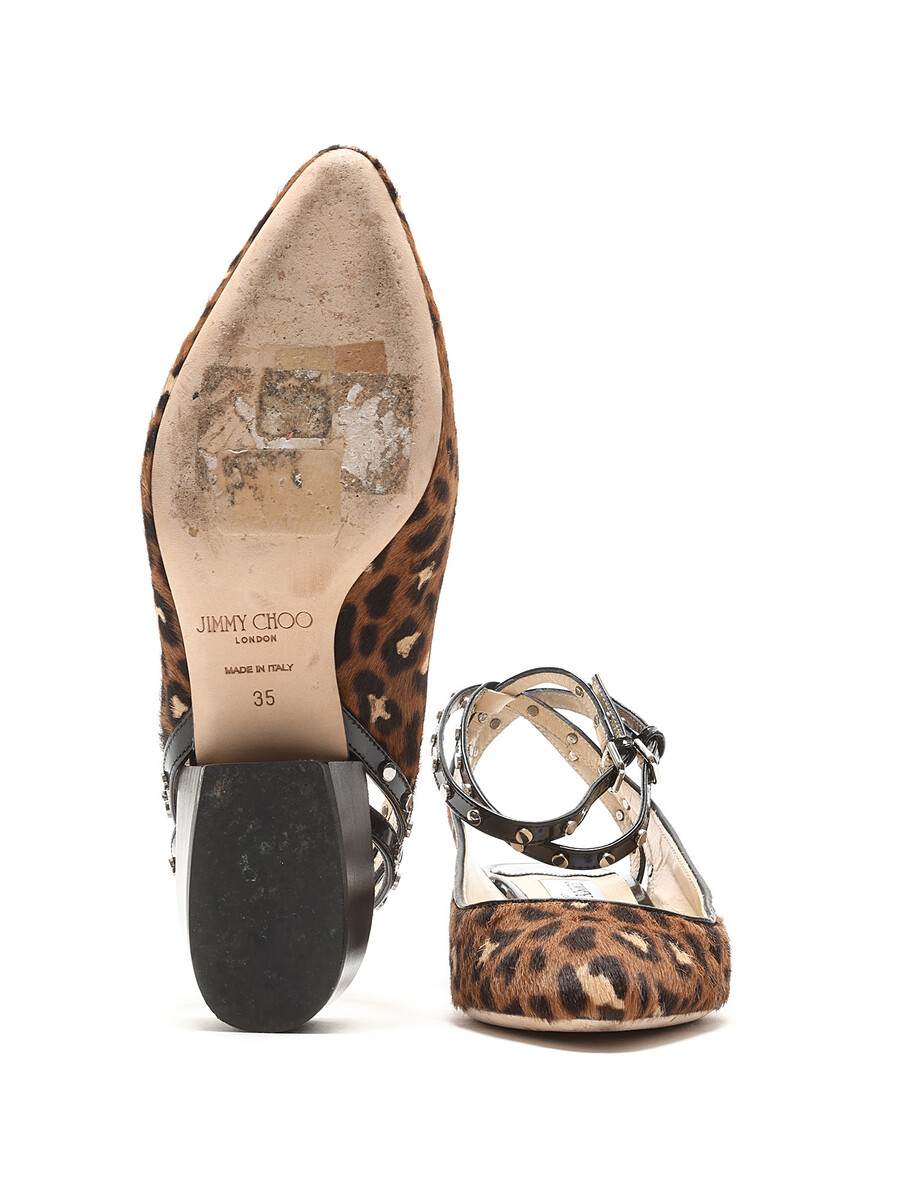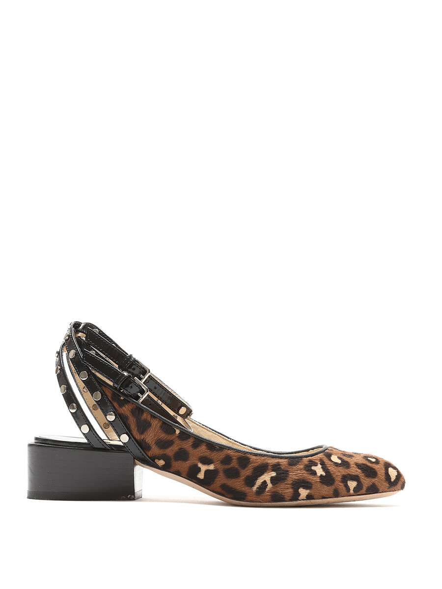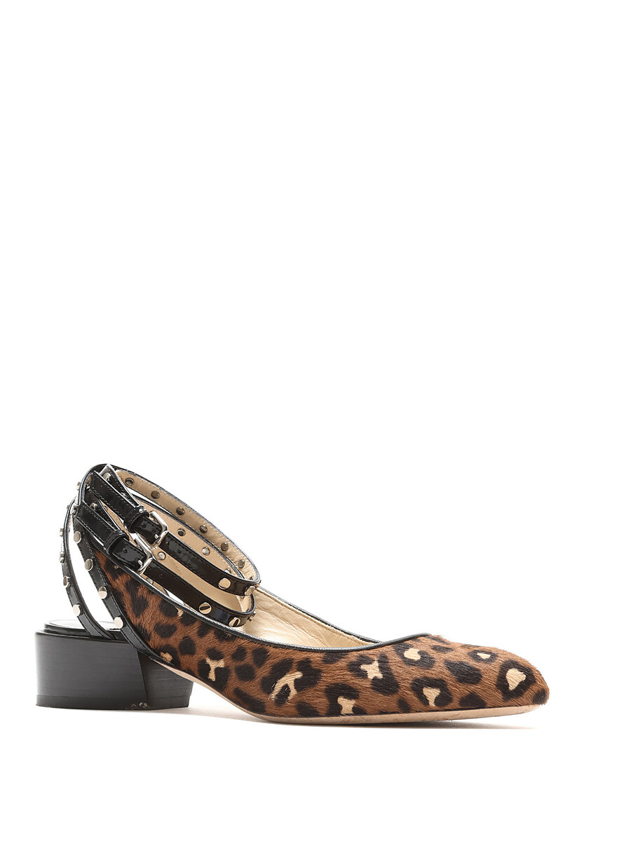Heeled ballet flats in a short hair leopard pattern. Featuring a pin-buckle fastening and pointed toe. Leather sole.