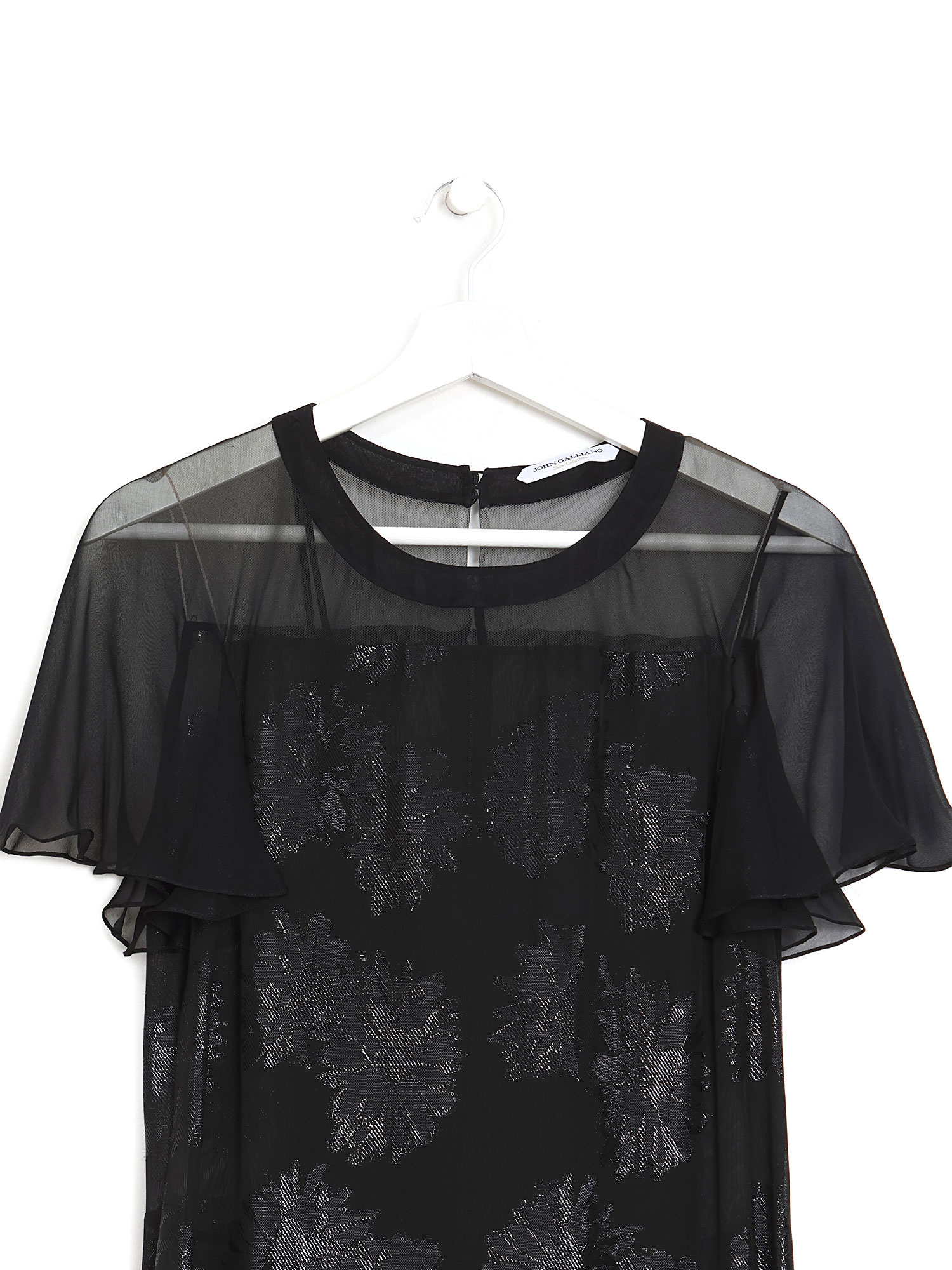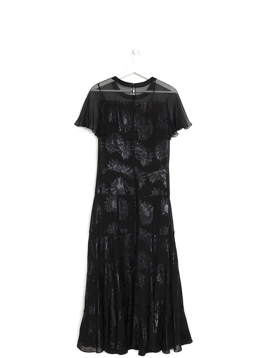 Semi-sheer floral pattern black maxi dress with short sleeves and shimmering finish. V-neck satin slip lining. Round collar, zip and button closures.
