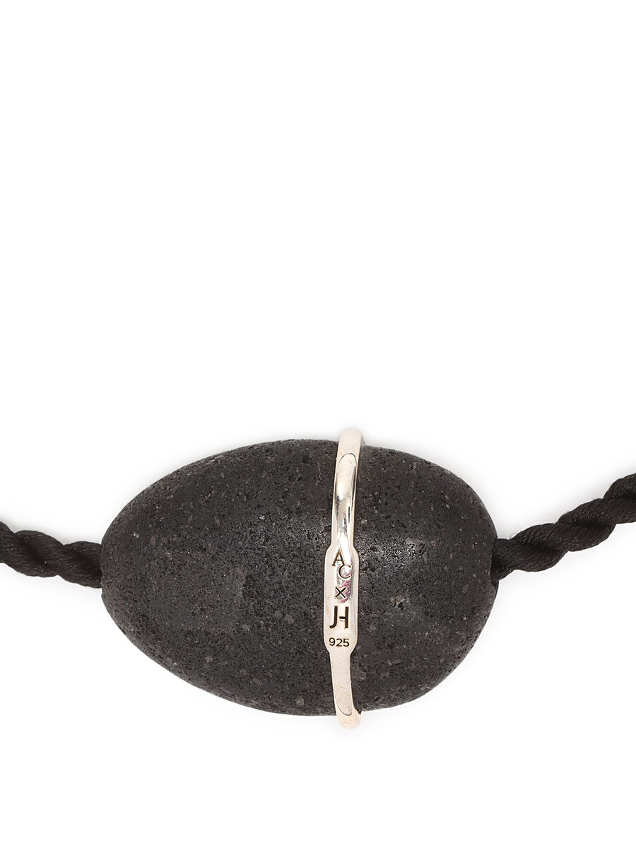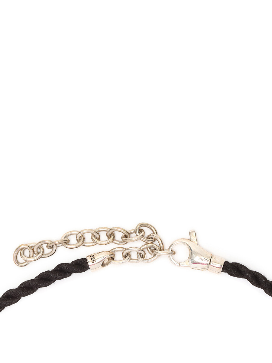 Braided cord necklace with a striking black stone centerpiece framed by a silver ring. An elegant fusion of natural and metallic elements.