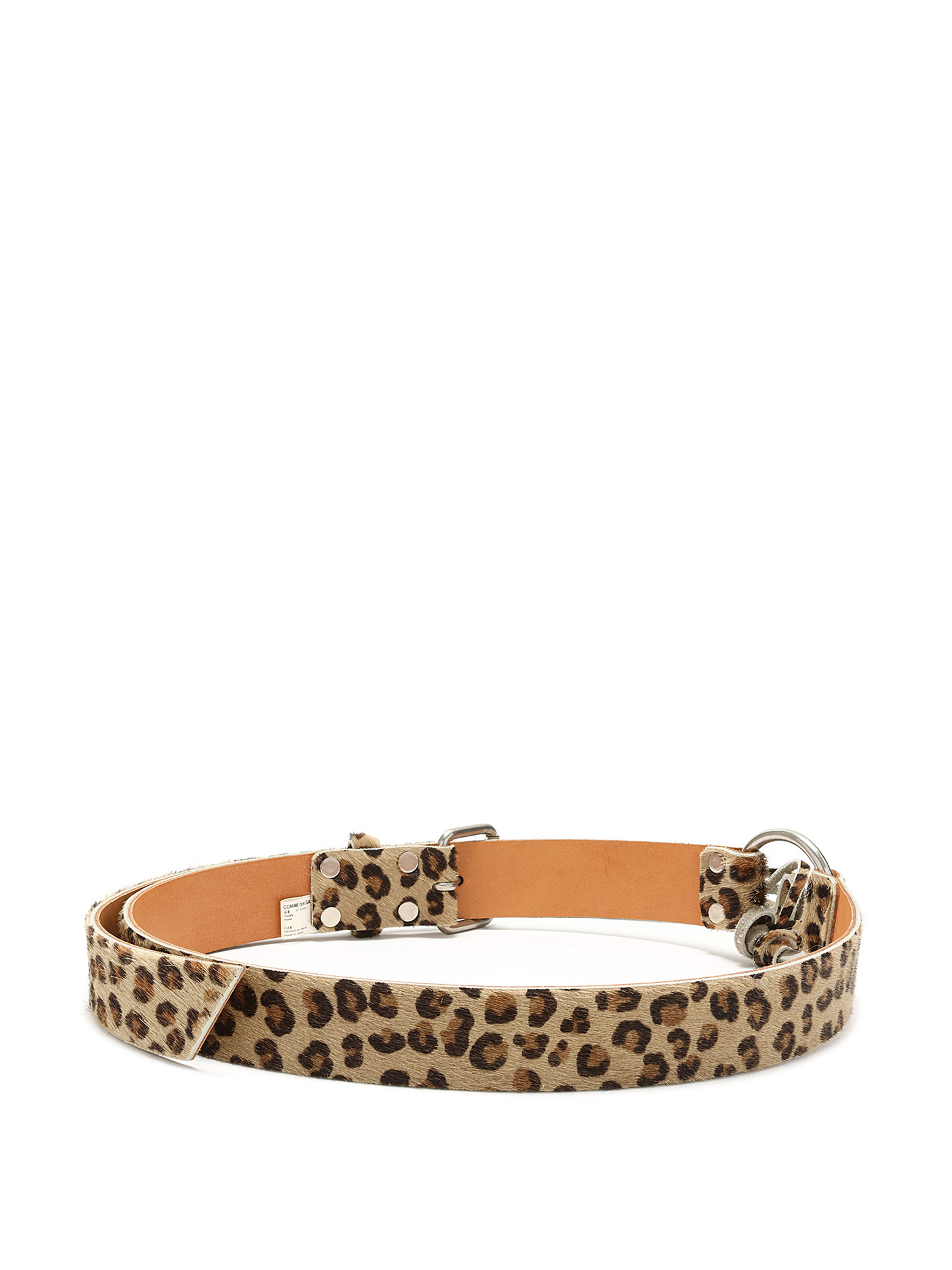 Leather belt featuring a brown and black leopard pattern with fringe details. Silver-tone metal buckle.