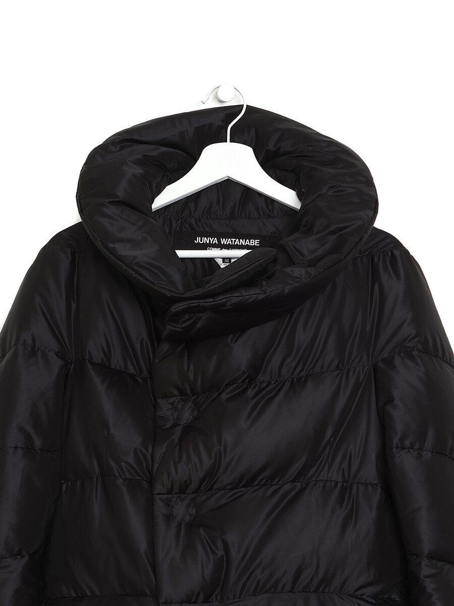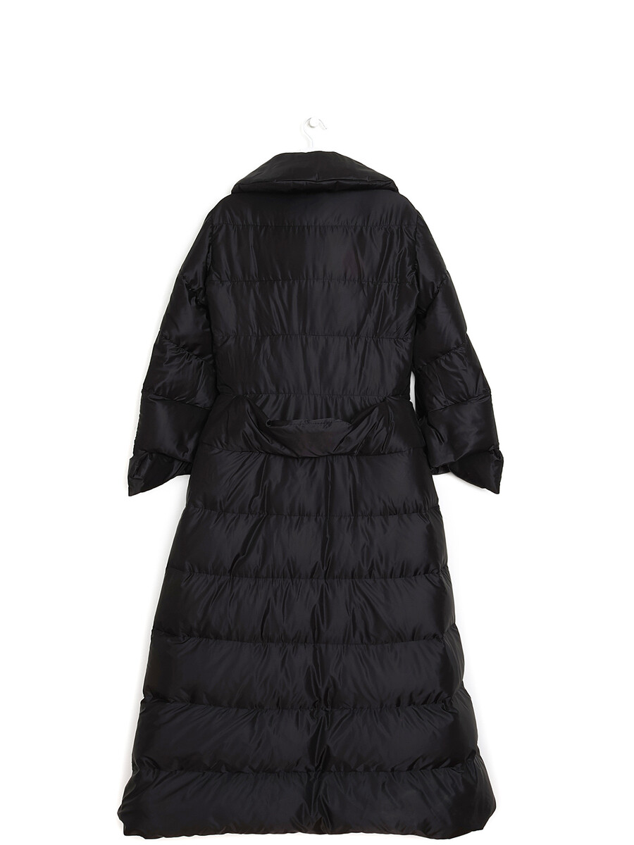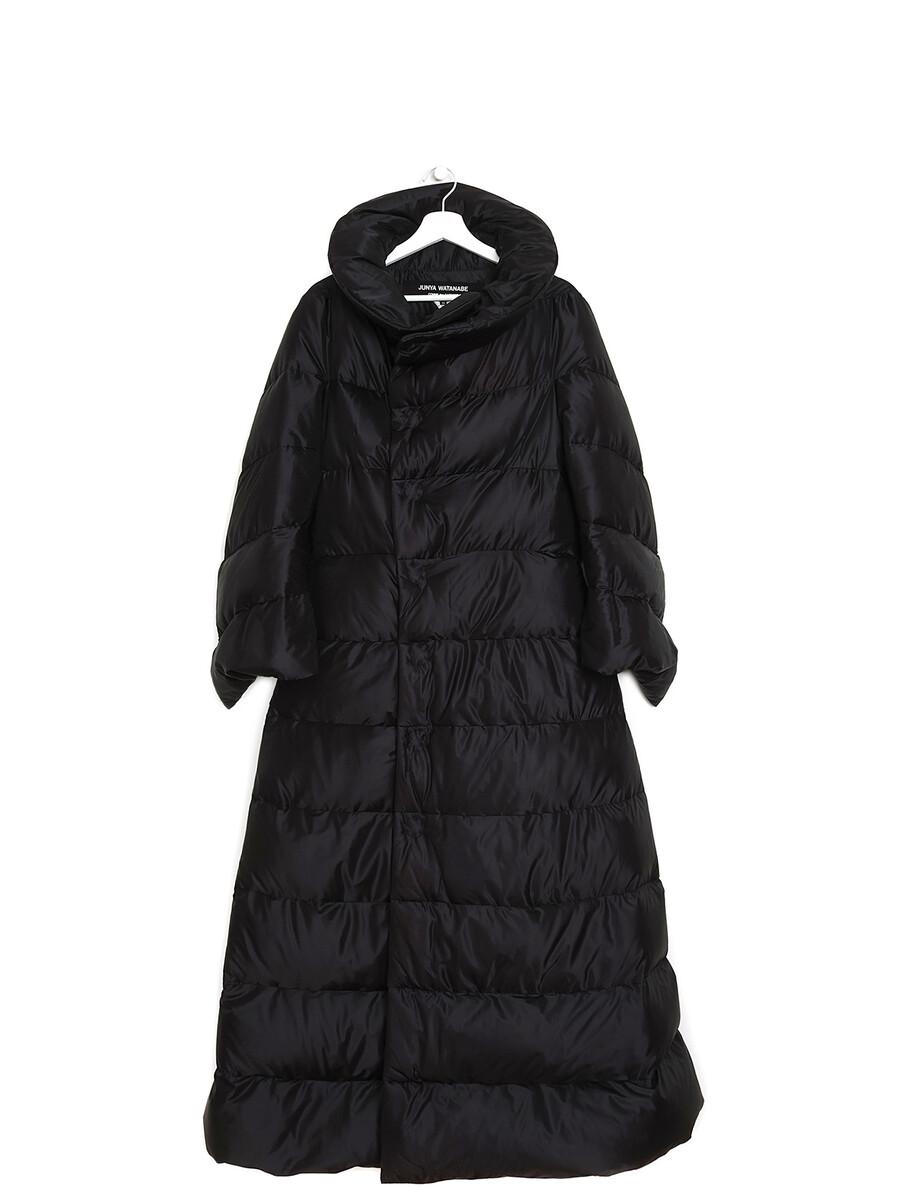 Long quilted coat in black. Front button closure. Zippered pockets.