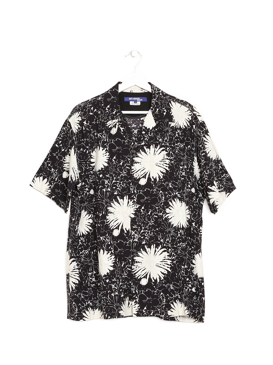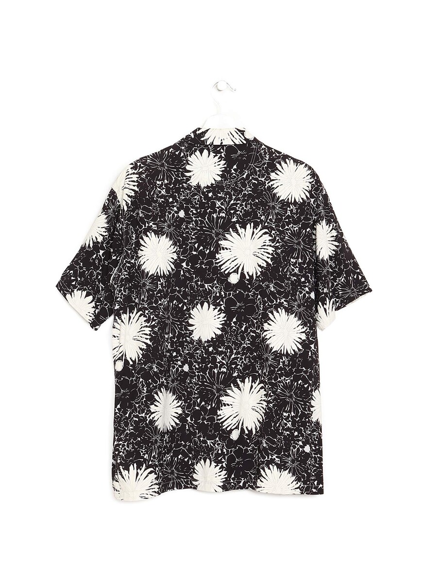 Long sleeve shirt featuring a floral motif in black and white. Classic collar.