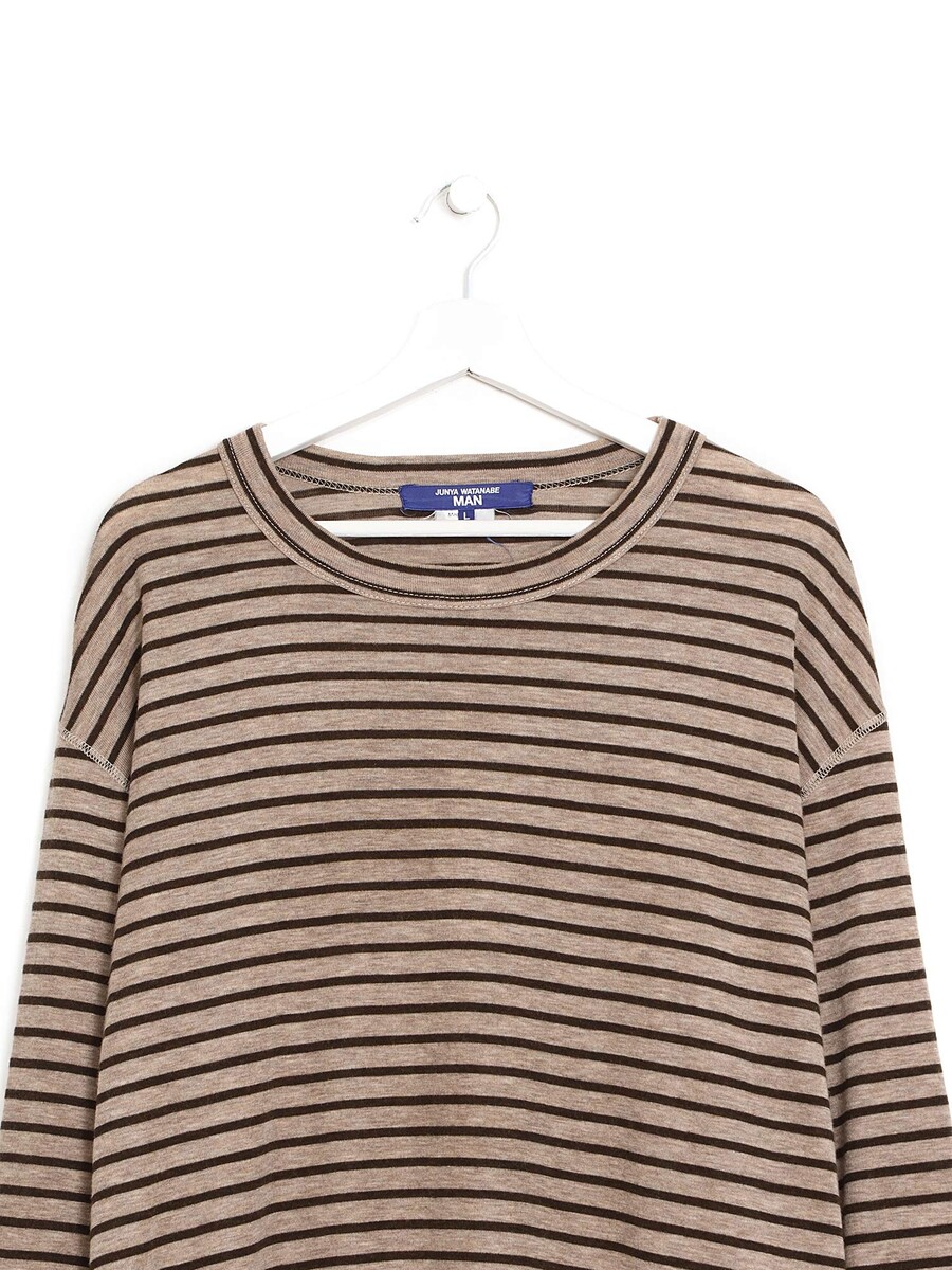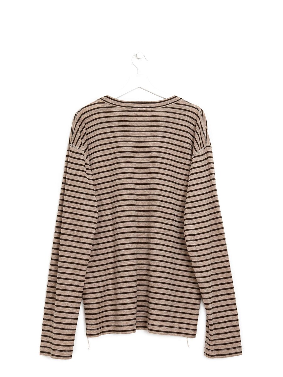 Long sleeve striped top in beige and brown tones. Classic crew neck collar.