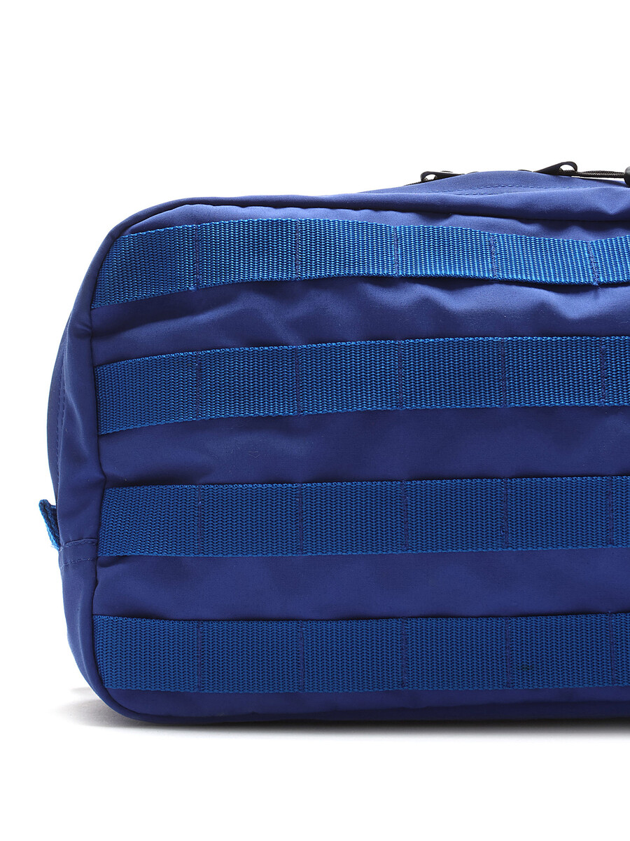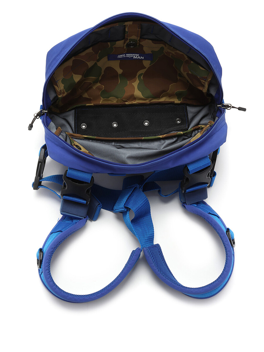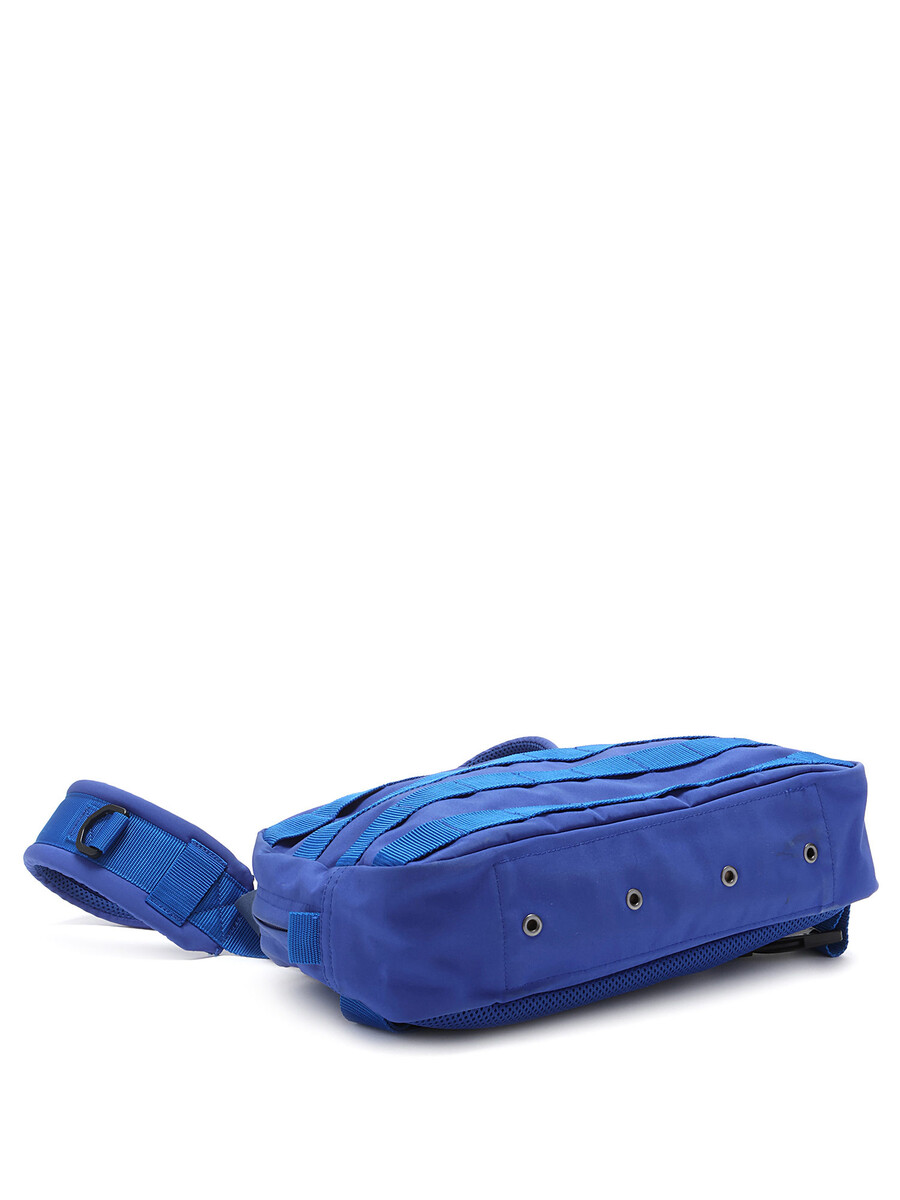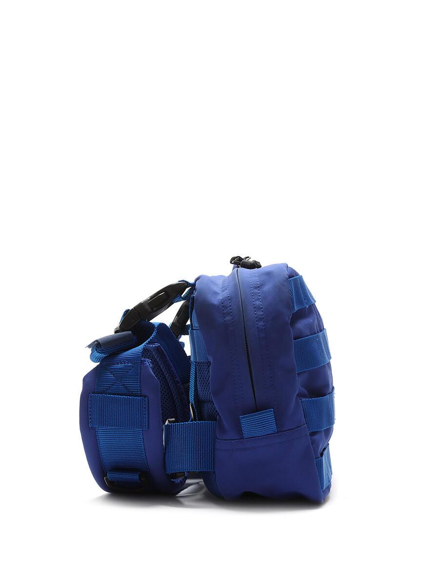 Chest harness bag in blue featuring adjustable straps. Snap button and zipper closures. Camouflage print lining.