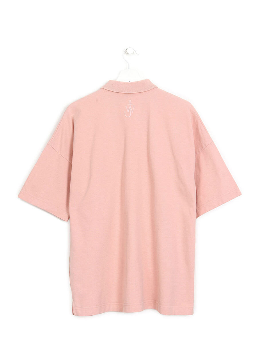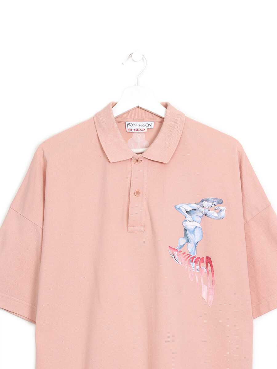 Graphic design short sleeve polo shirt in pink. Features a button front and classic shirt collar.