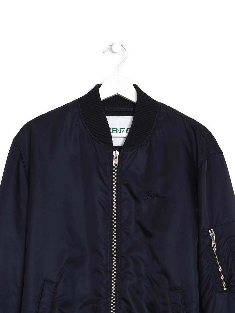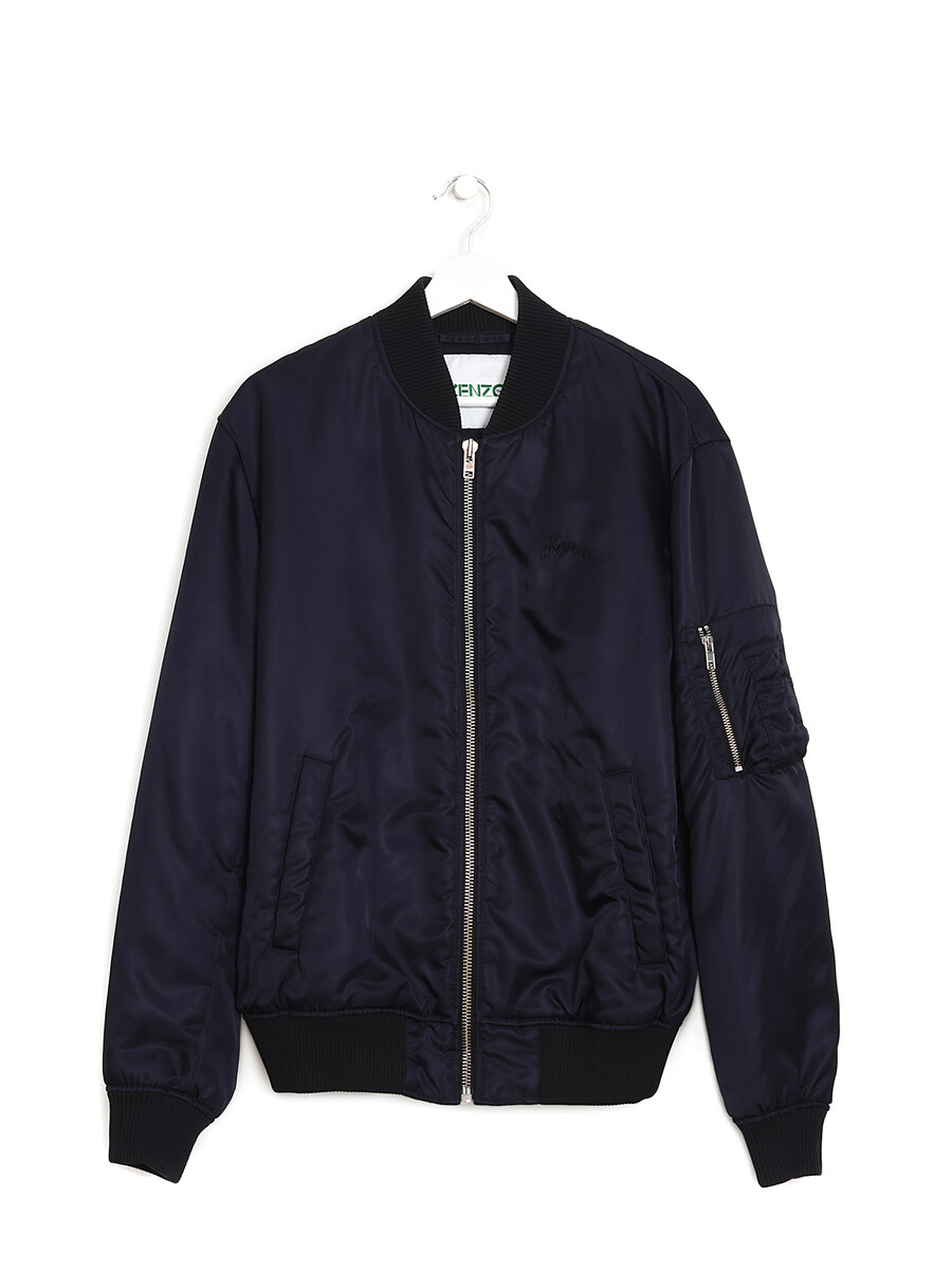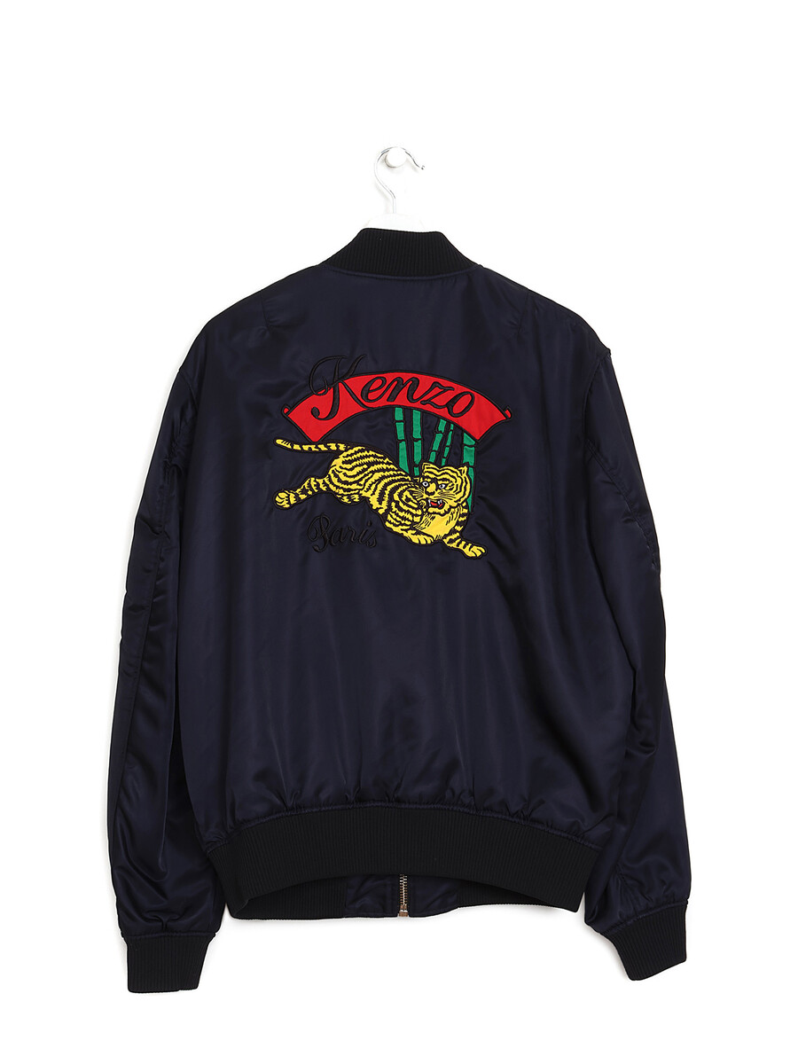 Black bomber jacket featuring graphic embroidery of tiger and logo. Ribbed collar, zip closure, and two flap-closure front pockets.