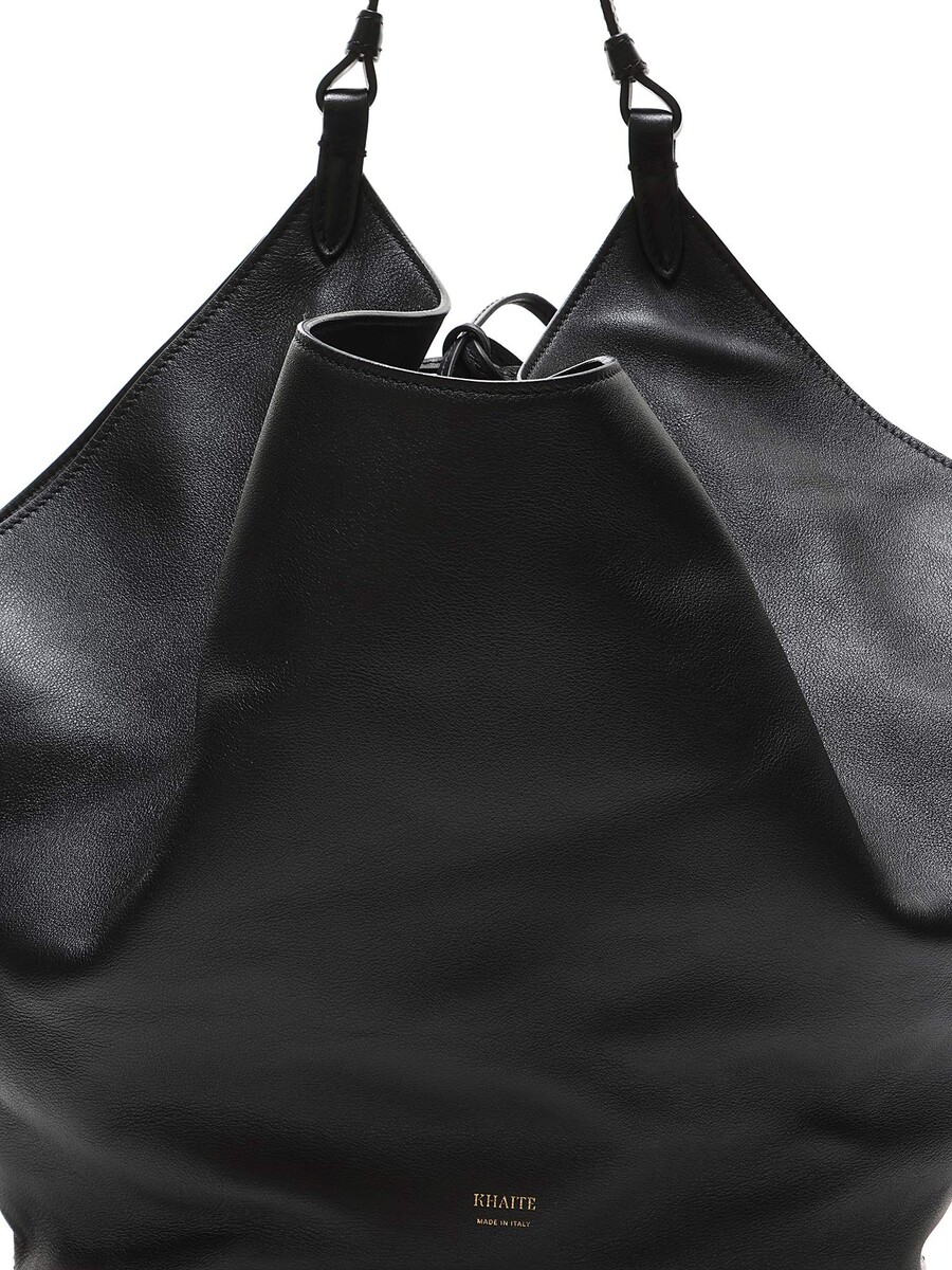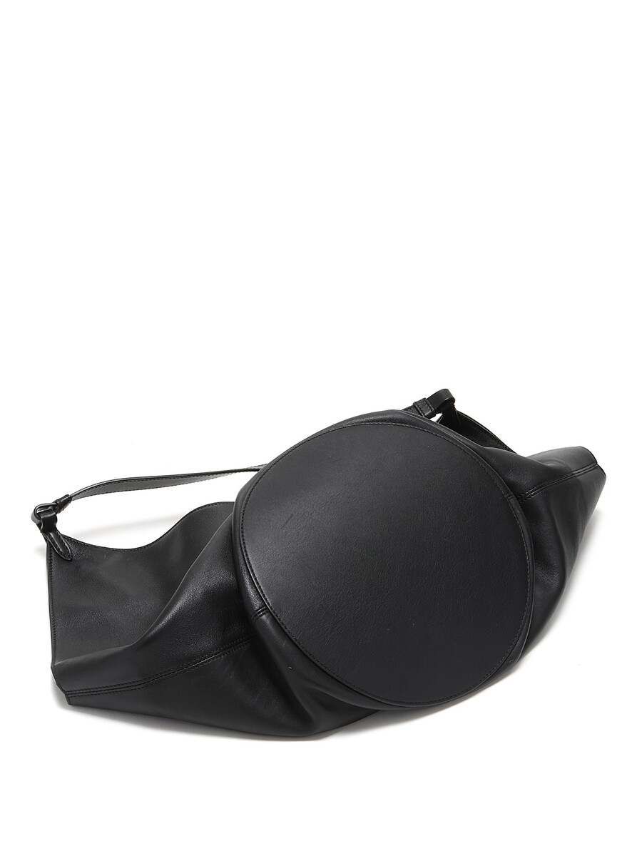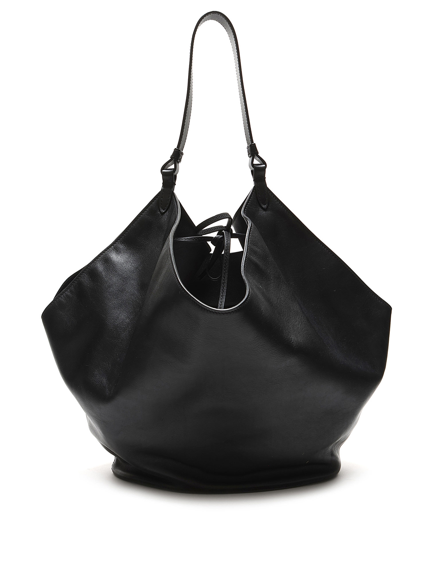 Leather hobo bag in black with tie closure. Adjustable single flat shoulder strap. Tonal stitching. Comes with a dust bag.