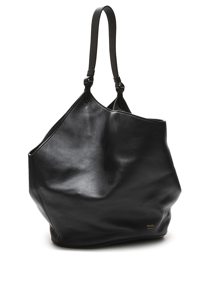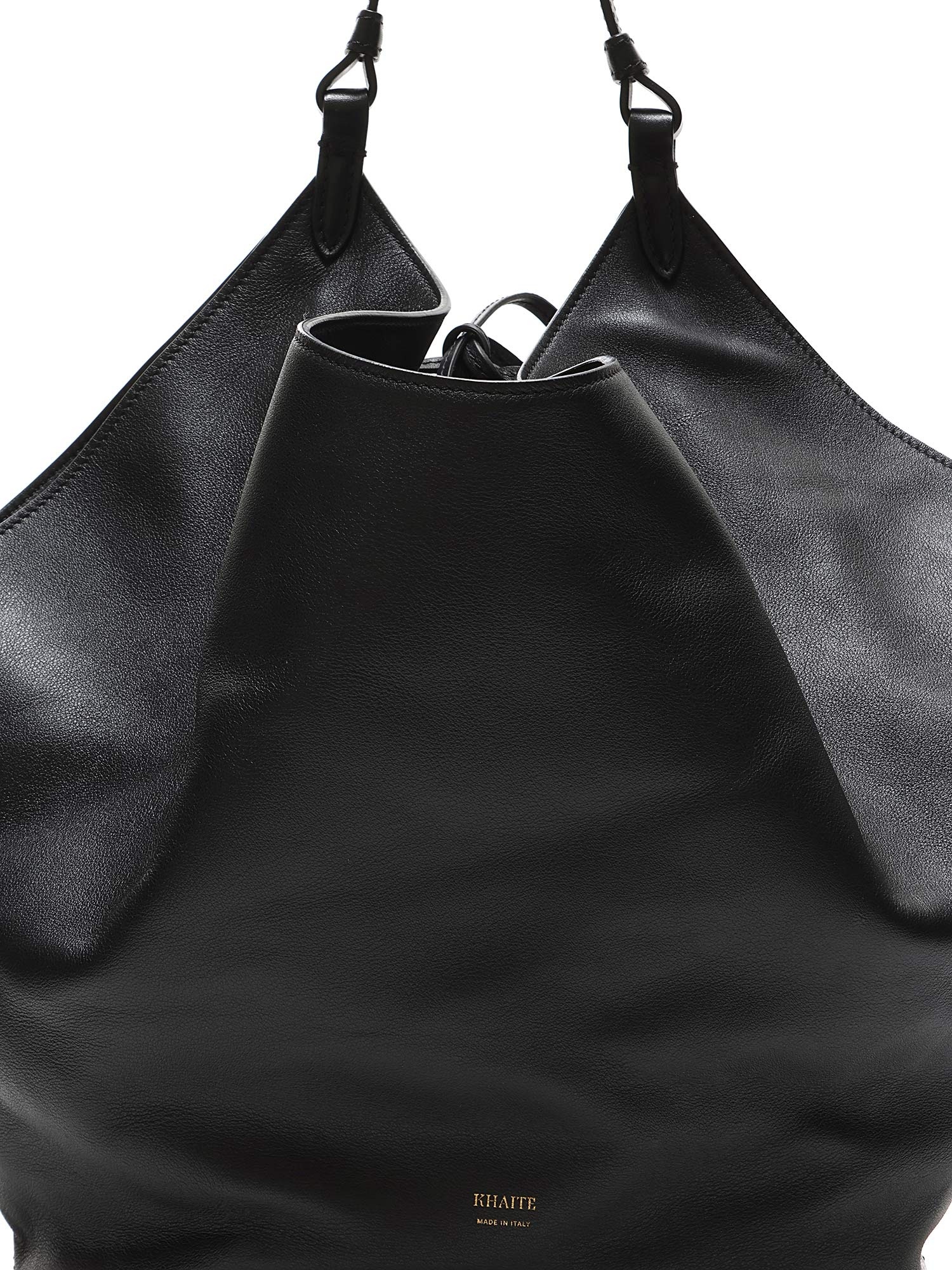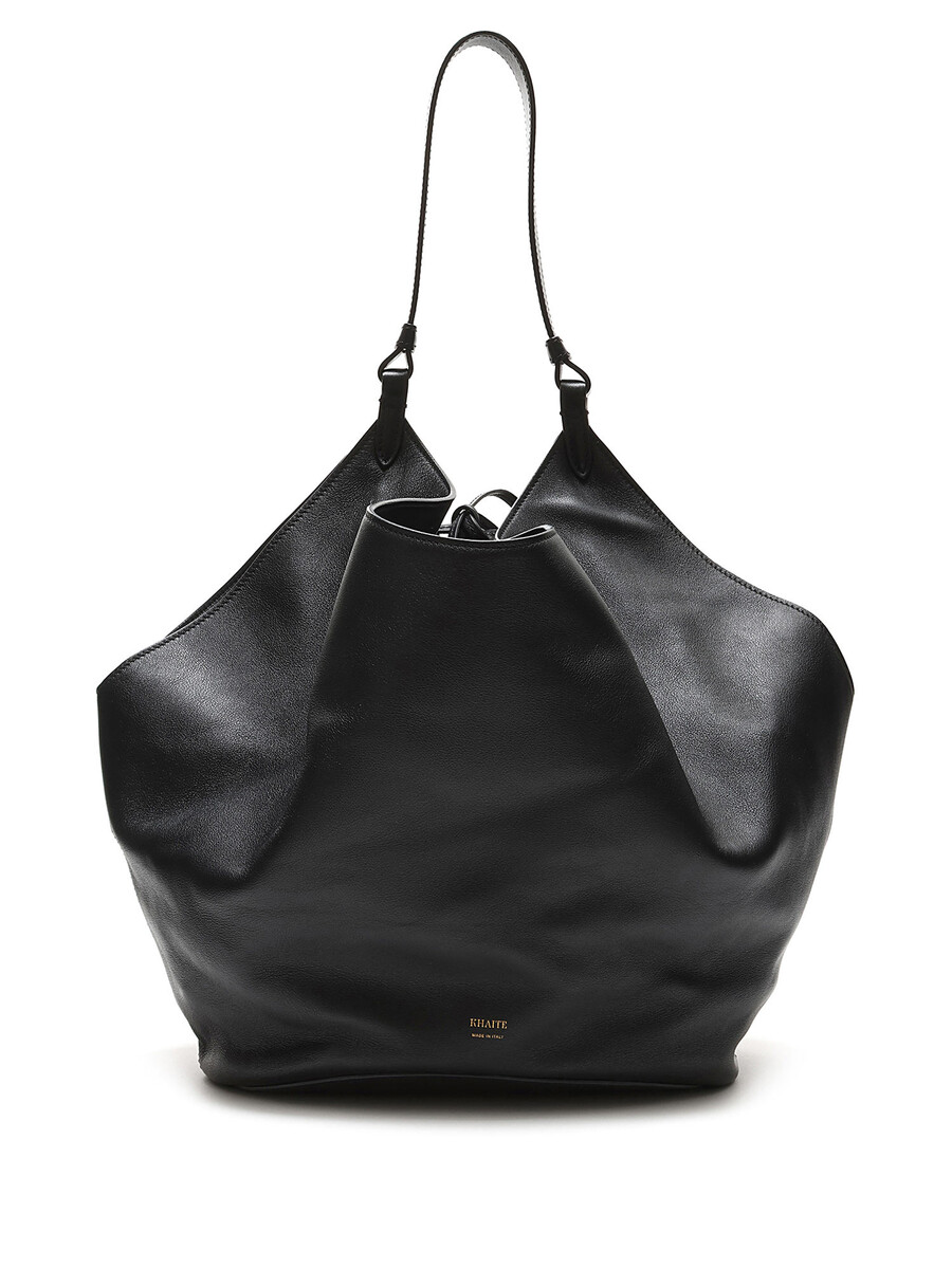 Leather hobo bag in black with tie closure. Adjustable single flat shoulder strap. Tonal stitching. Comes with a dust bag.