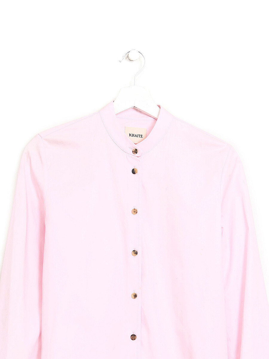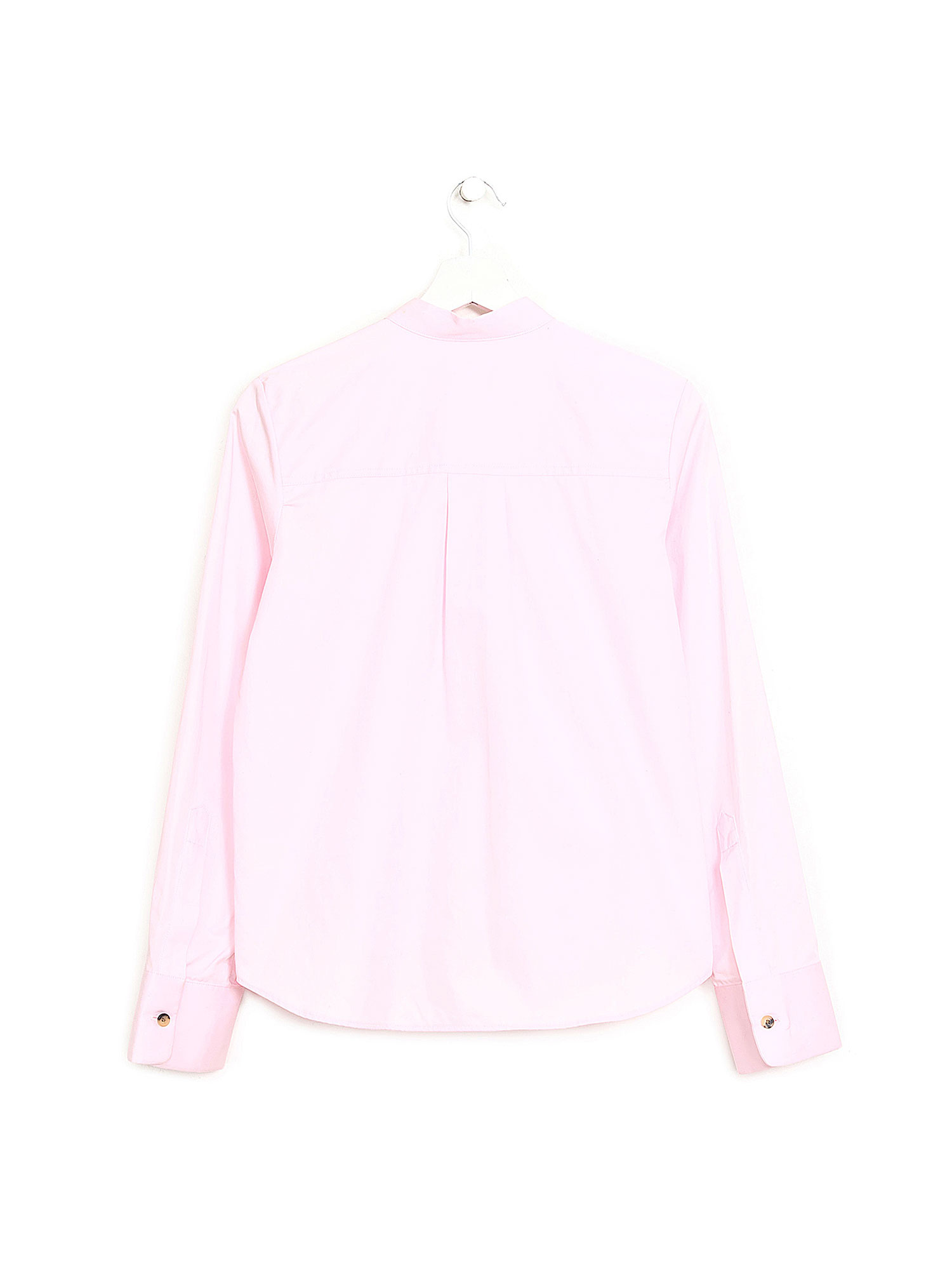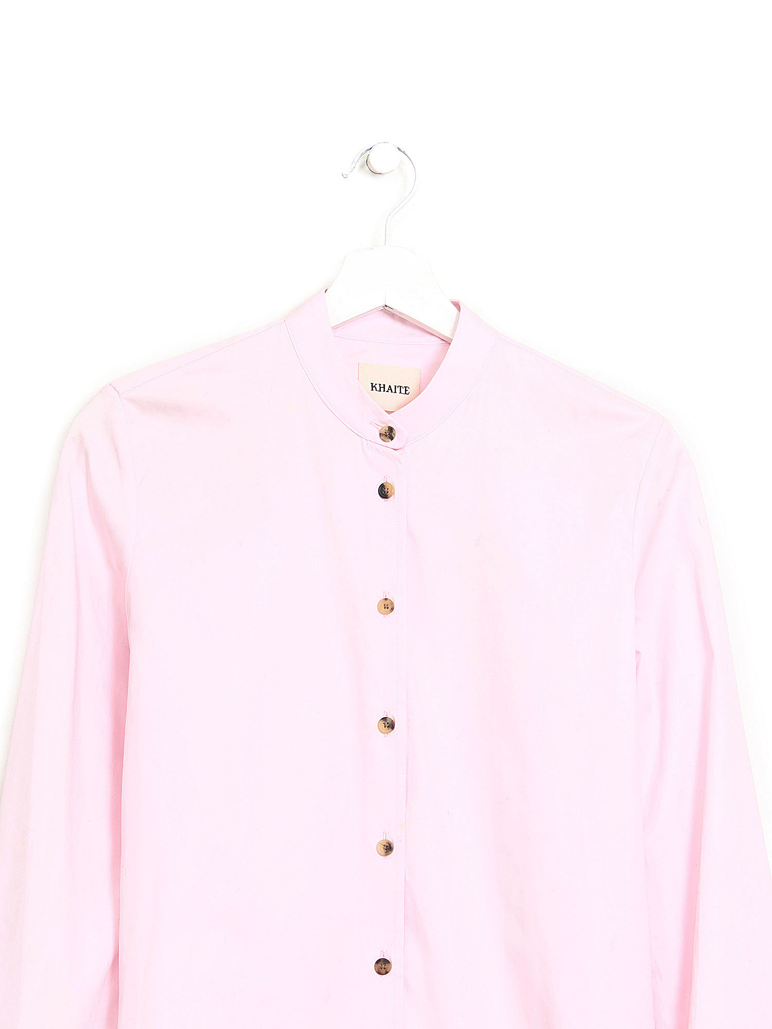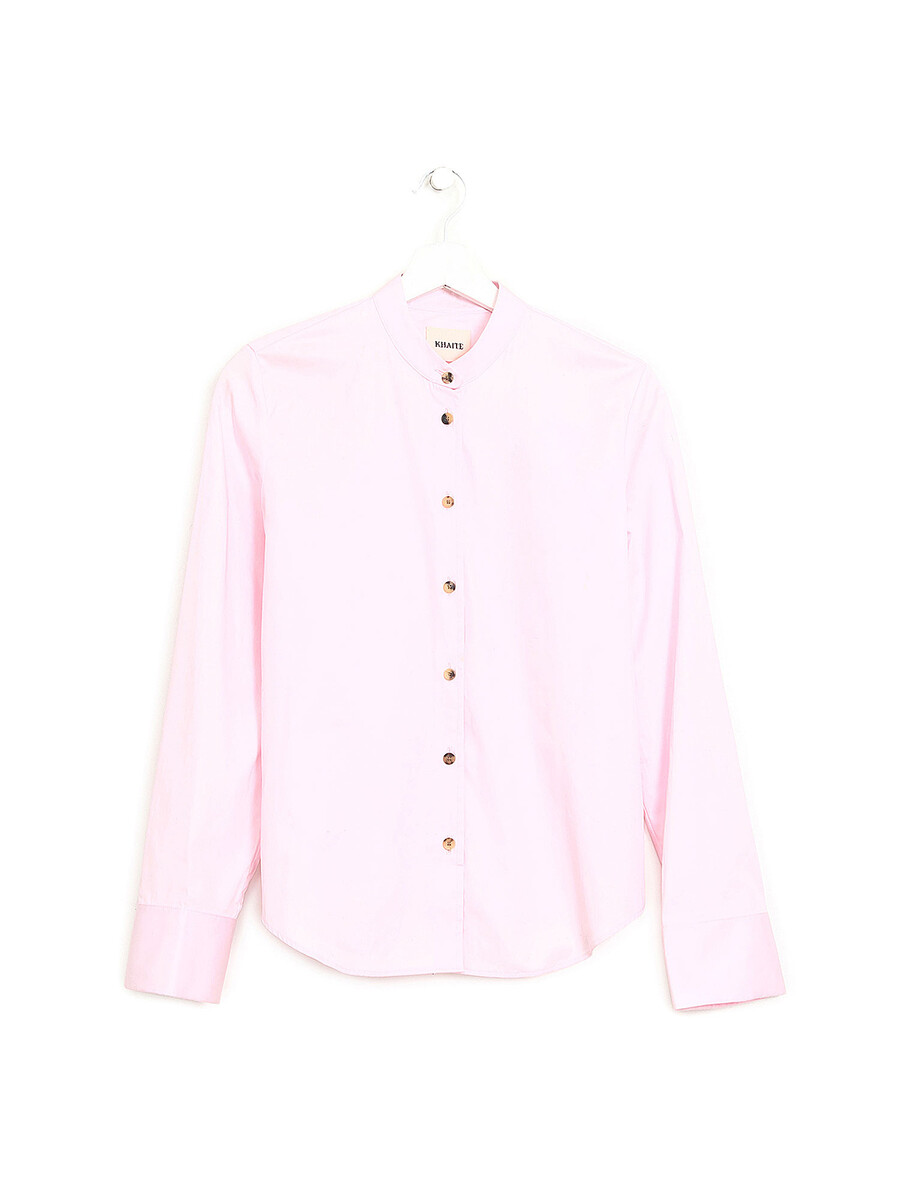 Long sleeve cotton blouse in a soft pink hue. Mandarin collar. Button-up front closure. Lightweight and breathable.