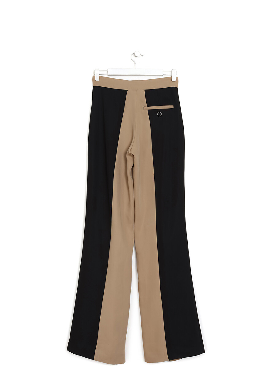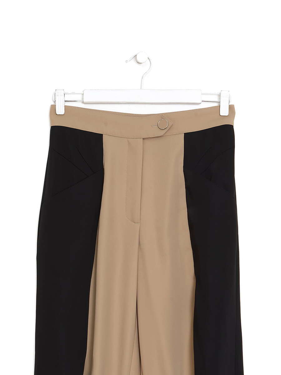 Contrast panel ankle-length trousers in beige and black, featuring puckered detail at the knee. Button and zipper closure.