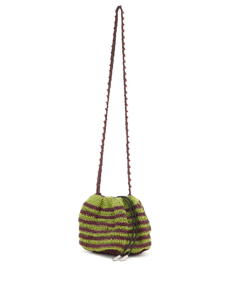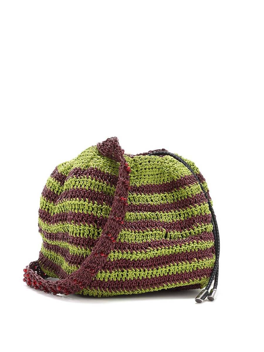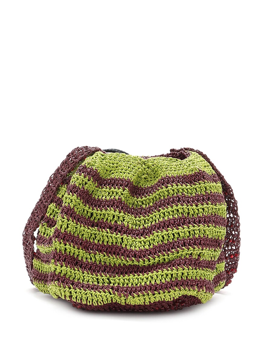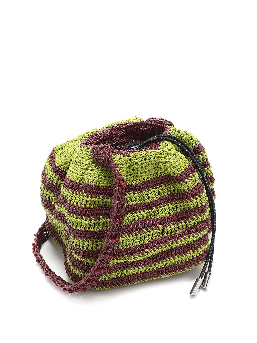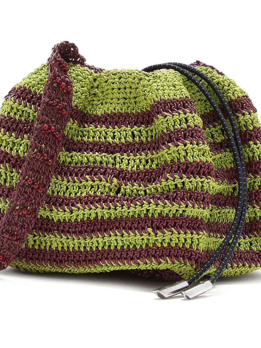 Striped crocheted texture bucket bag in lime green and deep burgundy. Drawstring closure. Crocheted strap with textured detailing.
