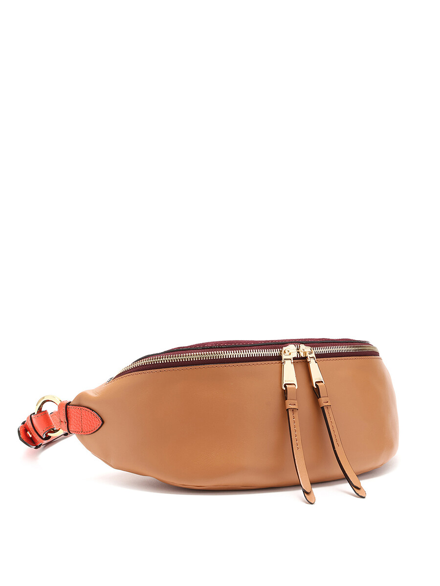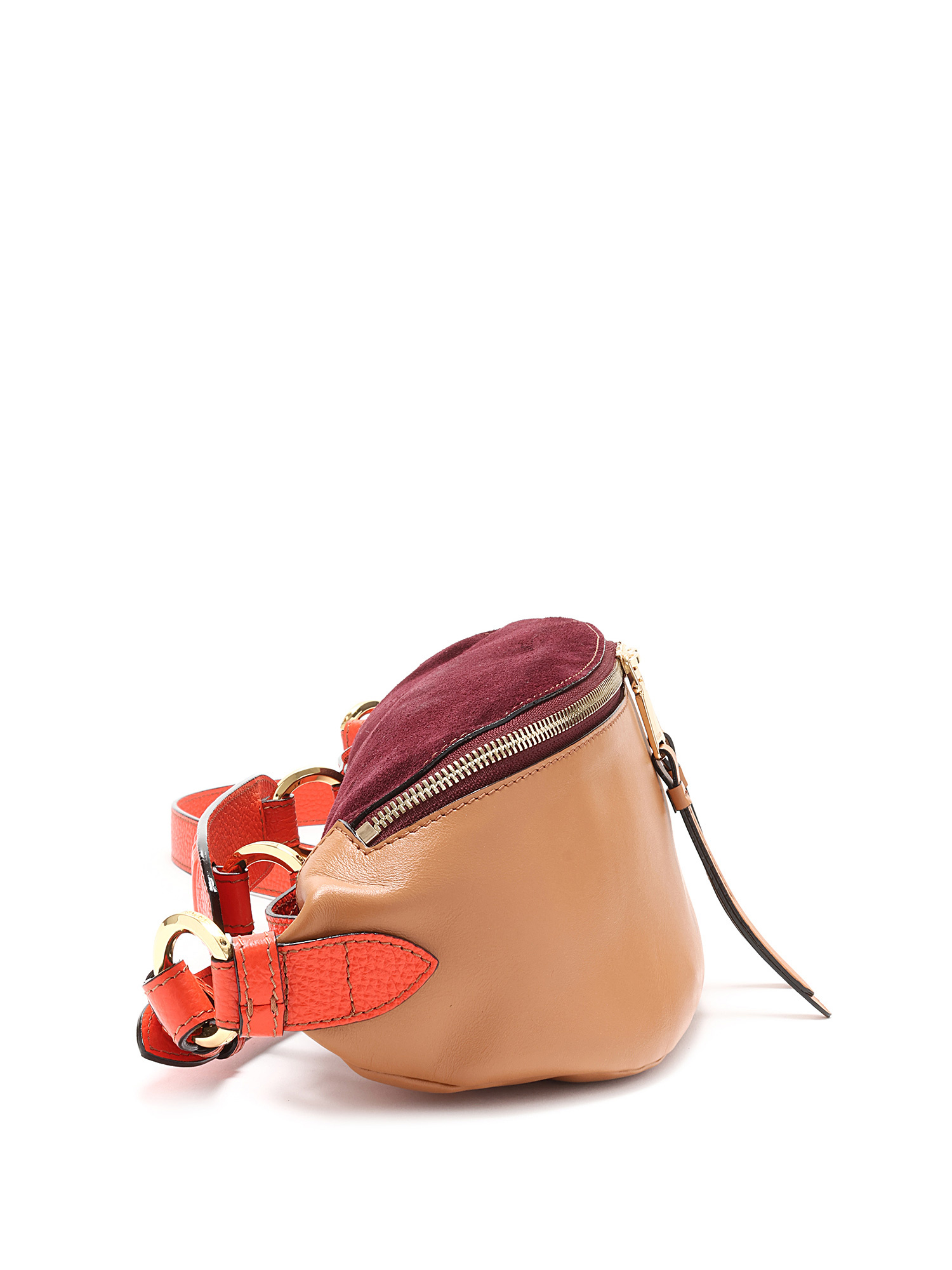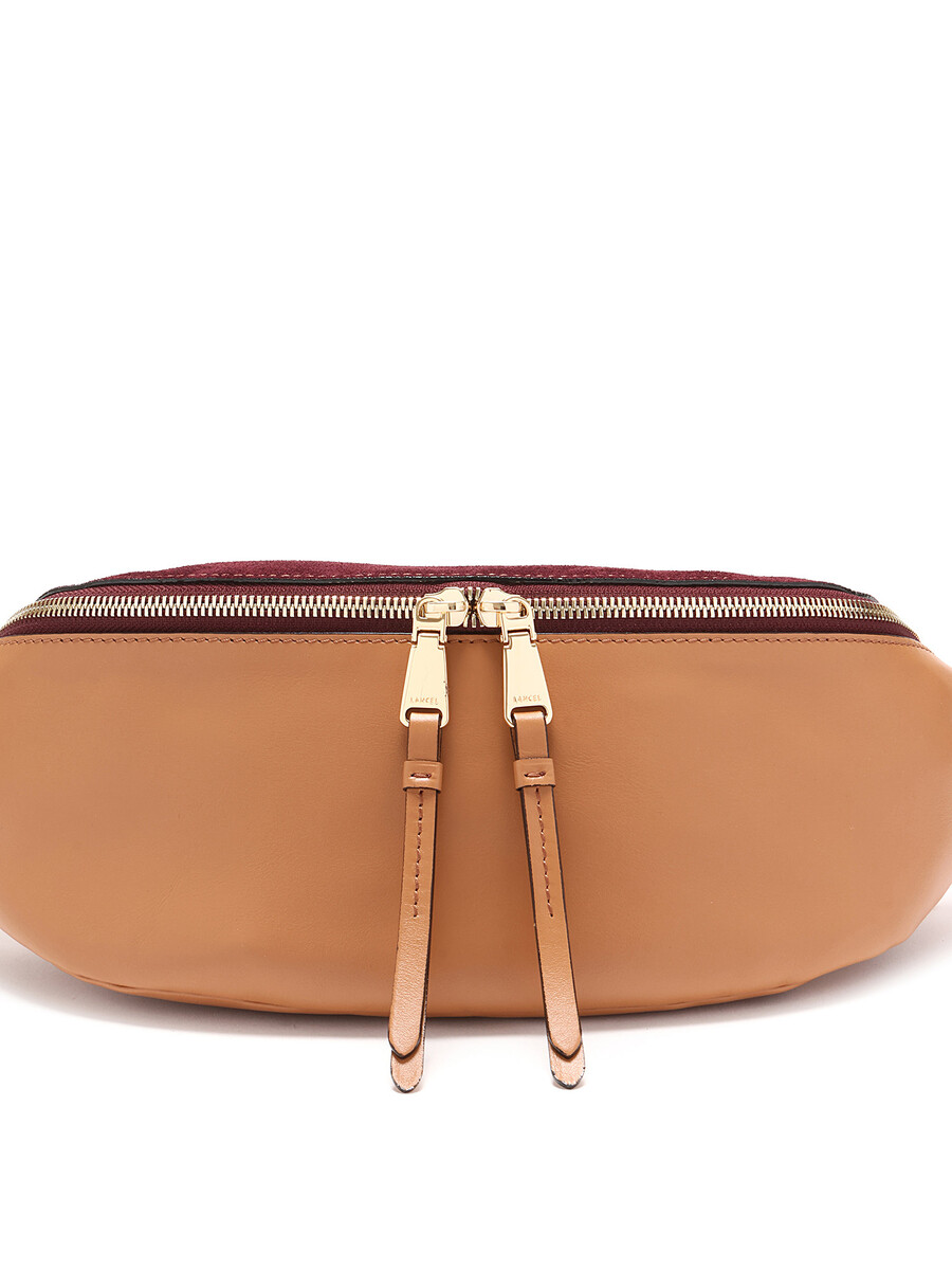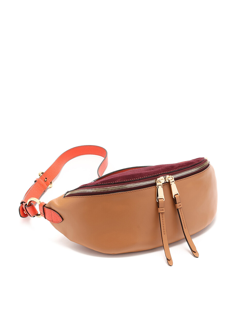 Leather and suede belt bag with a rich burgundy suede flap and tan body. Features a zipper closure, adjustable orange leather strap, and gold-tone hardware. Comes with a dust bag.