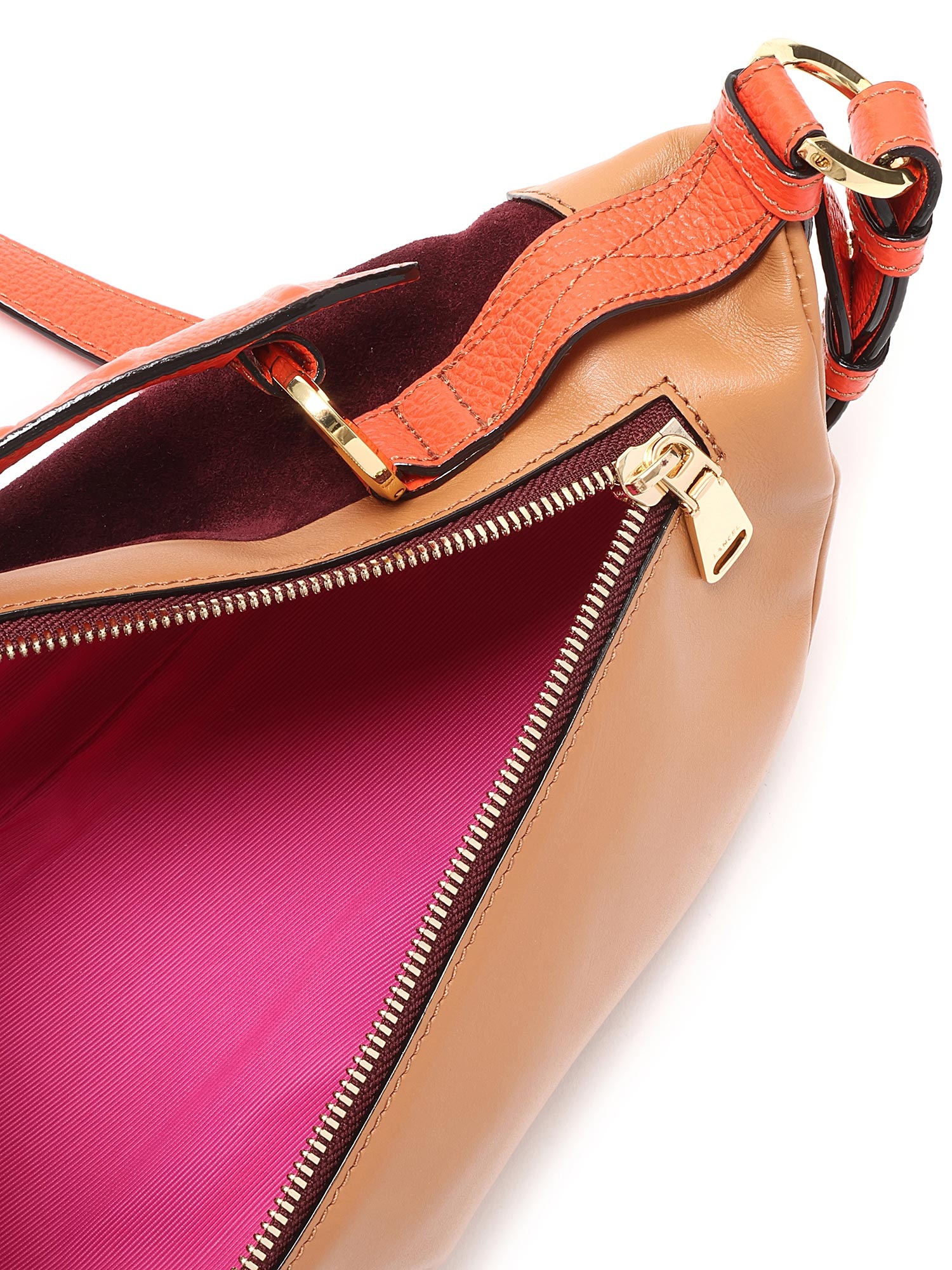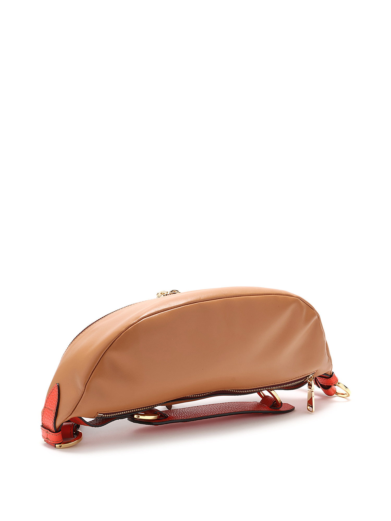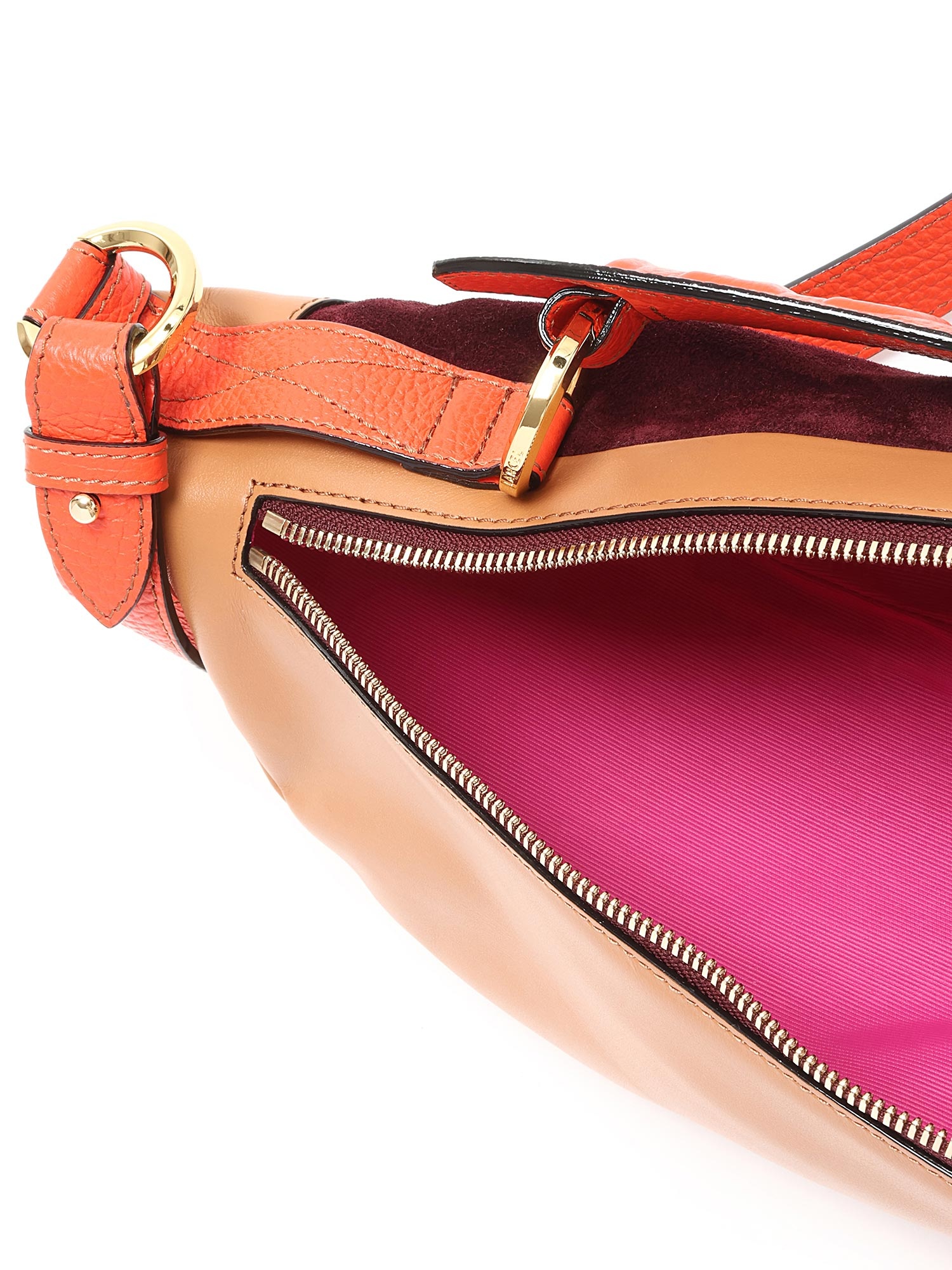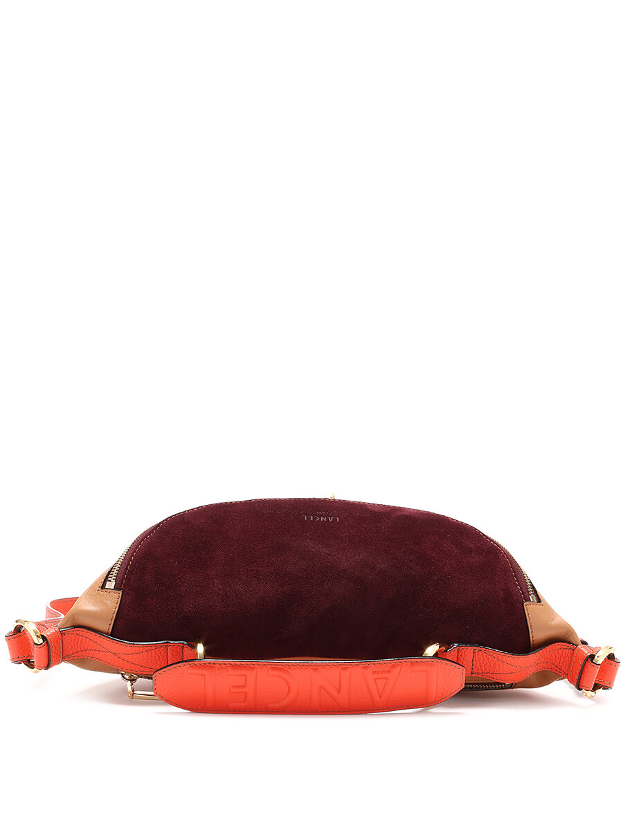 Leather and suede belt bag with a rich burgundy suede flap and tan body. Features a zipper closure, adjustable orange leather strap, and gold-tone hardware. Comes with a dust bag.