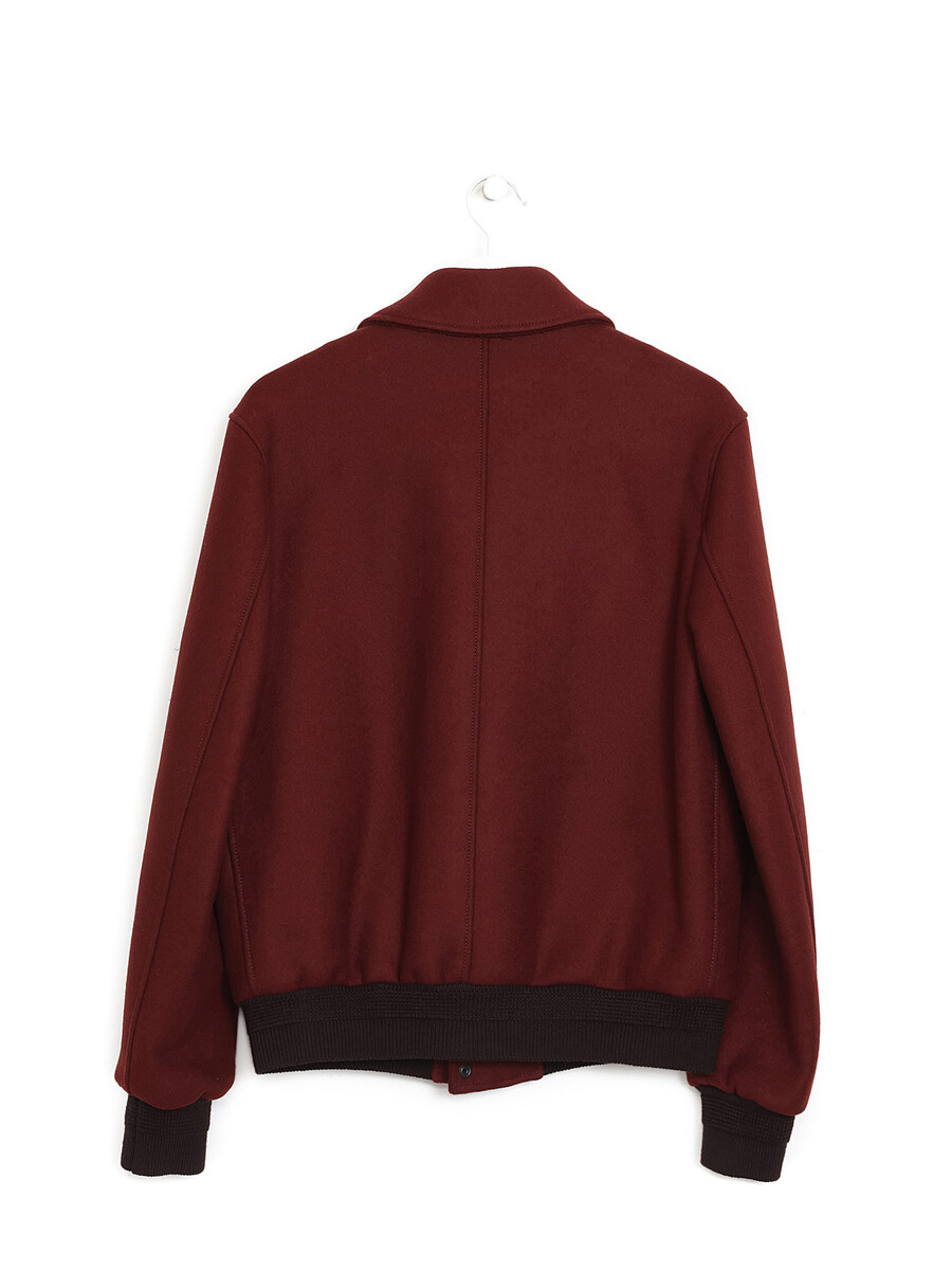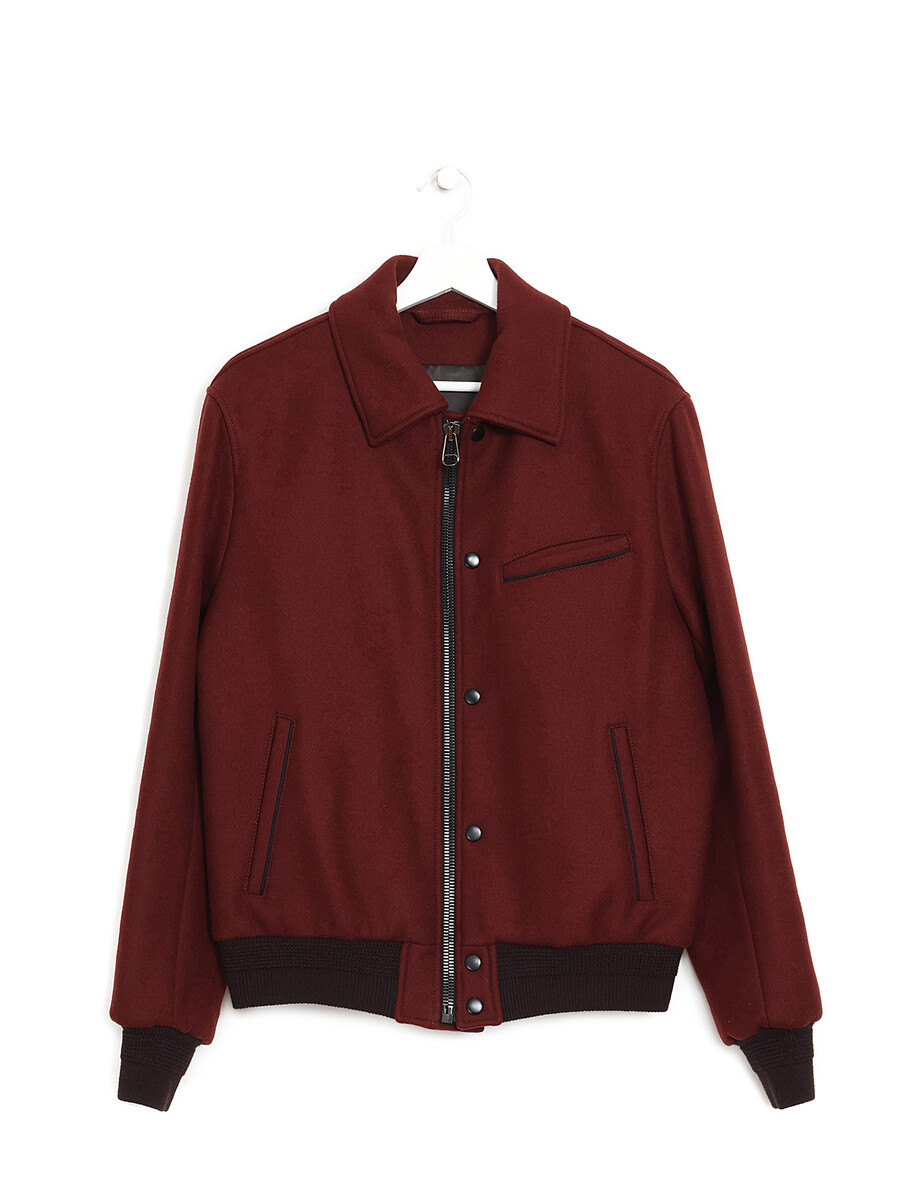 Rust-colored wool coat with long sleeves. Front zipper closure. Shirt collar style. Front welt pockets.