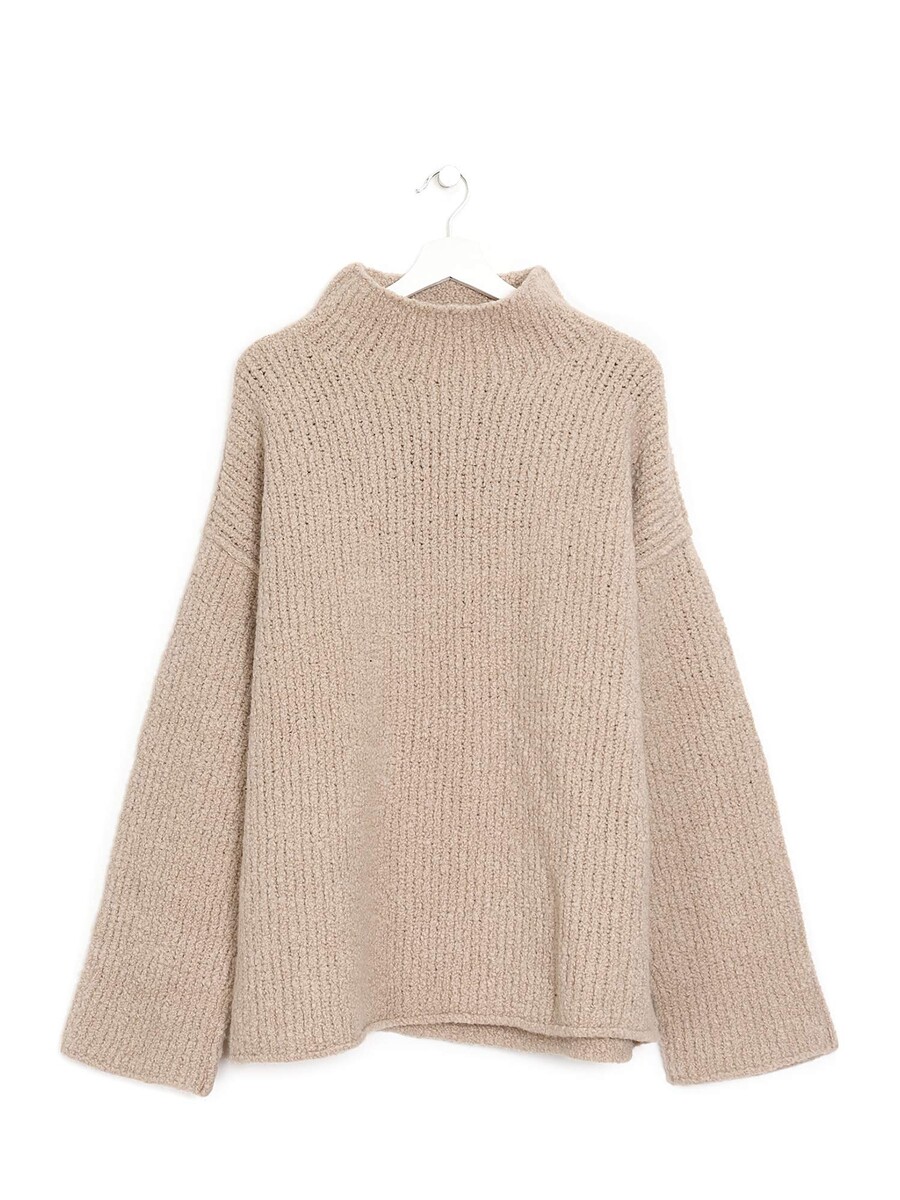 Long sleeve high-neck sweater in beige. Features a relaxed fit. Knit from