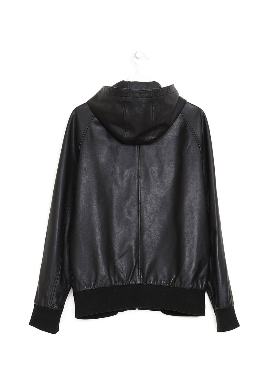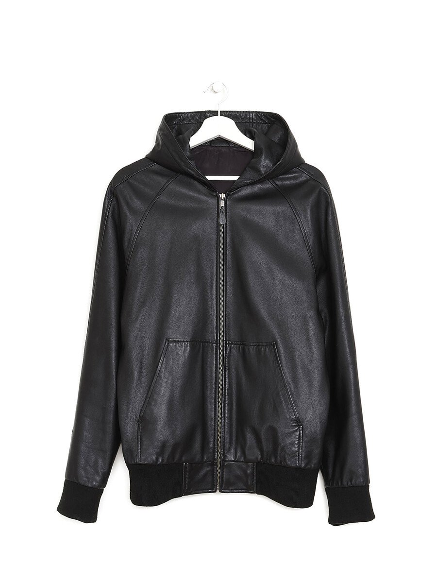 Black leather zip-up jacket with hood. Features front flap pockets and a black zipper closure. Leather outer with fabric lining.