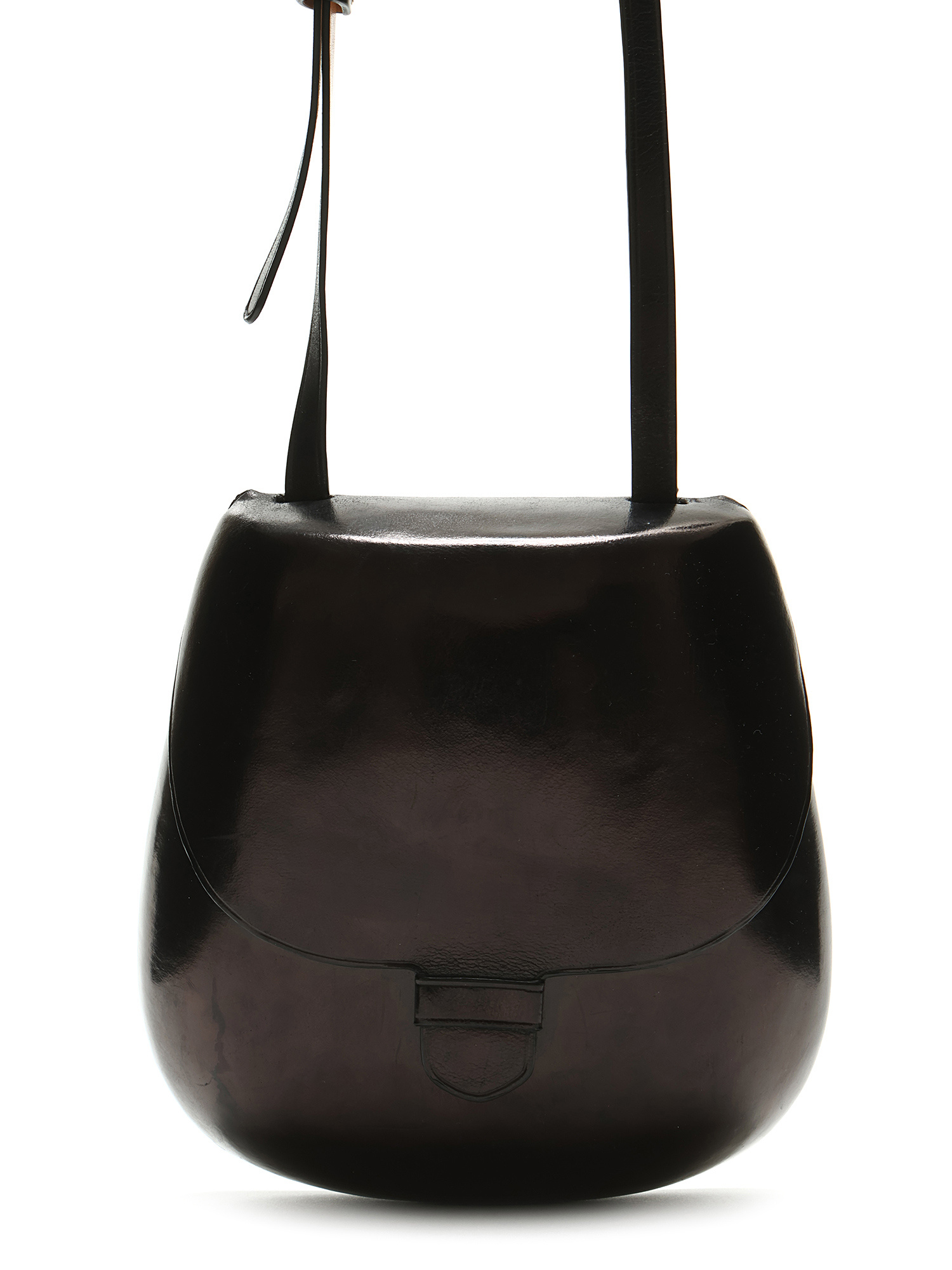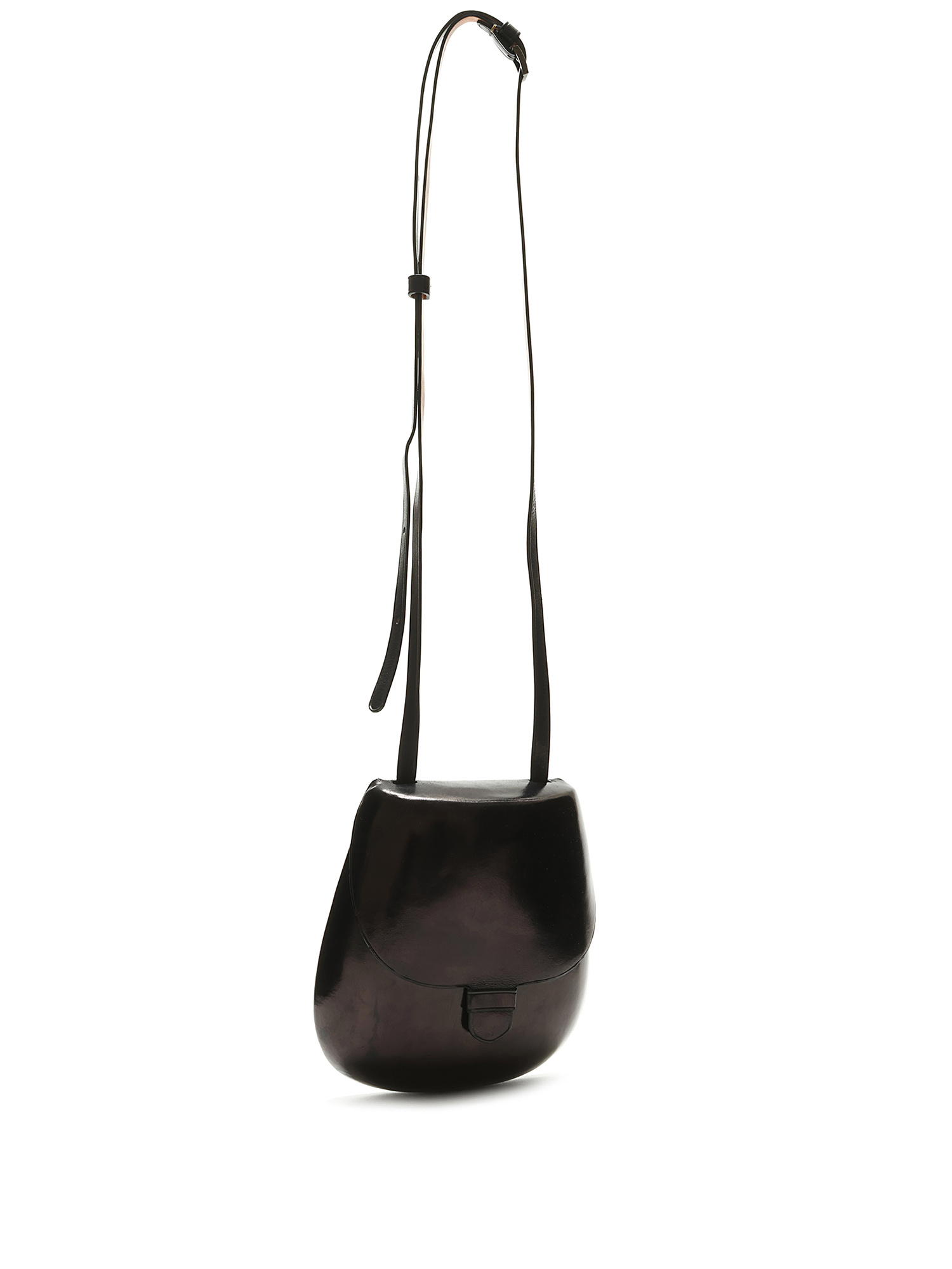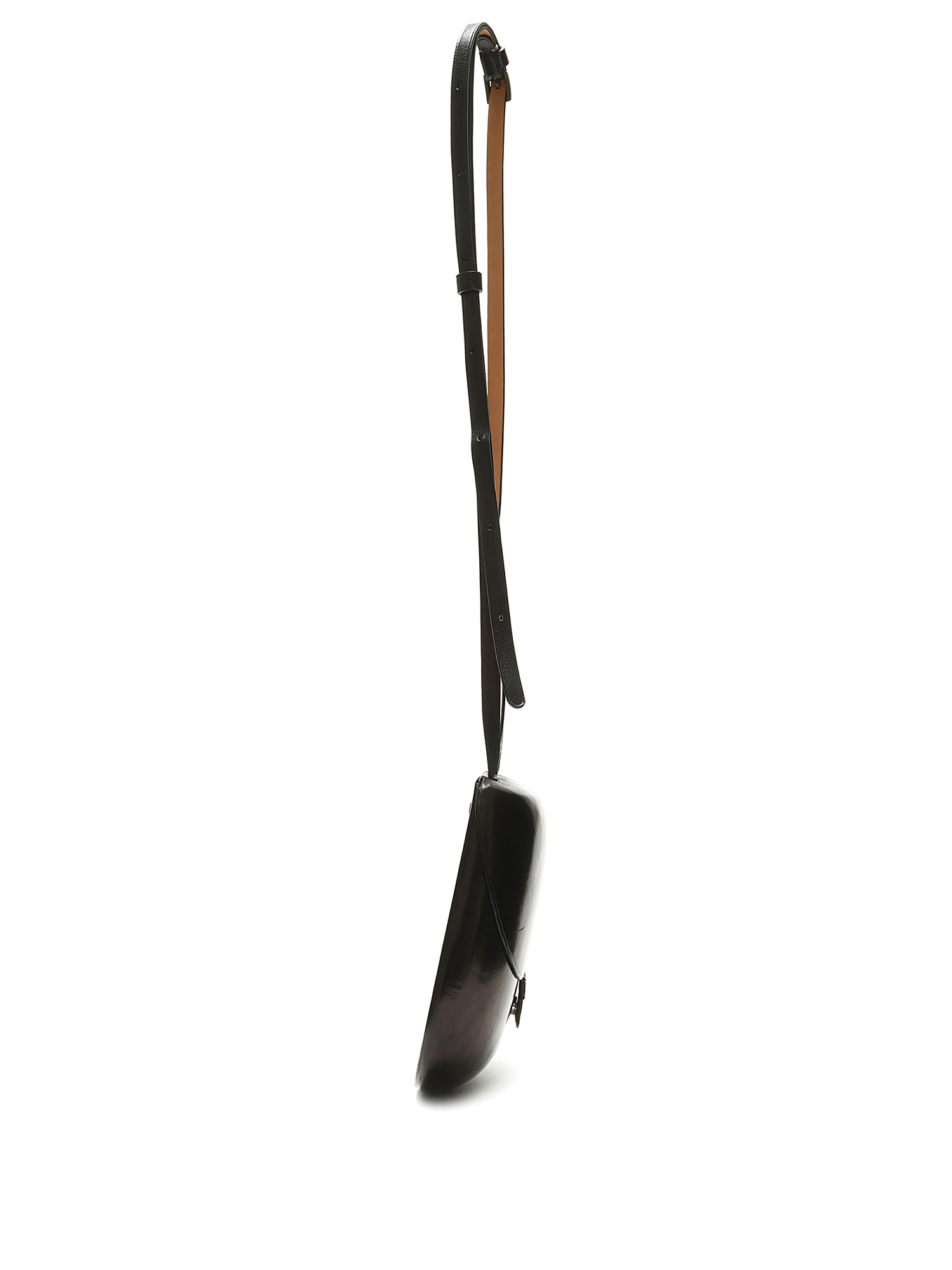 Box-shaped leather handbag in black. Buckle closure. Leather shoulder strap. Silver-tone hardware. With box and dust bag.