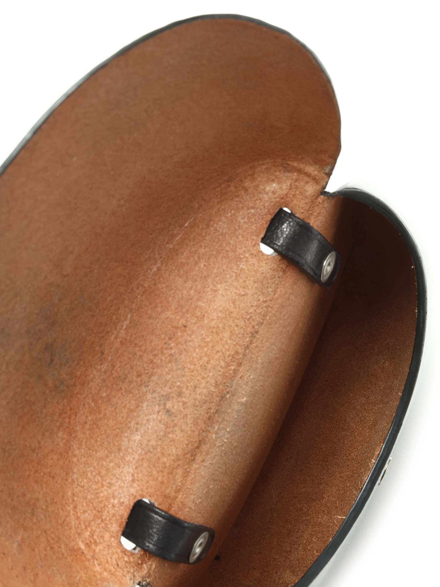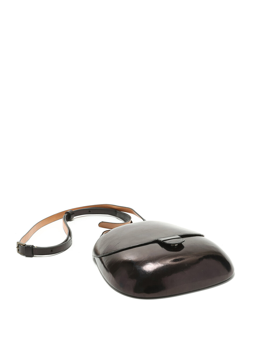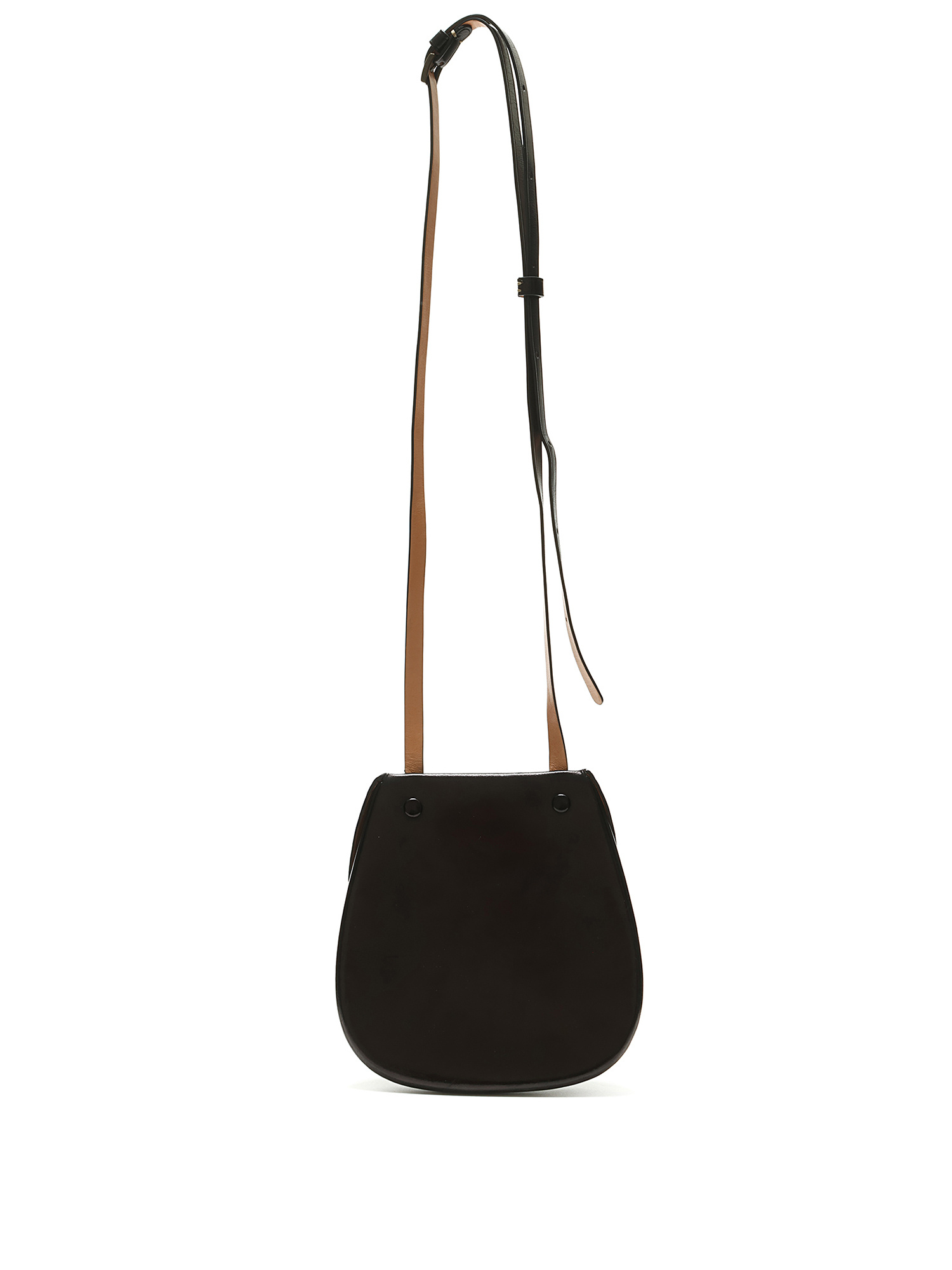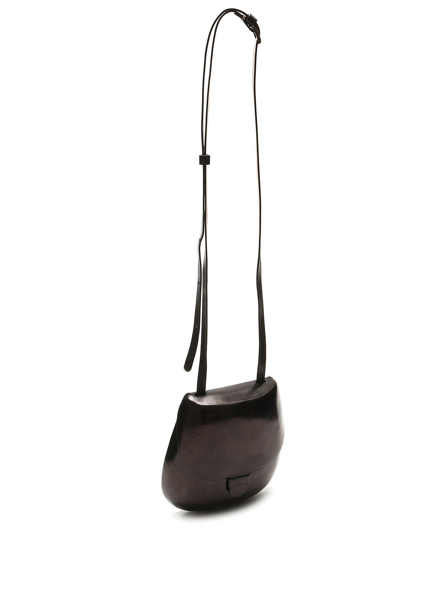 Box-shaped leather handbag in black. Buckle closure. Leather shoulder strap. Silver-tone hardware. With box and dust bag.