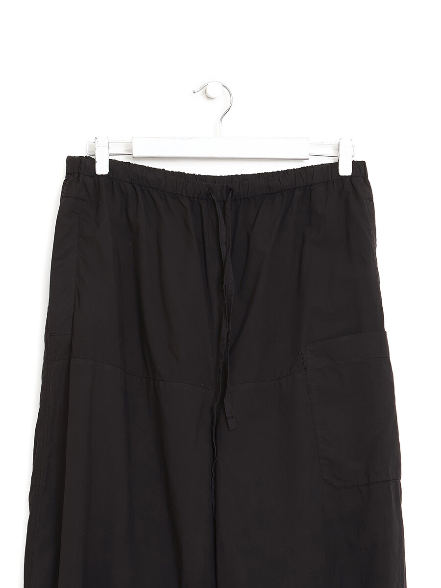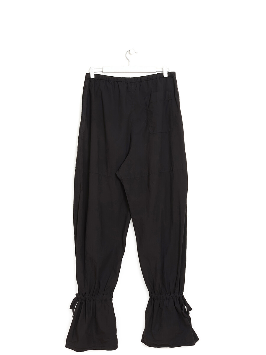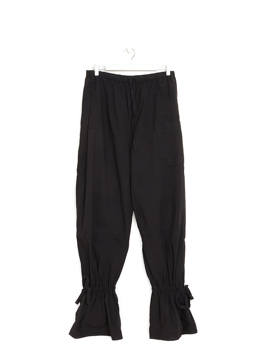Straight leg pants in black featuring self-tie strap at hem. Adjustable drawstring at waist for a comfortable fit.