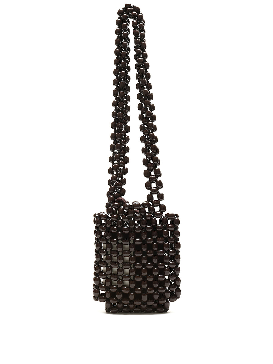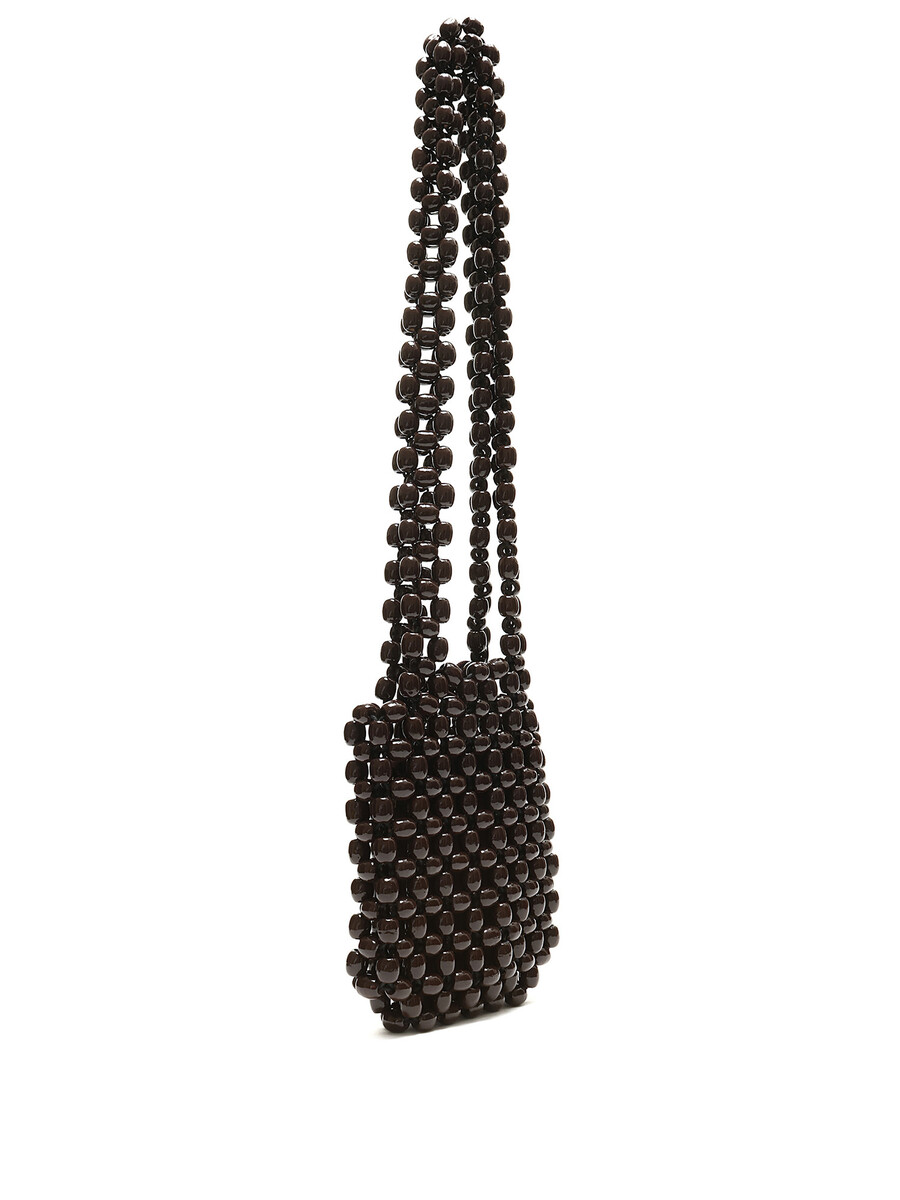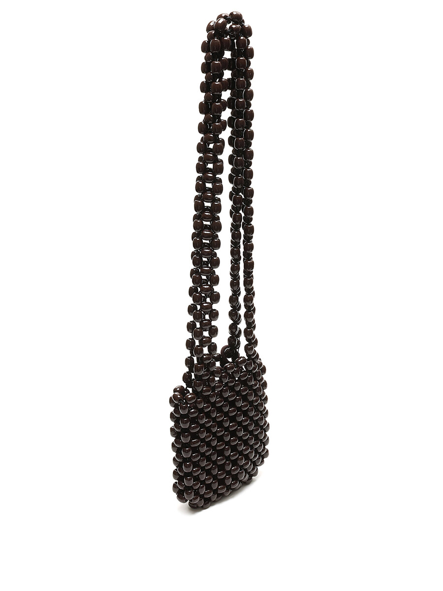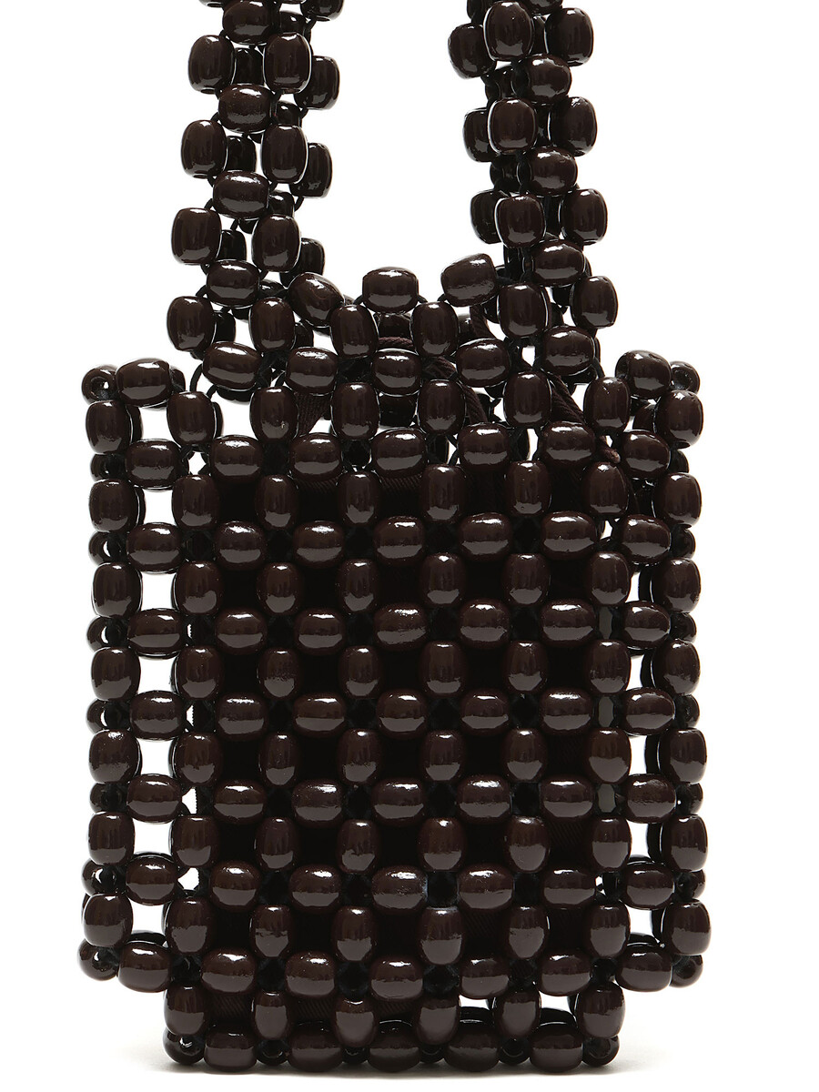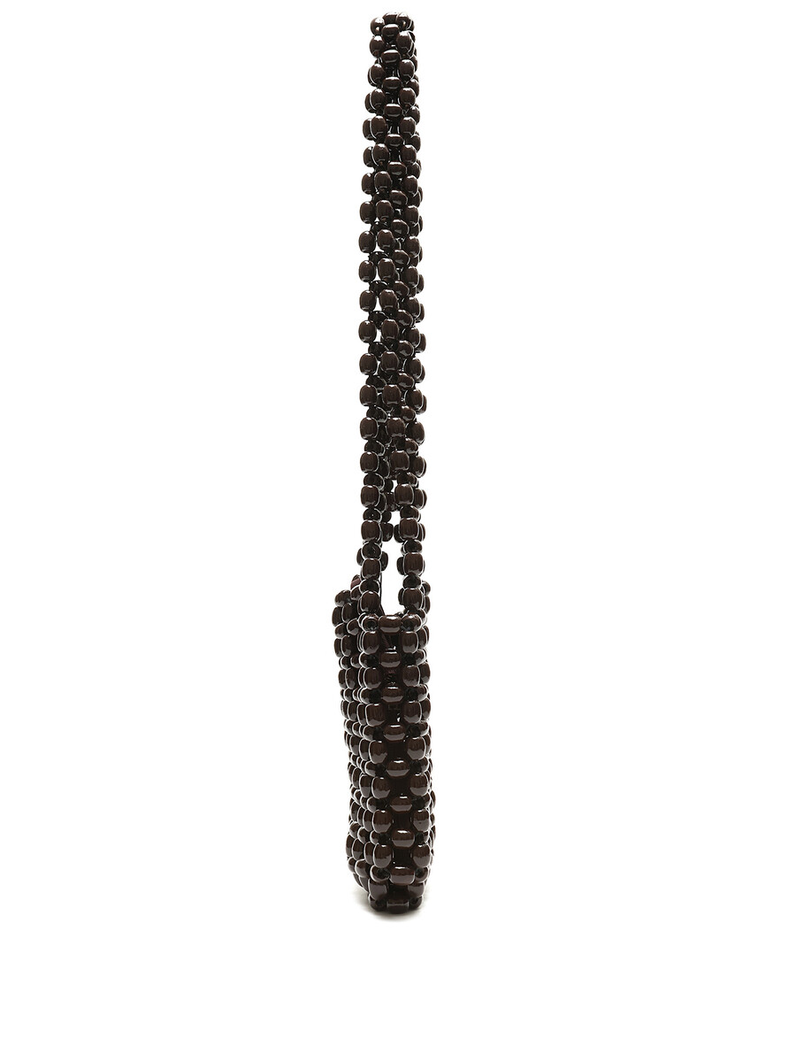 Dark brown woven beaded shoulder bag. Top opening. Beaded straps. Fabric edges. Removable pouch. Comes with a dustbag.