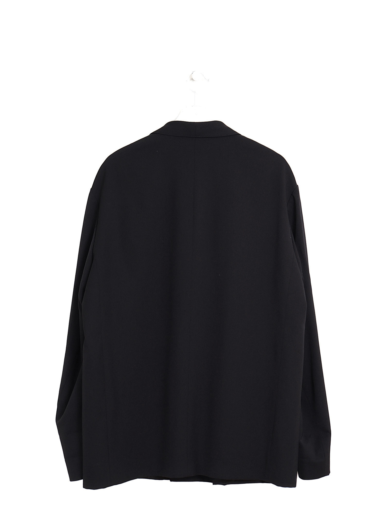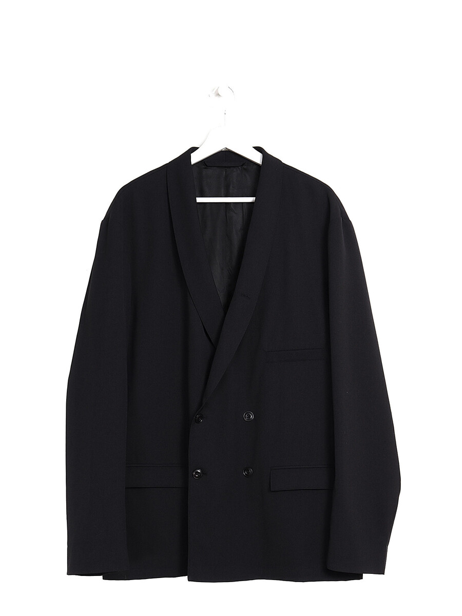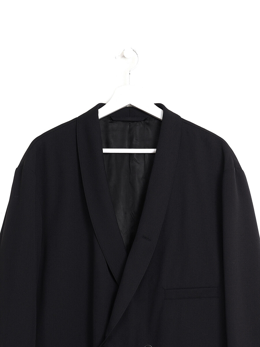 Midnight blue double-breasted serge blazer. Tone-on-tone buttonhole at front. Shawl collar lapels. Three welt pockets.