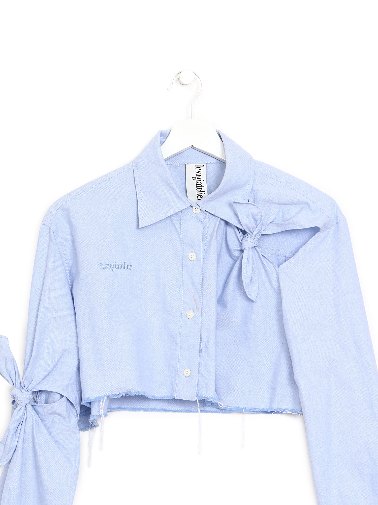 Cropped blue shirt featuring a classic collar and button-down closure. Gathering and cutouts at shoulder and sleeve.
