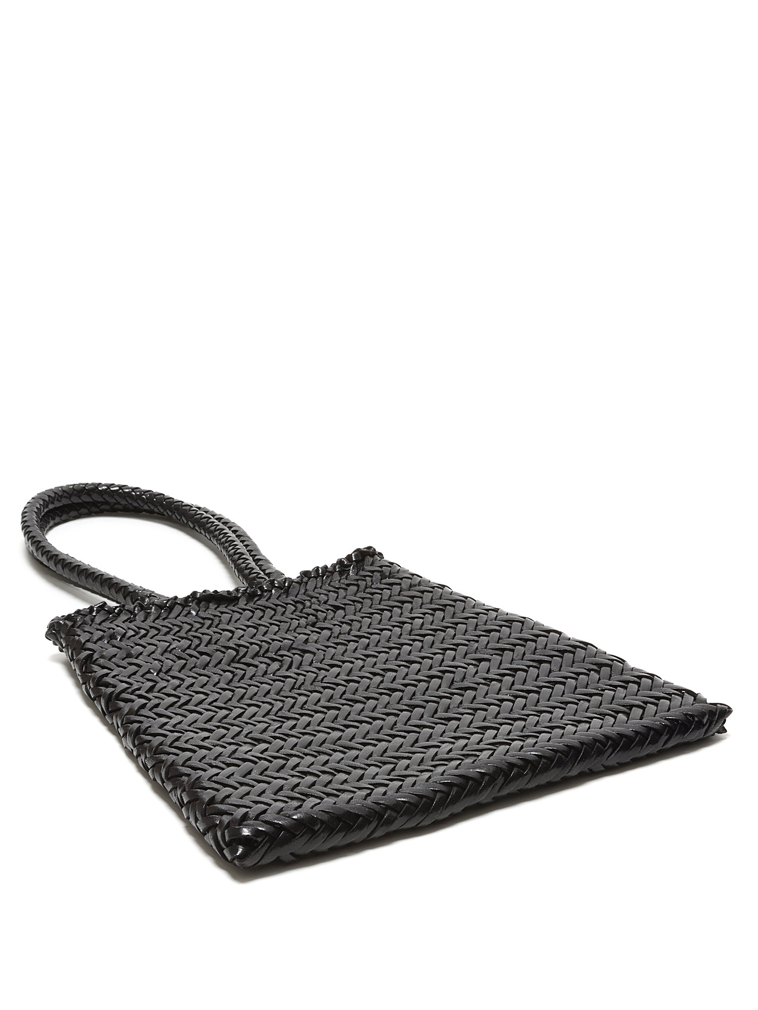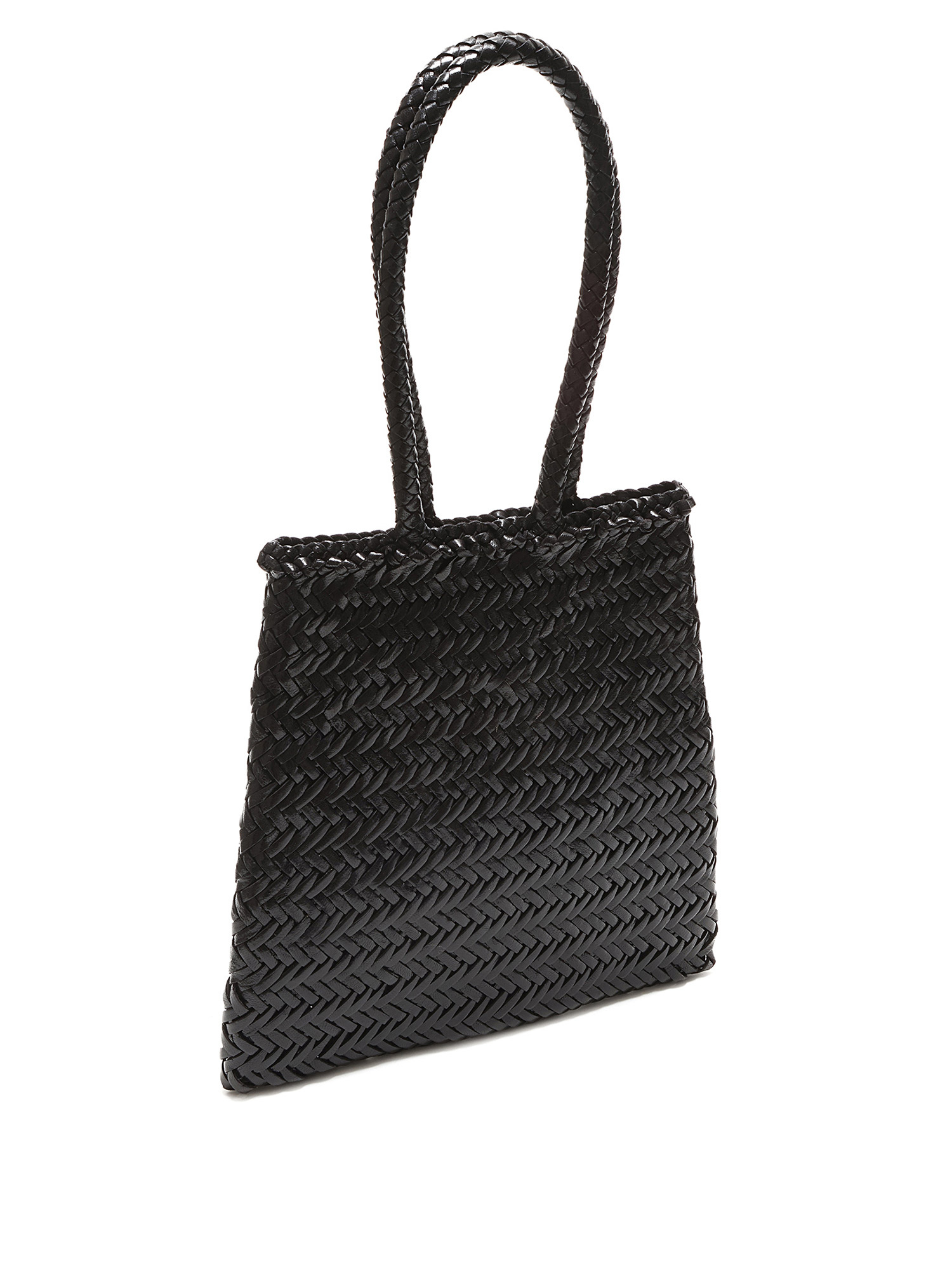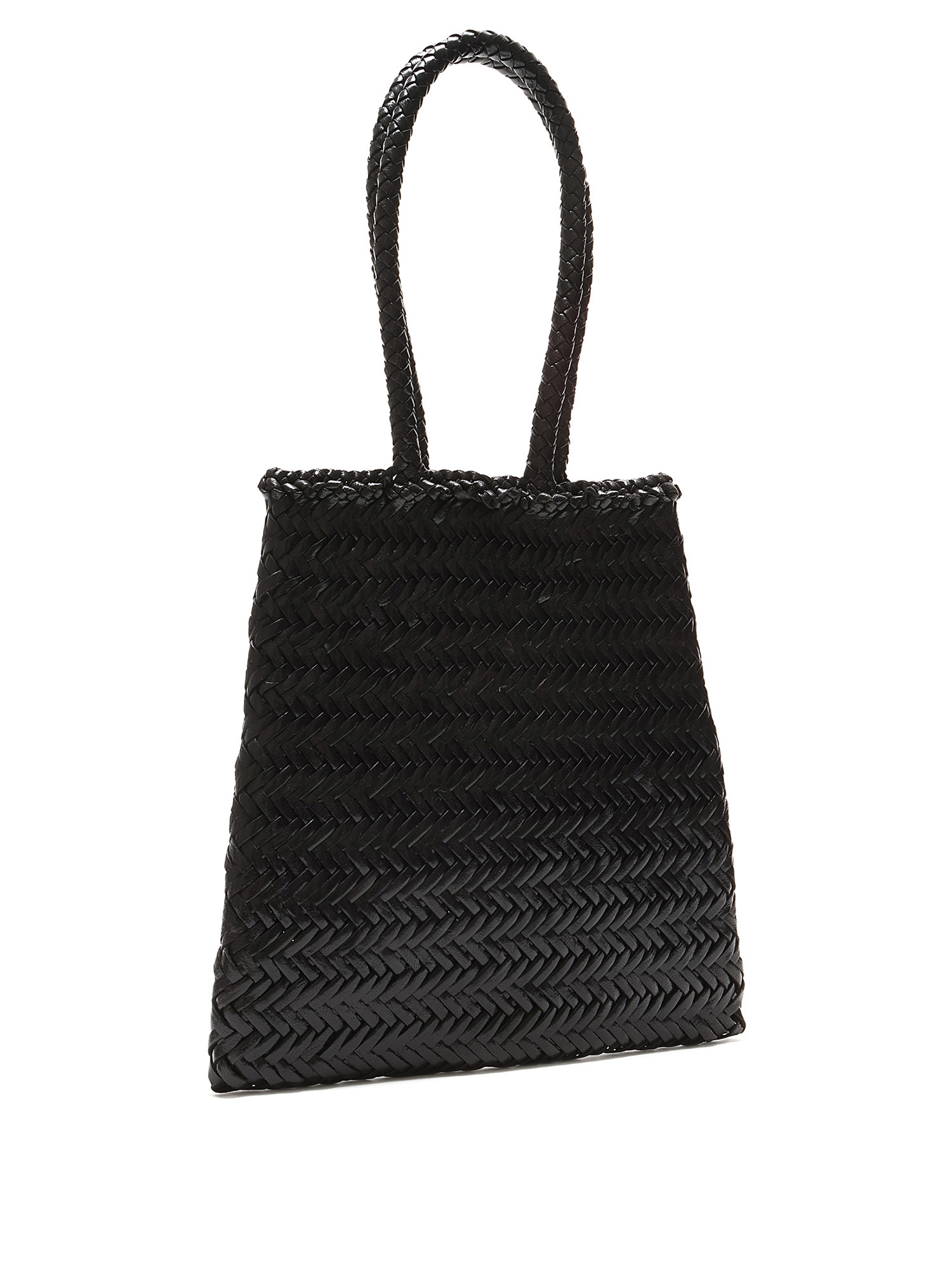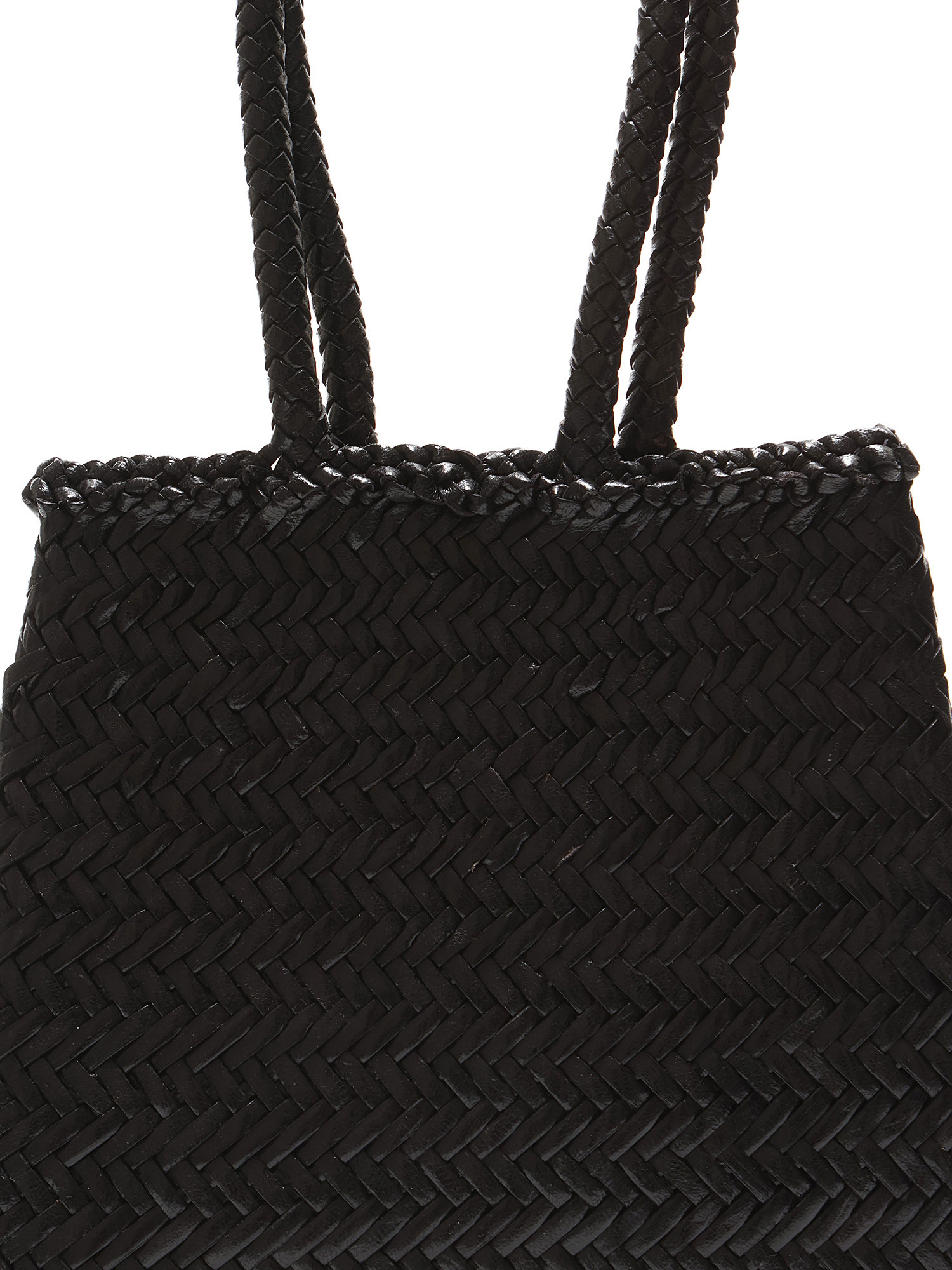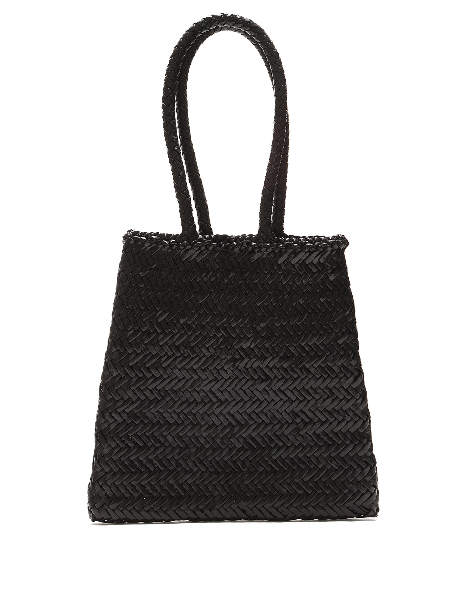 Black woven tote bag with a herringbone weave pattern. Open top design. Double woven handles for comfortable carry. Tonal stitching throughout.