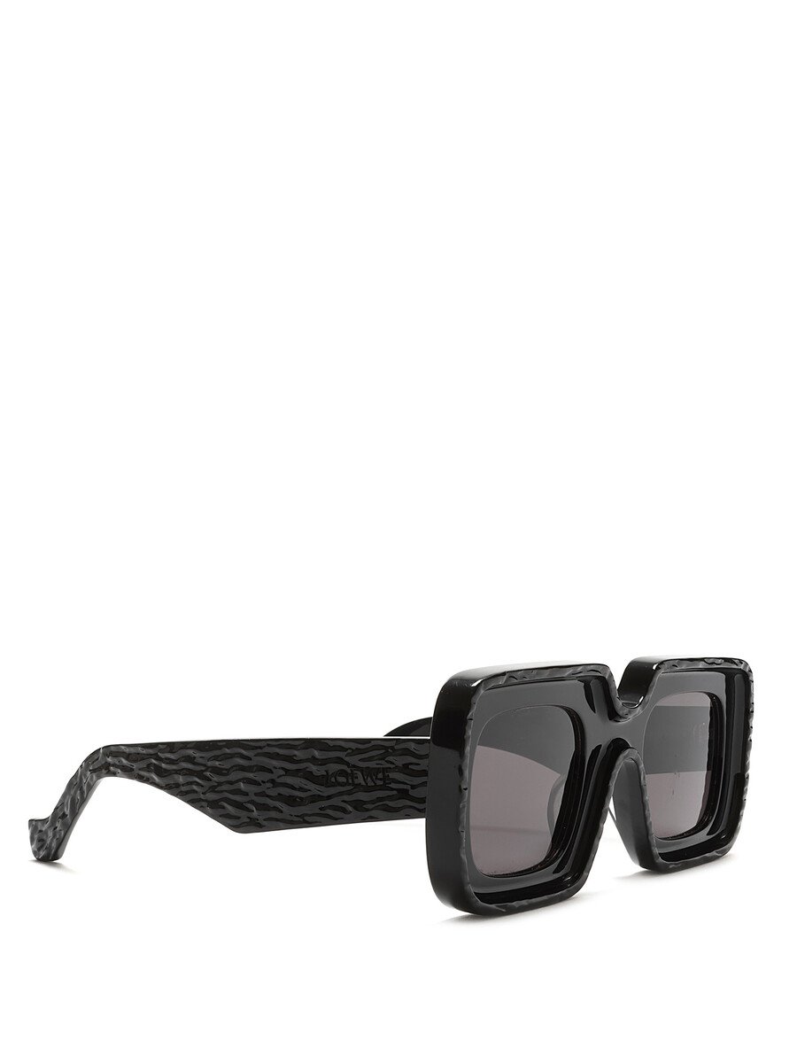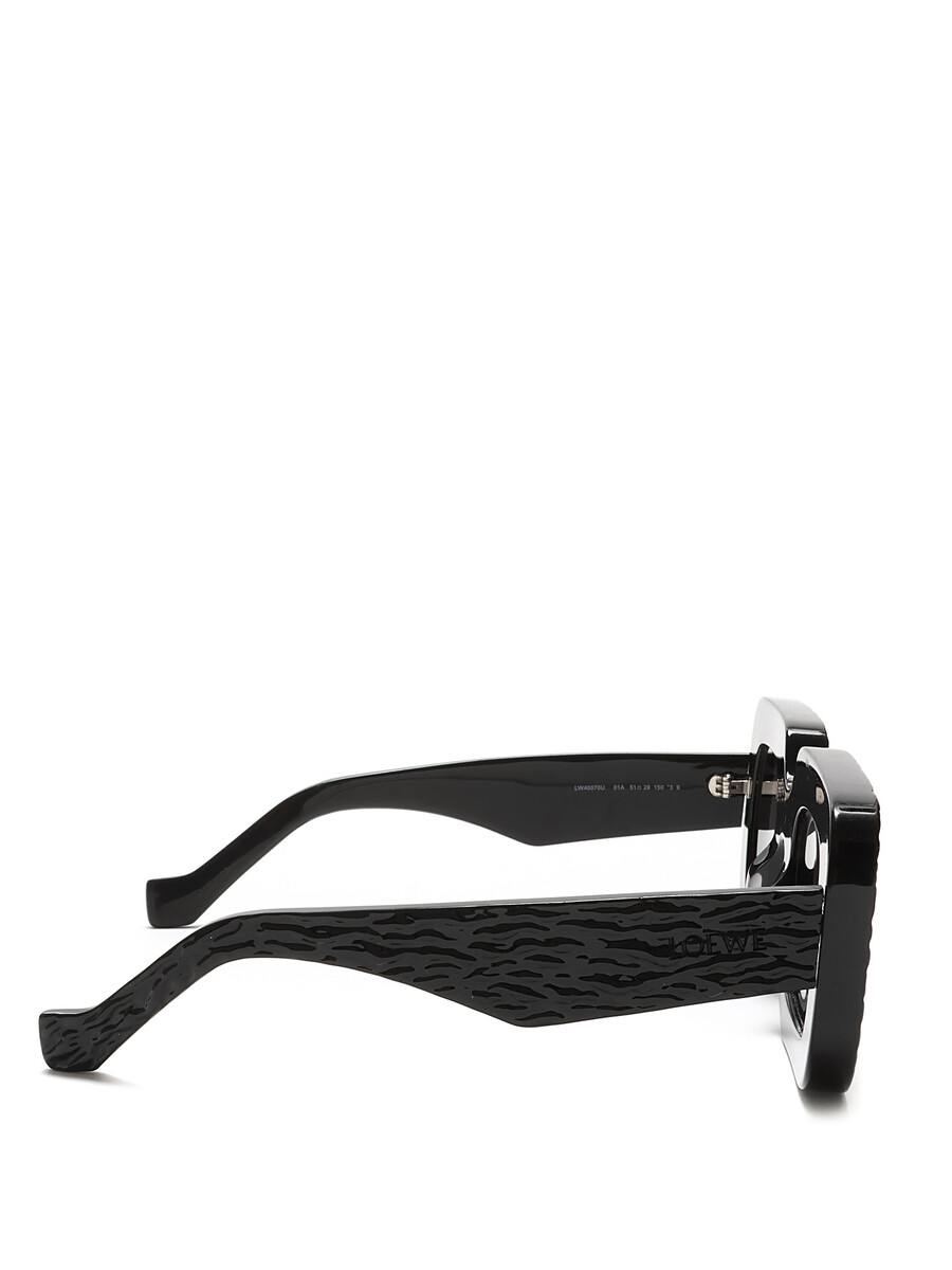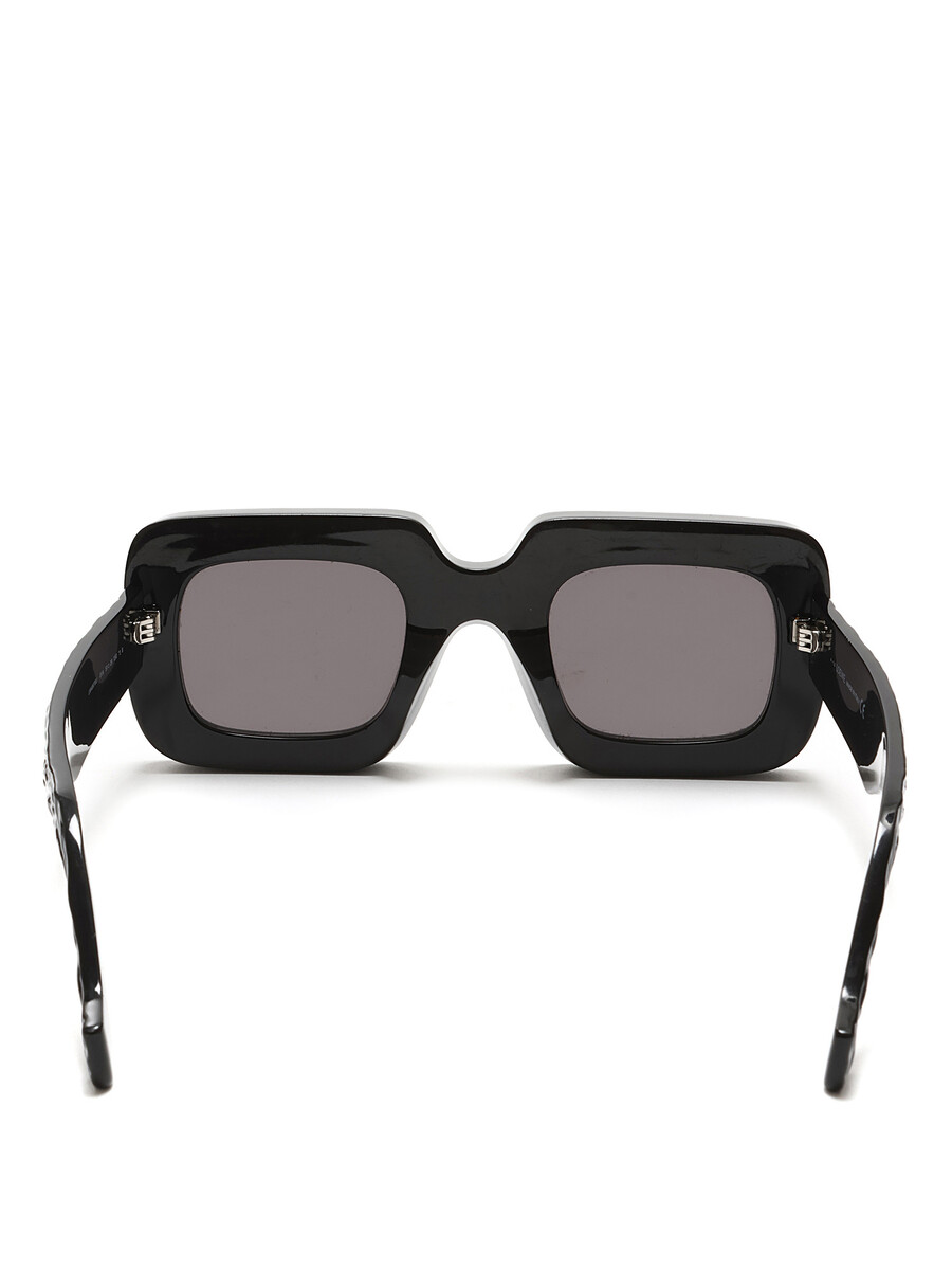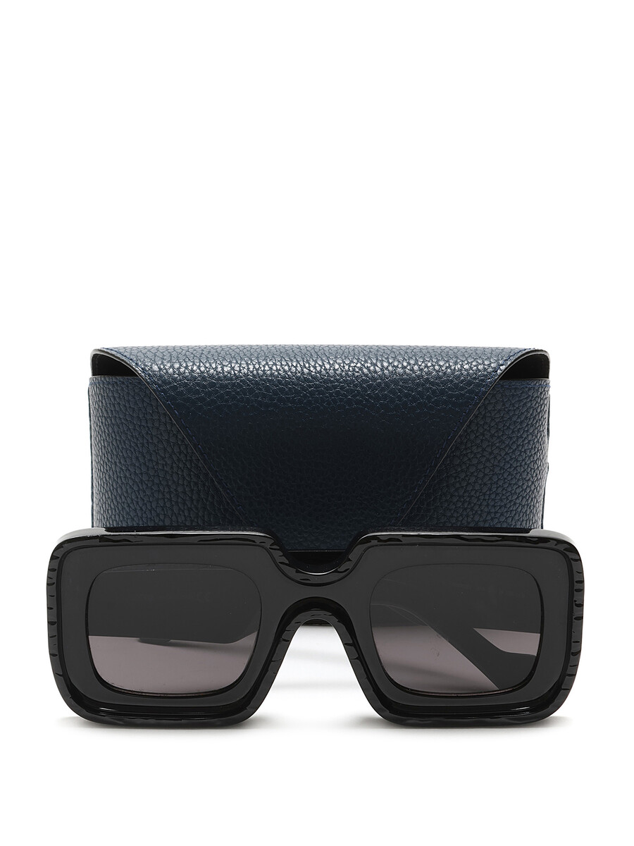 Rectangular sunglasses with textured temples in glossy black finish. Featuring UV protection lenses. With a protective case.