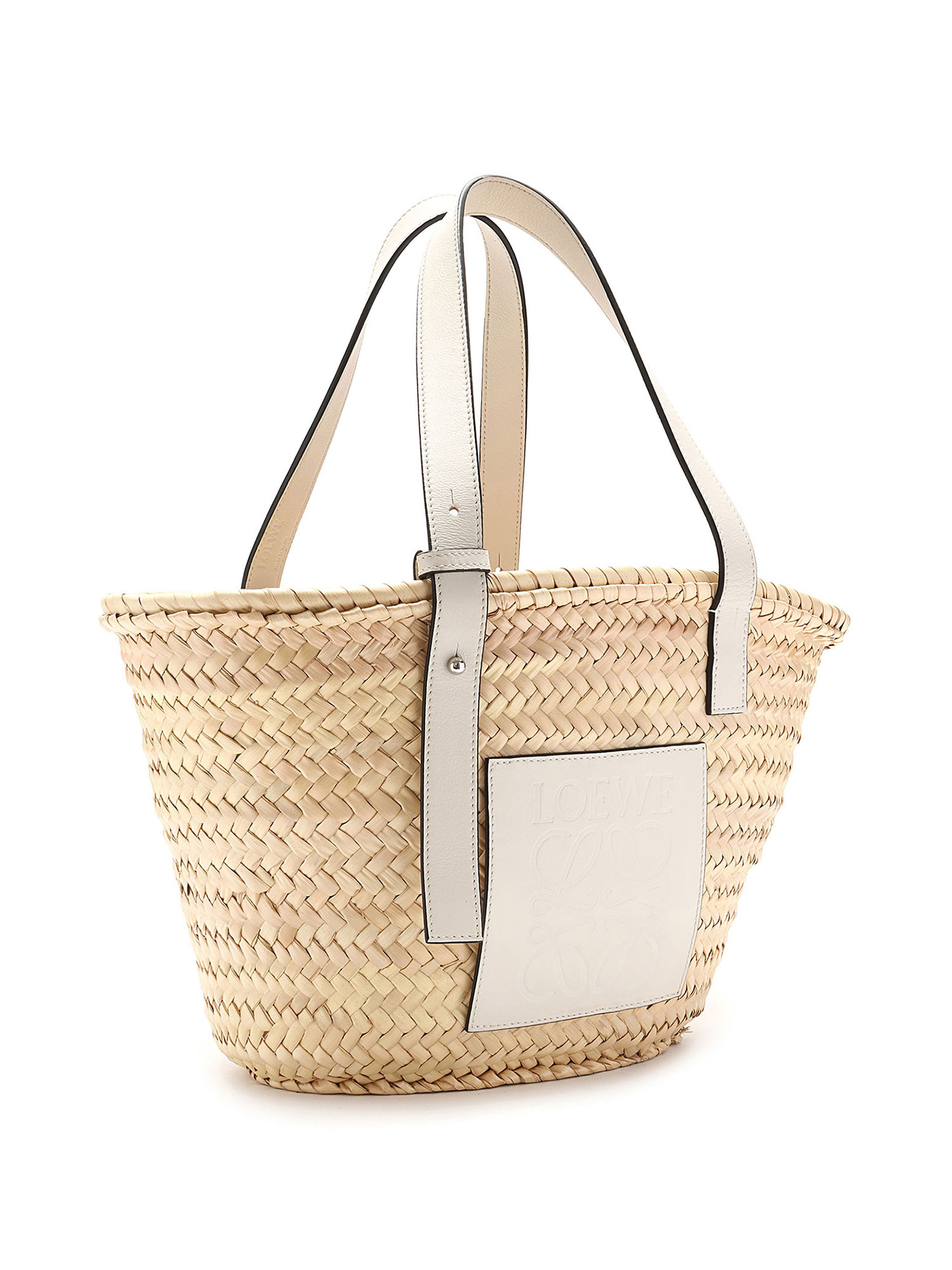Woven straw basket bag featuring an embossed logo patch on front, in taupe. White leather top handles.