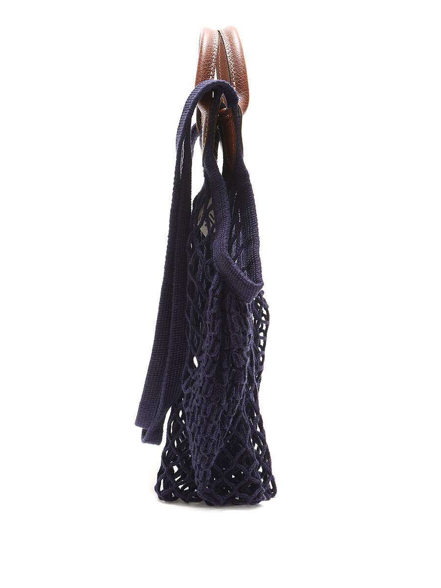 Navy blue and brown mesh tote bag with leather handles and leather finishes. Snap button closure. Brass hardware.