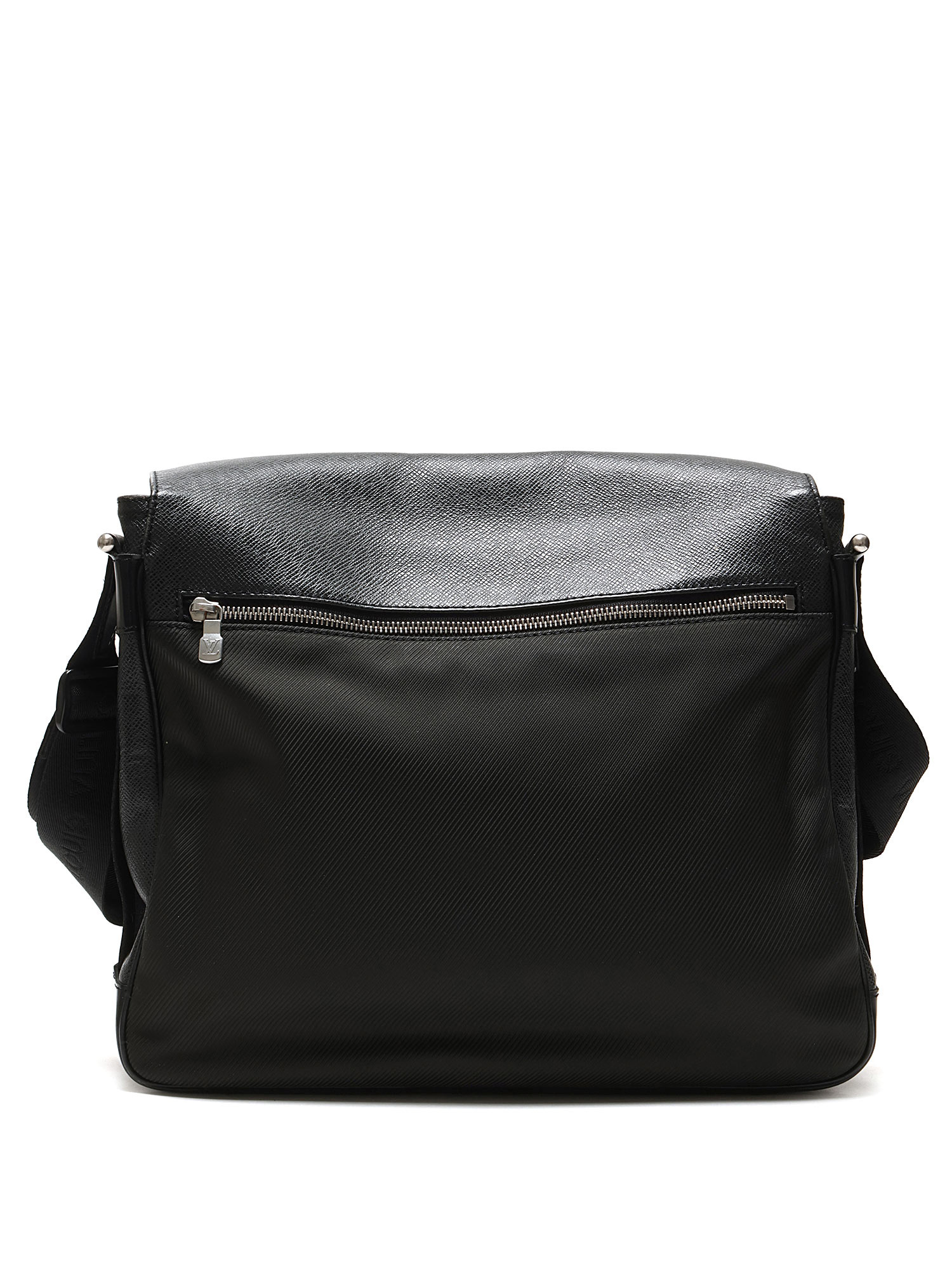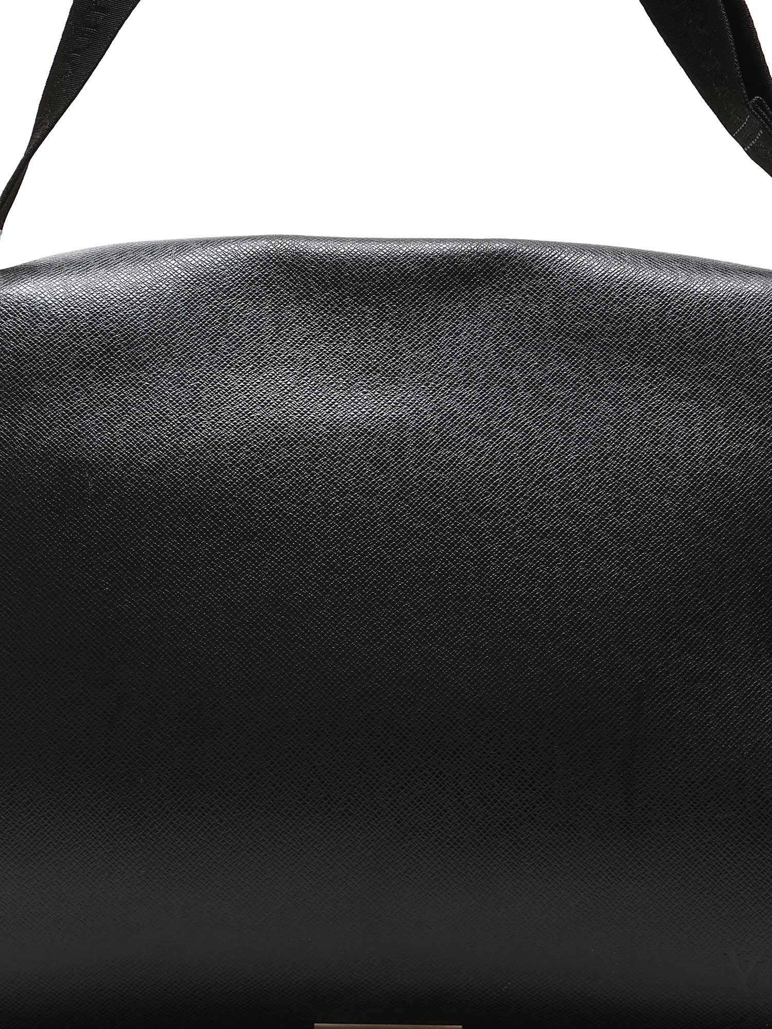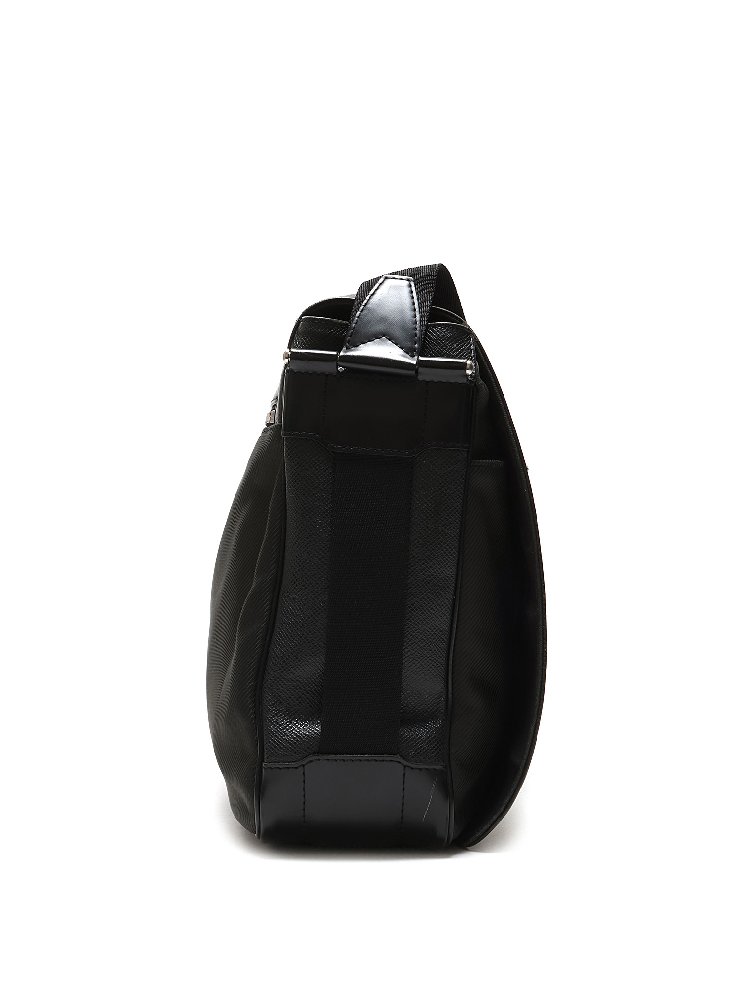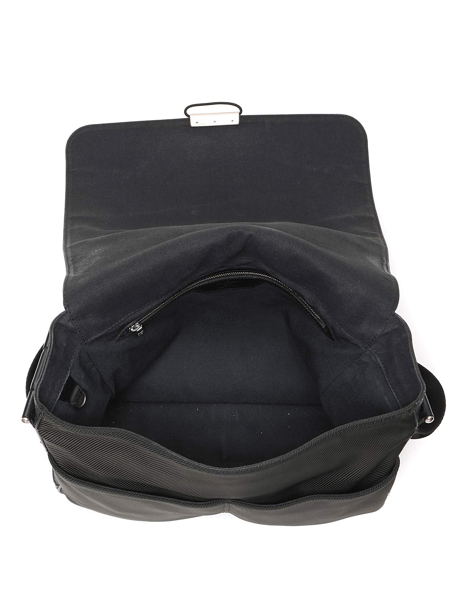 Textured canvas messenger bag in black. Silver-tone hardware with metallic clasp and zipper closure. Adjustable fabric strap. Comes with a dust bag.