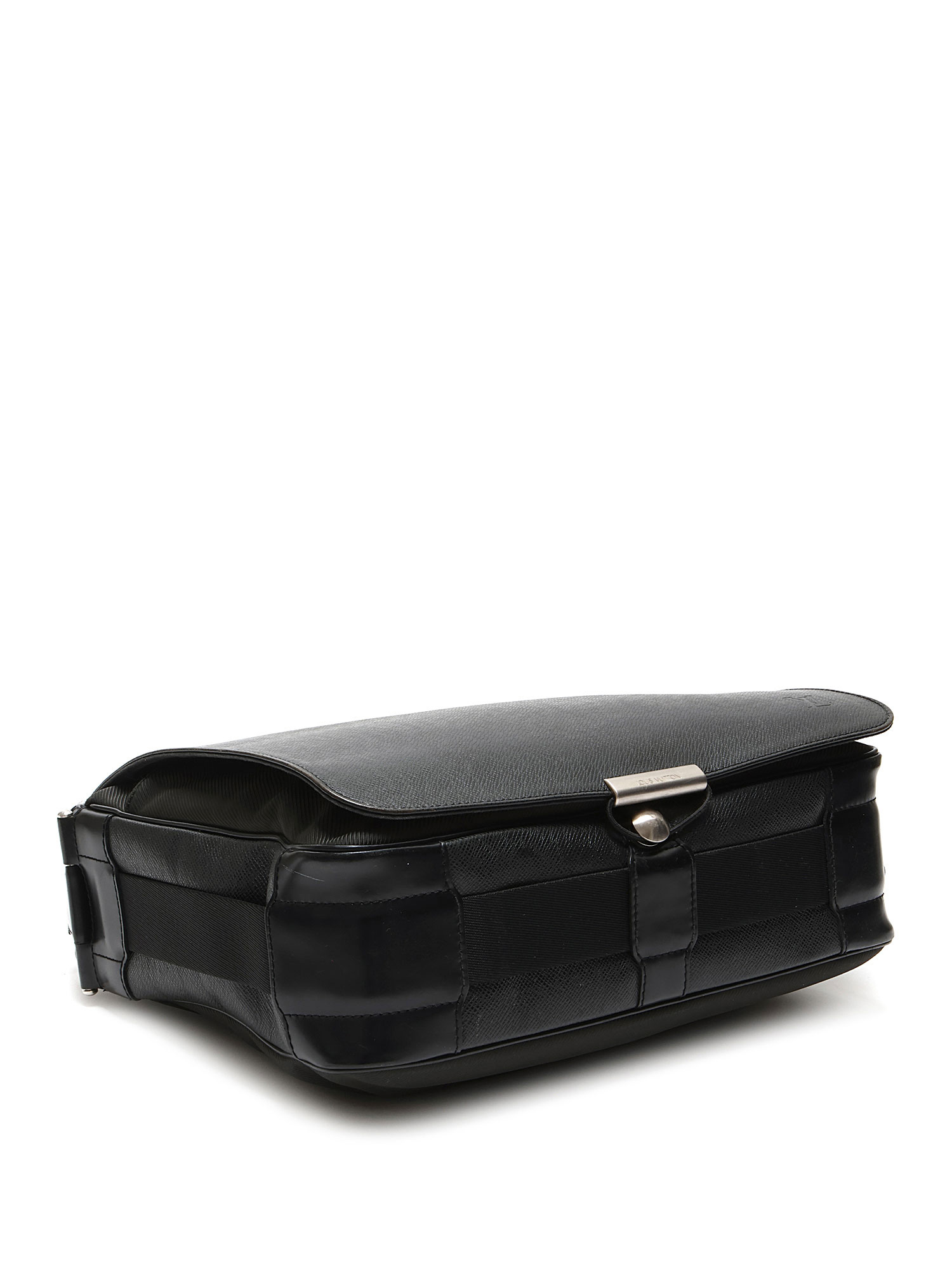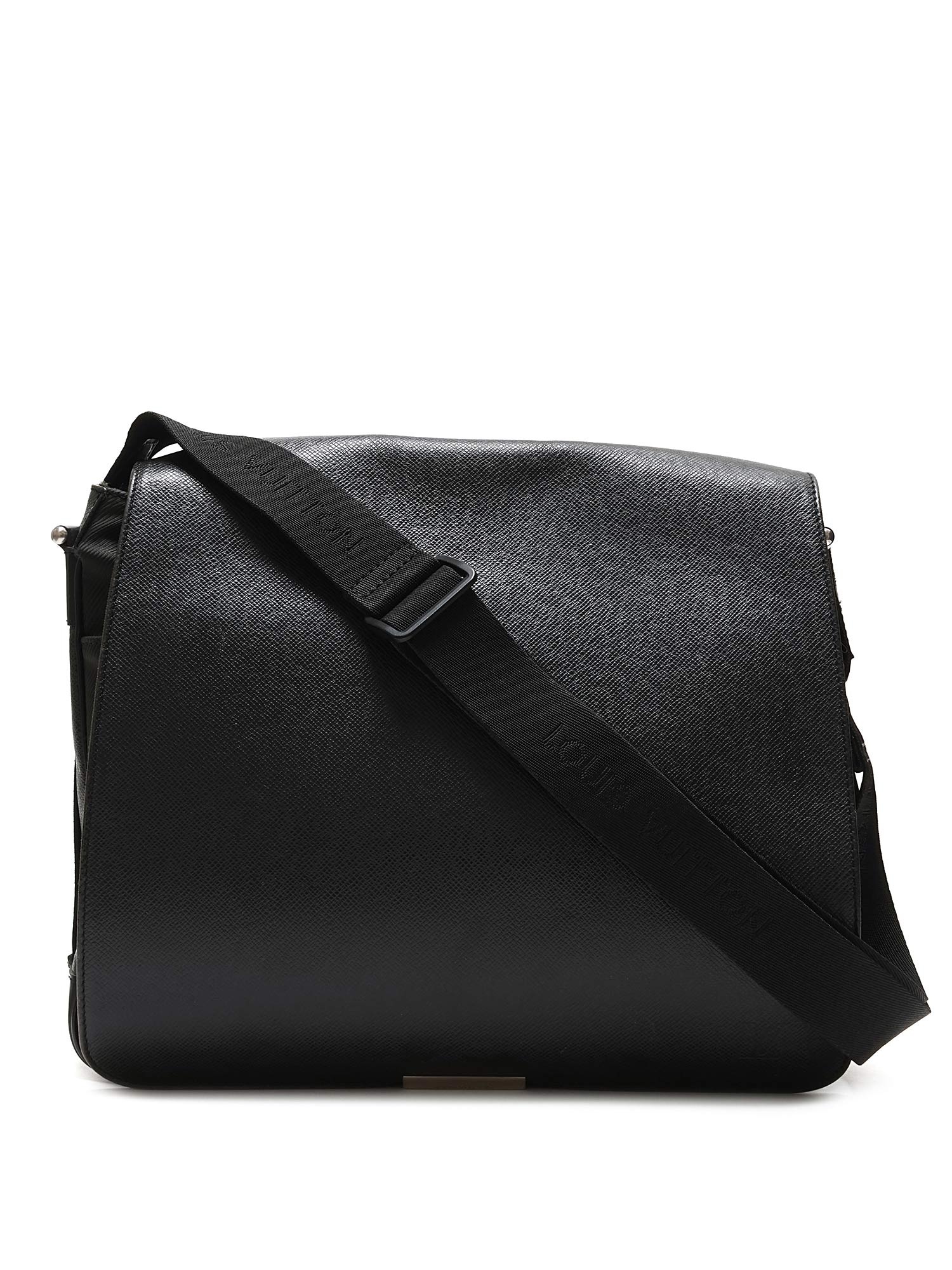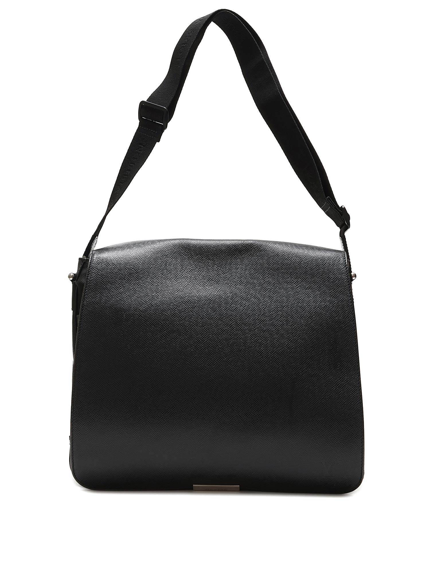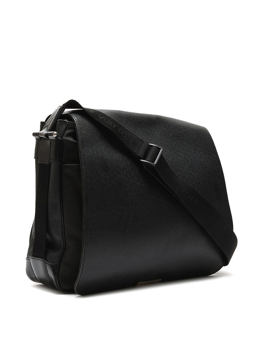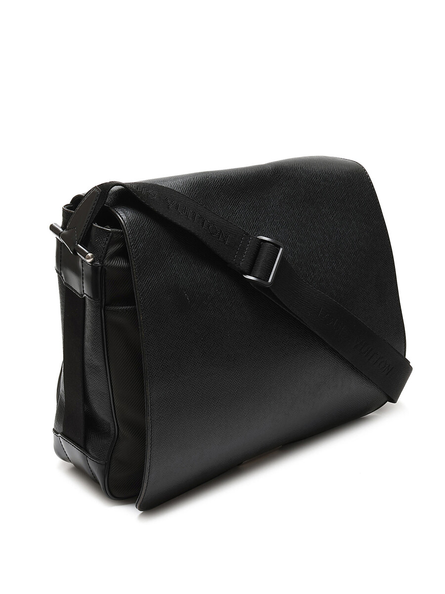 Textured canvas messenger bag in black. Silver-tone hardware with metallic clasp and zipper closure. Adjustable fabric strap. Comes with a dust bag.