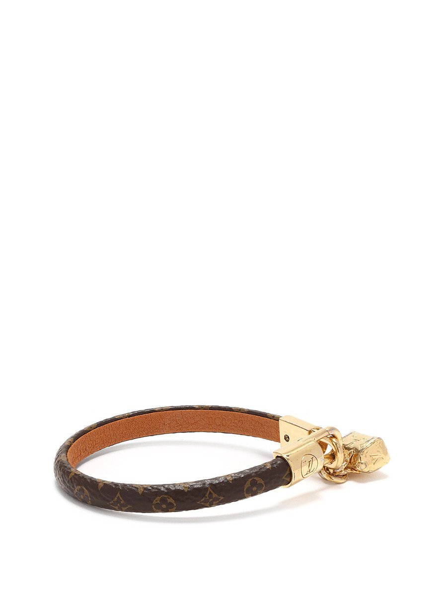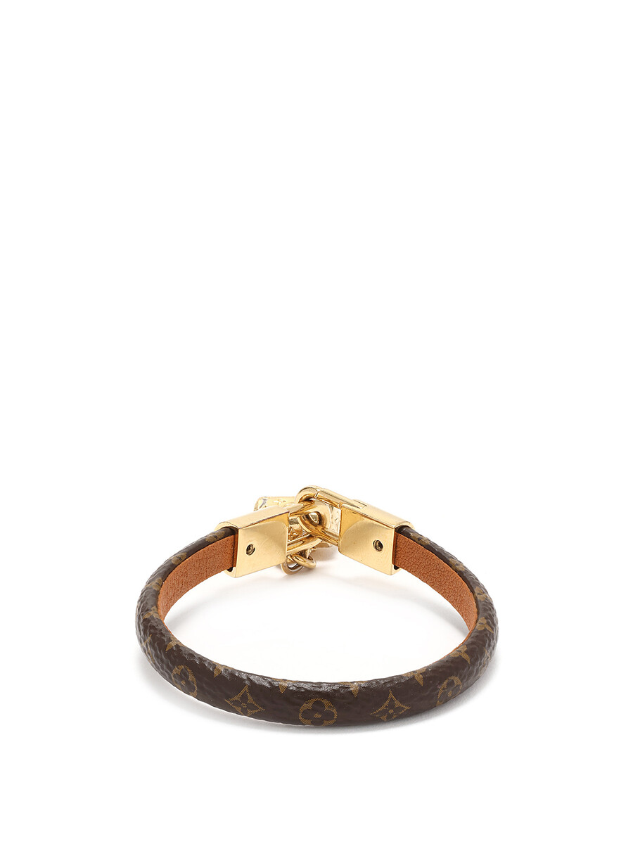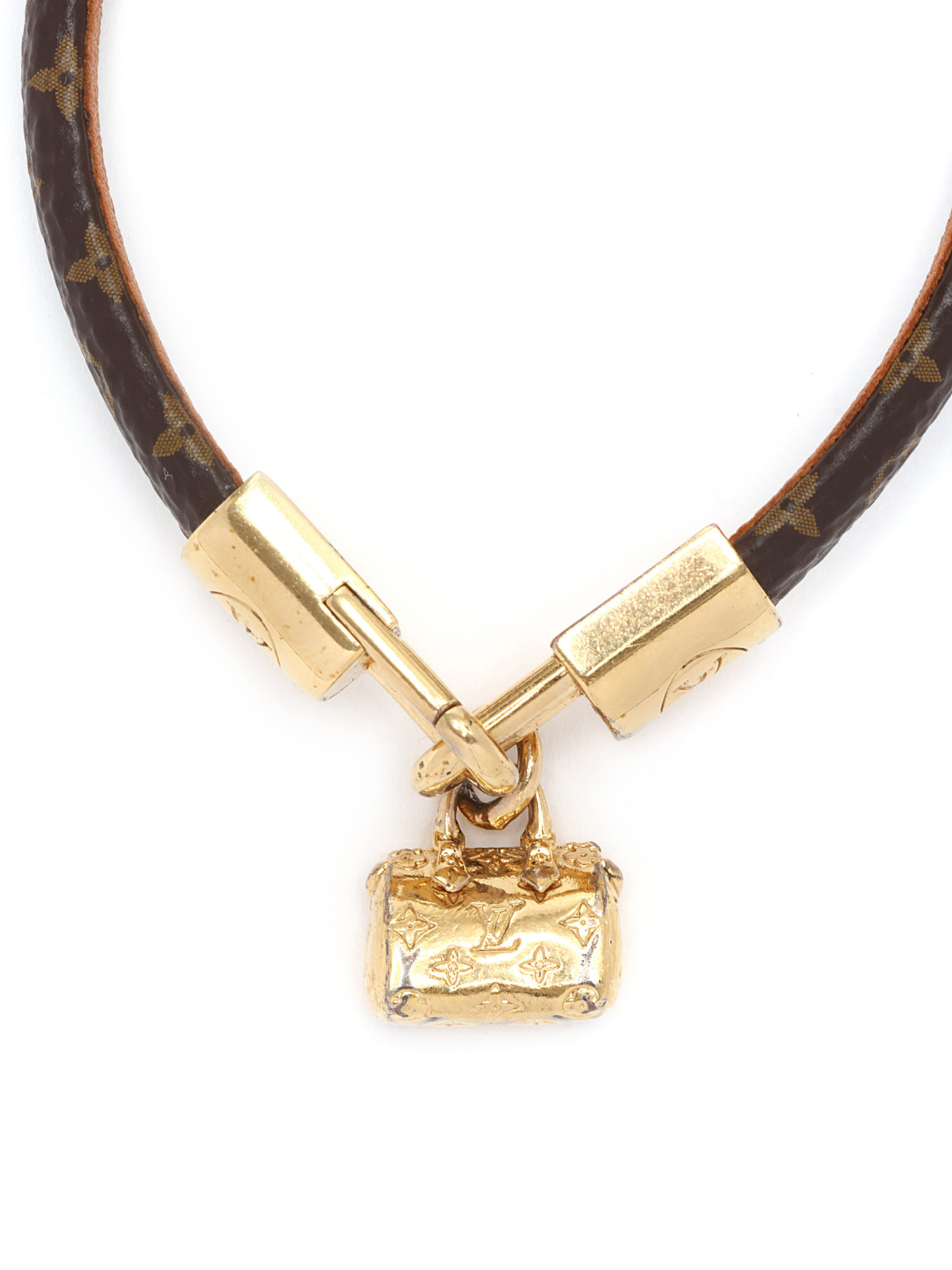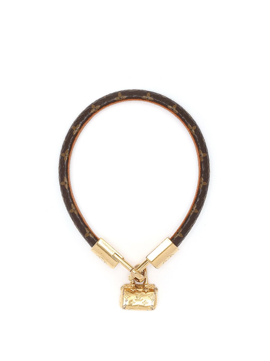Coated canvas bracelet with iconic monogram bag charm pendant. Hinge clasp closure.