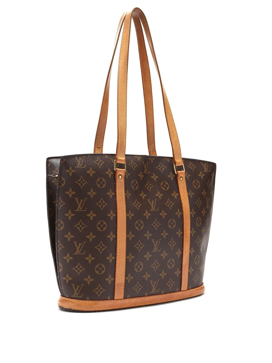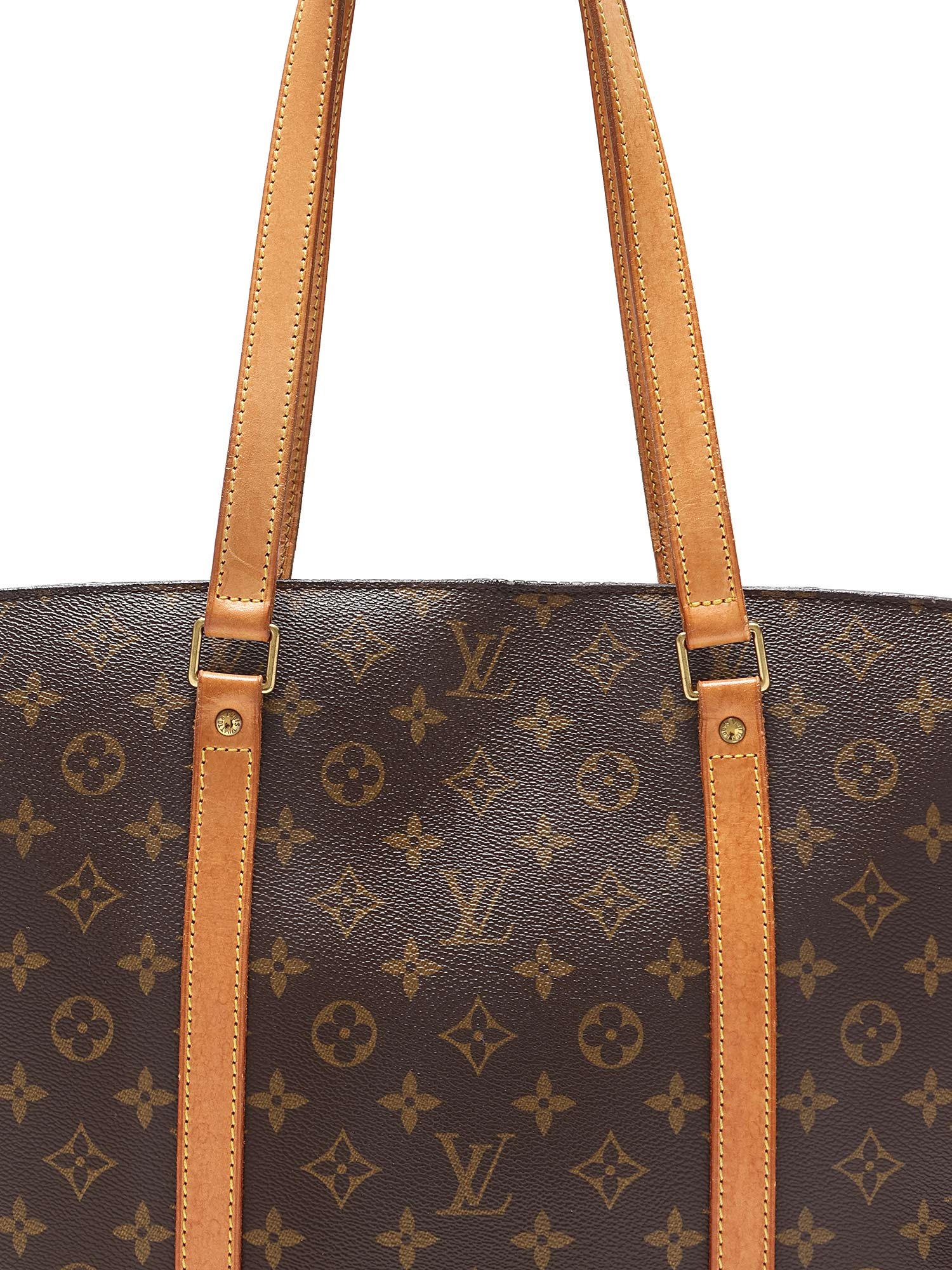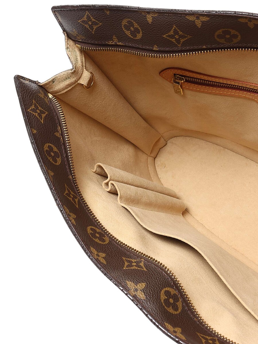 Large Monogram canvas tote bag in brown. Camel leather handles and shoulder straps. Gold-tone hardware. Zipper closure. Vachetta leather trim. Made in France.