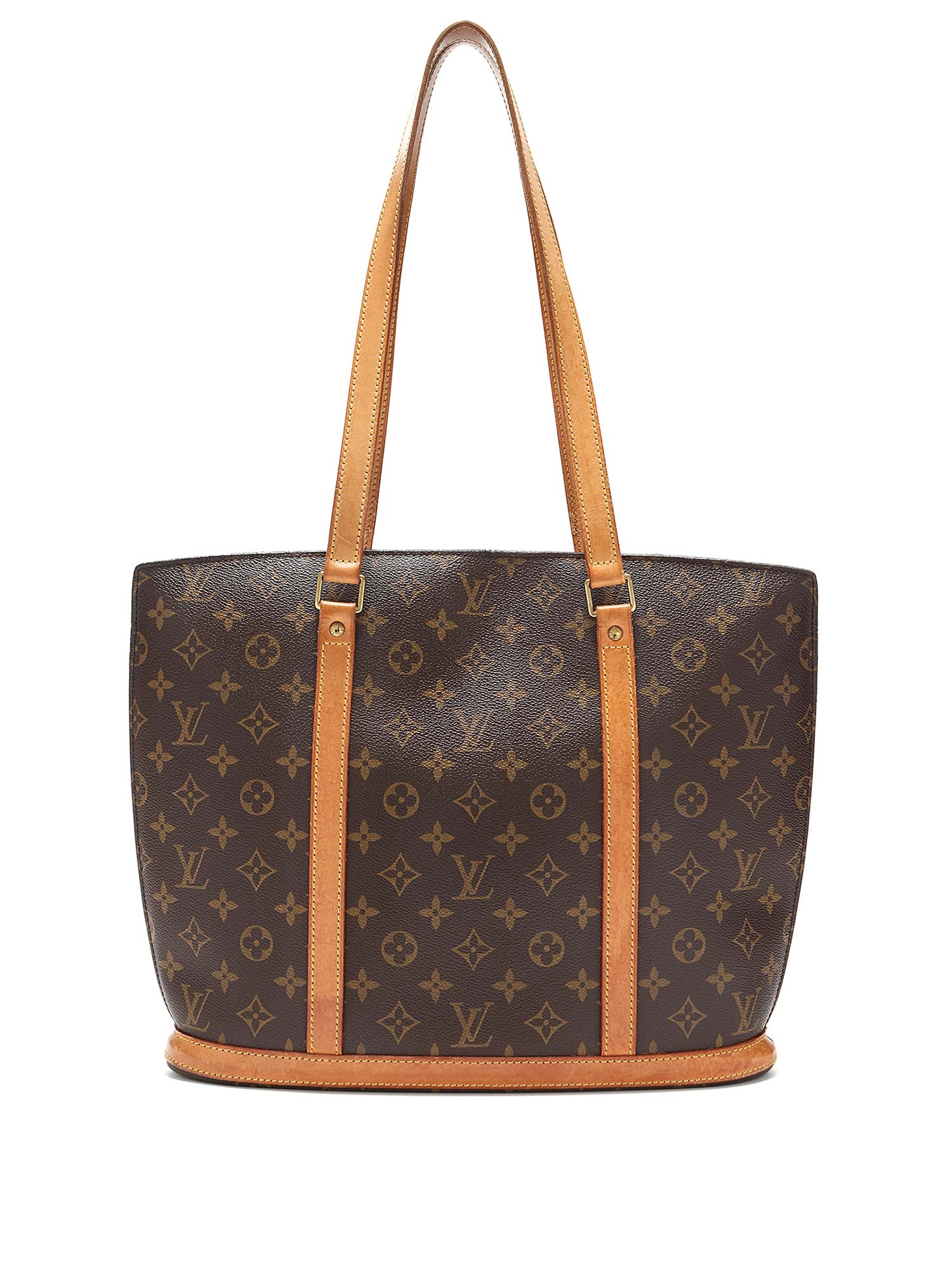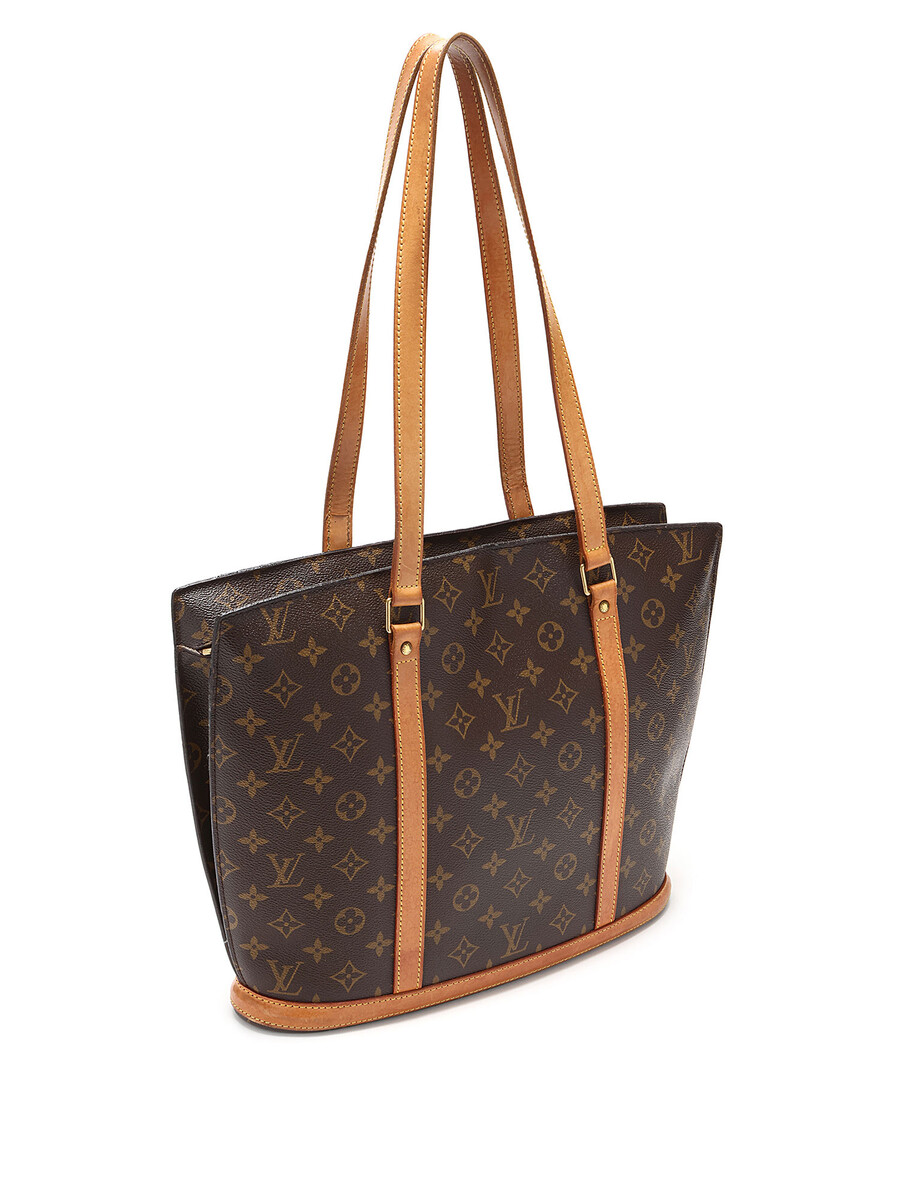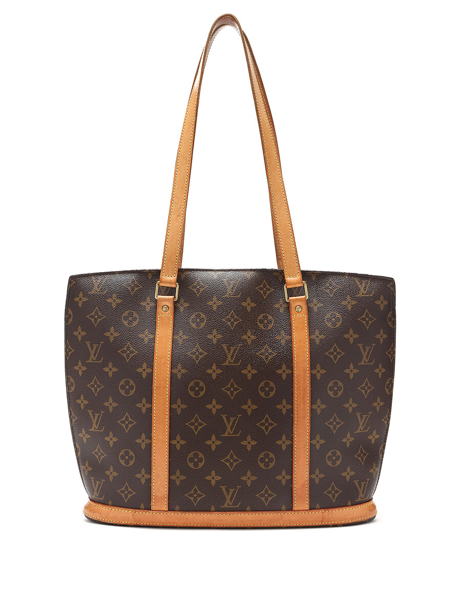 Large Monogram canvas tote bag in brown. Camel leather handles and shoulder straps. Gold-tone hardware. Zipper closure. Vachetta leather trim. Made in France.