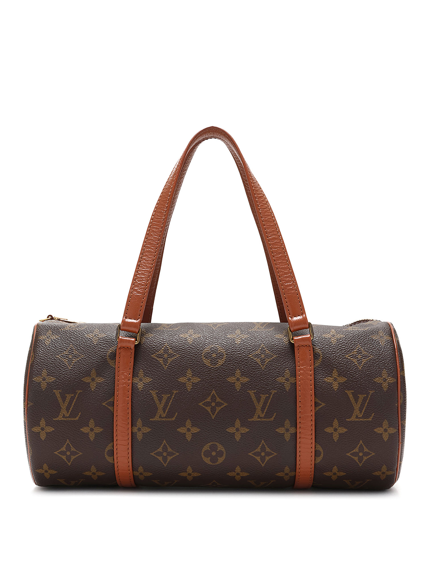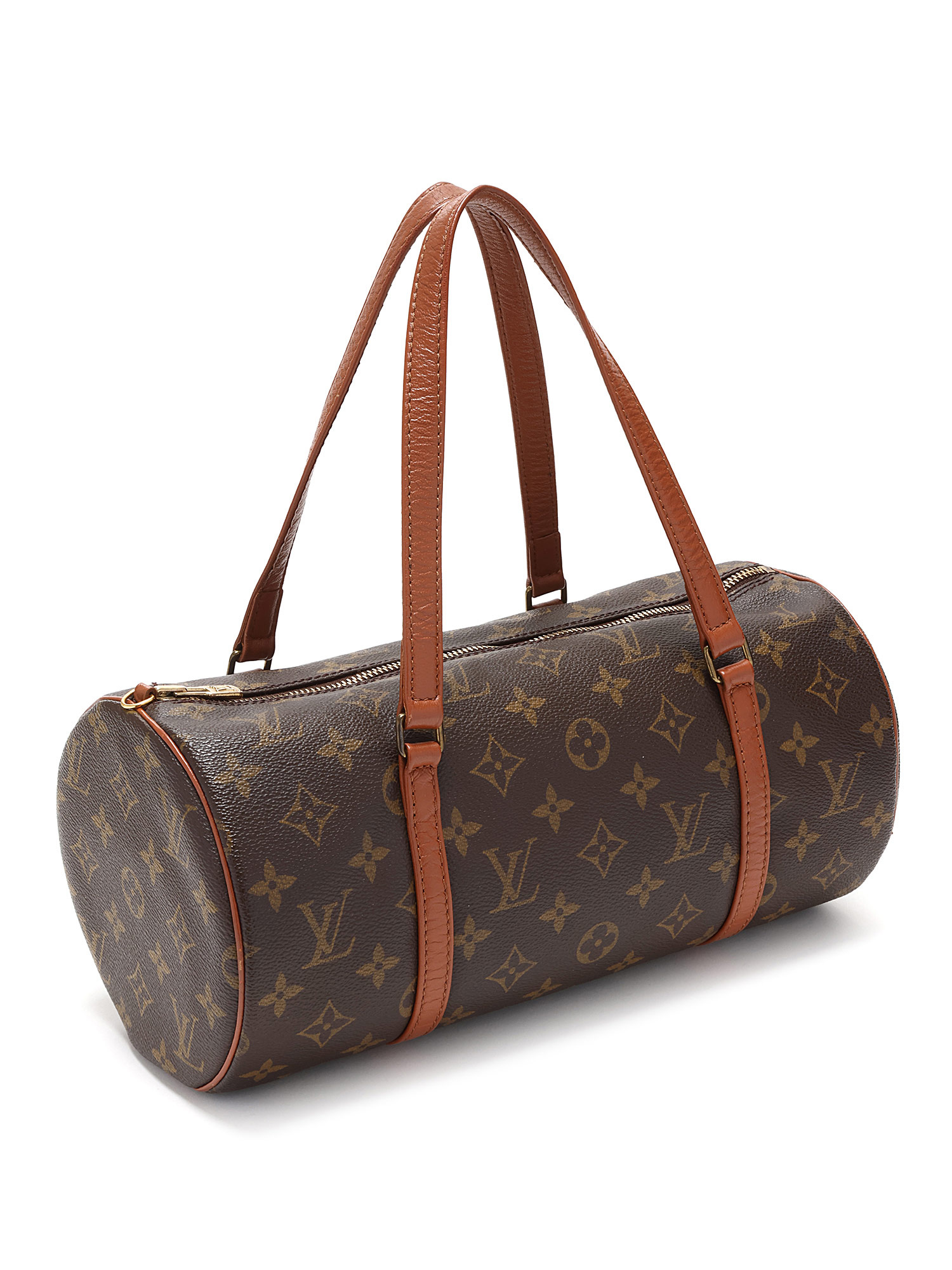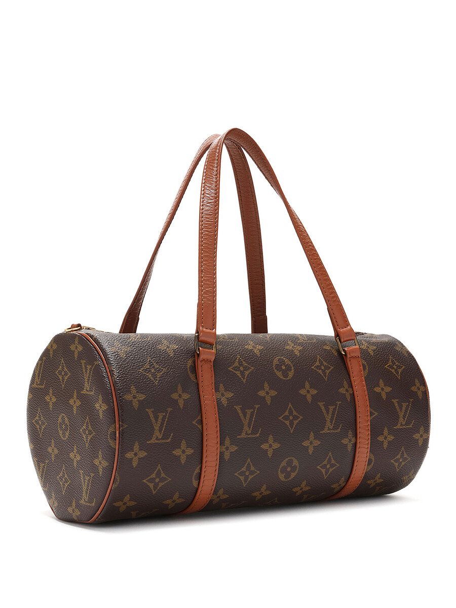 Monogram coated canvas Papillon 30 barrel-shaped handbag. Camel leather handle and trim. Top zip closure.