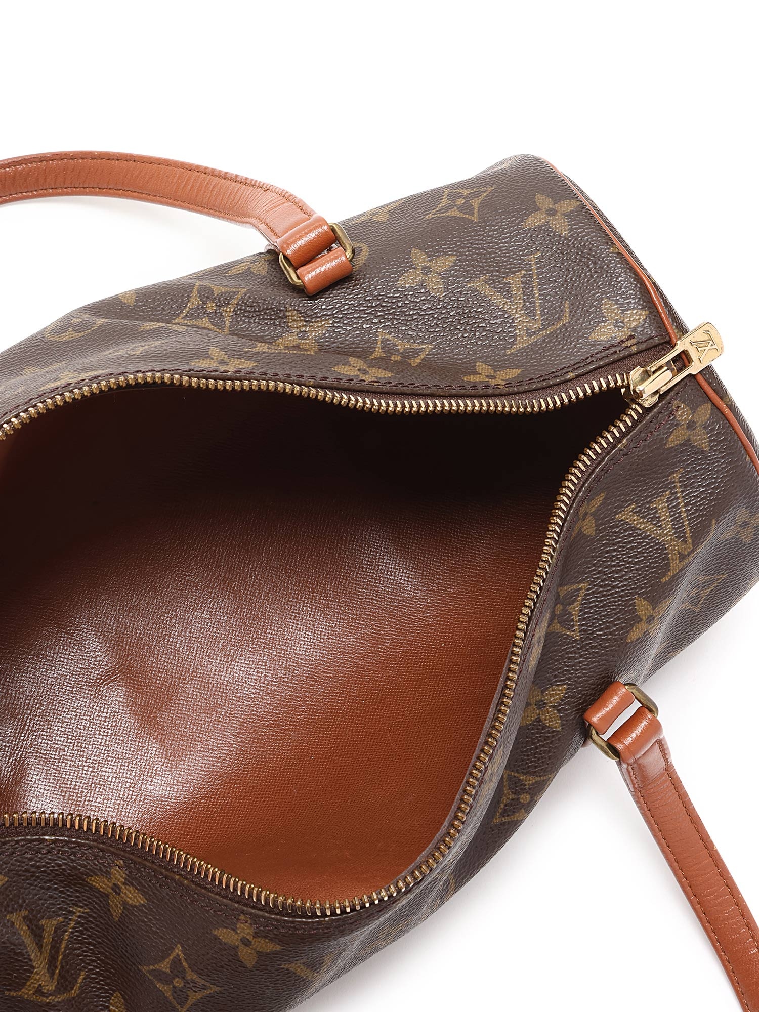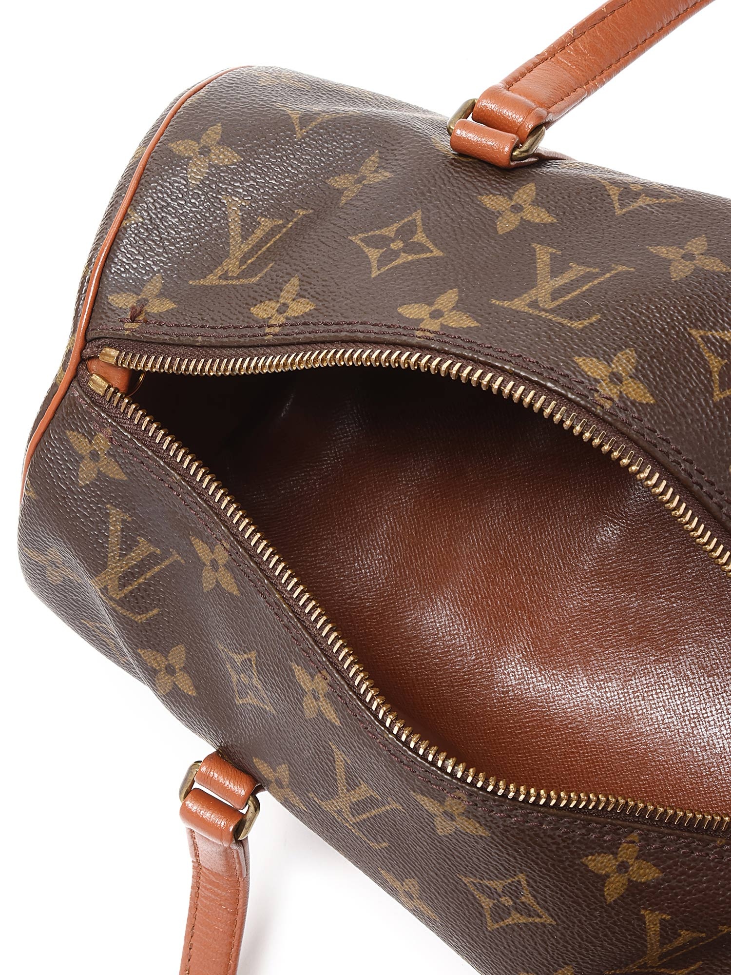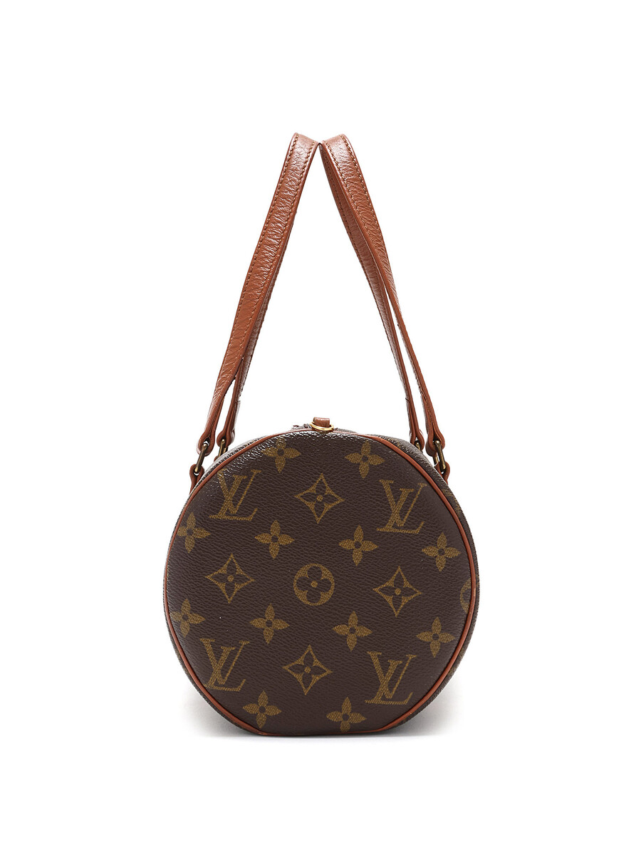 Monogram coated canvas Papillon 30 barrel-shaped handbag. Camel leather handle and trim. Top zip closure.