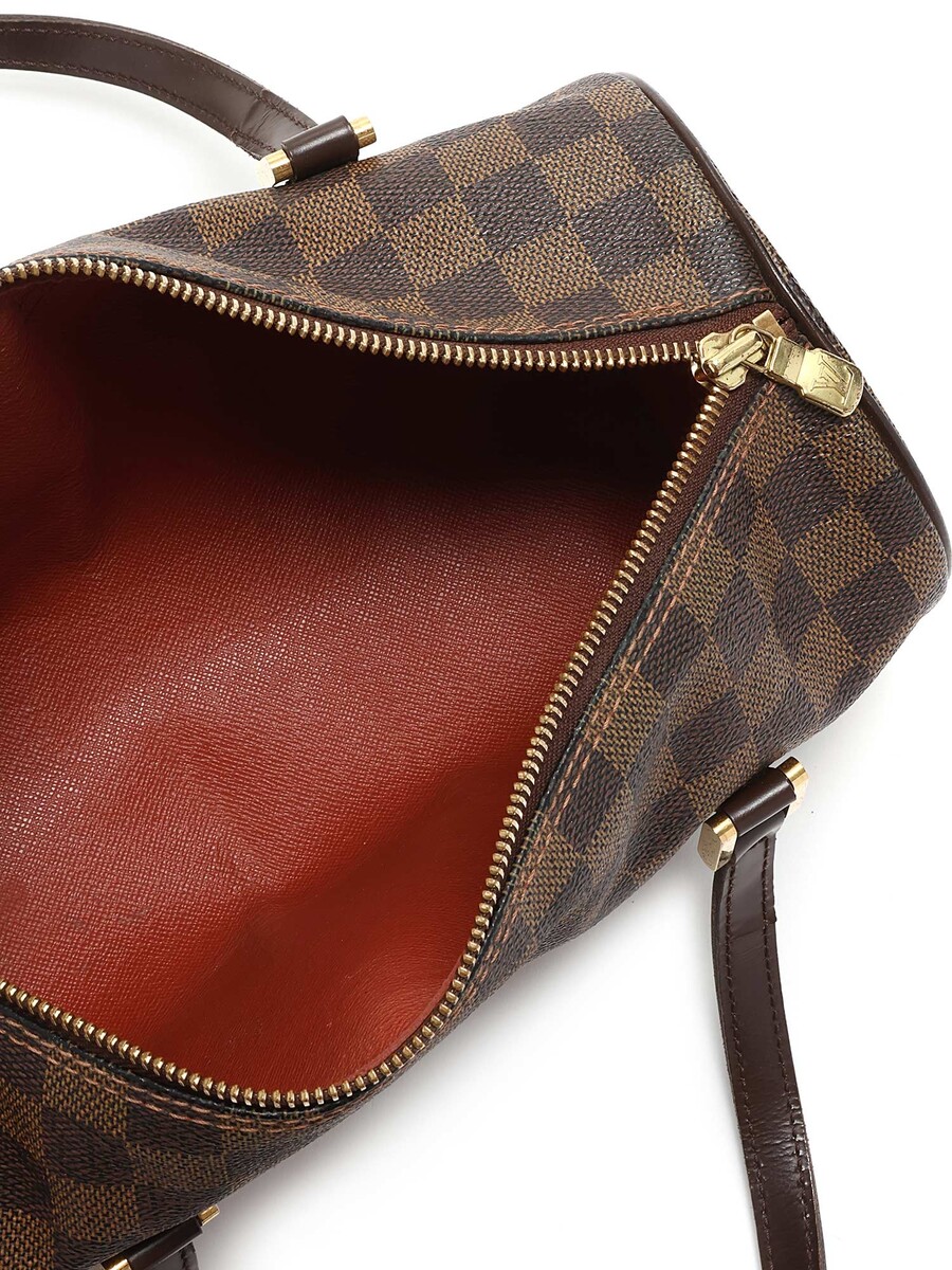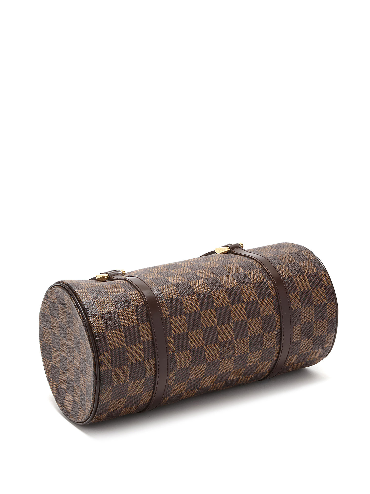 Damier Ebene canvas barrel bag in brown. Zipper closure. Leather trims. Gold-tone hardware.
