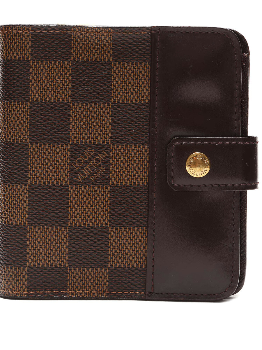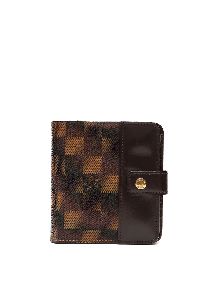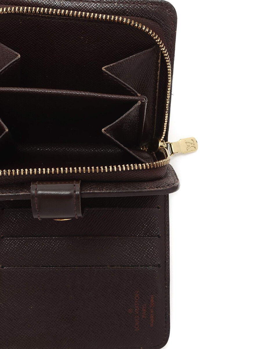 Damier Ebene coated canvas and leather wallet with signature. Snap button and zip closure. Gold-tone hardware.
