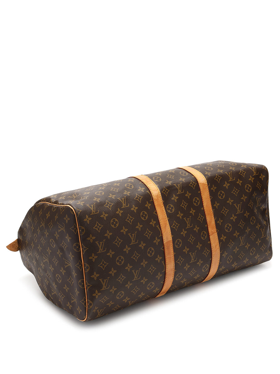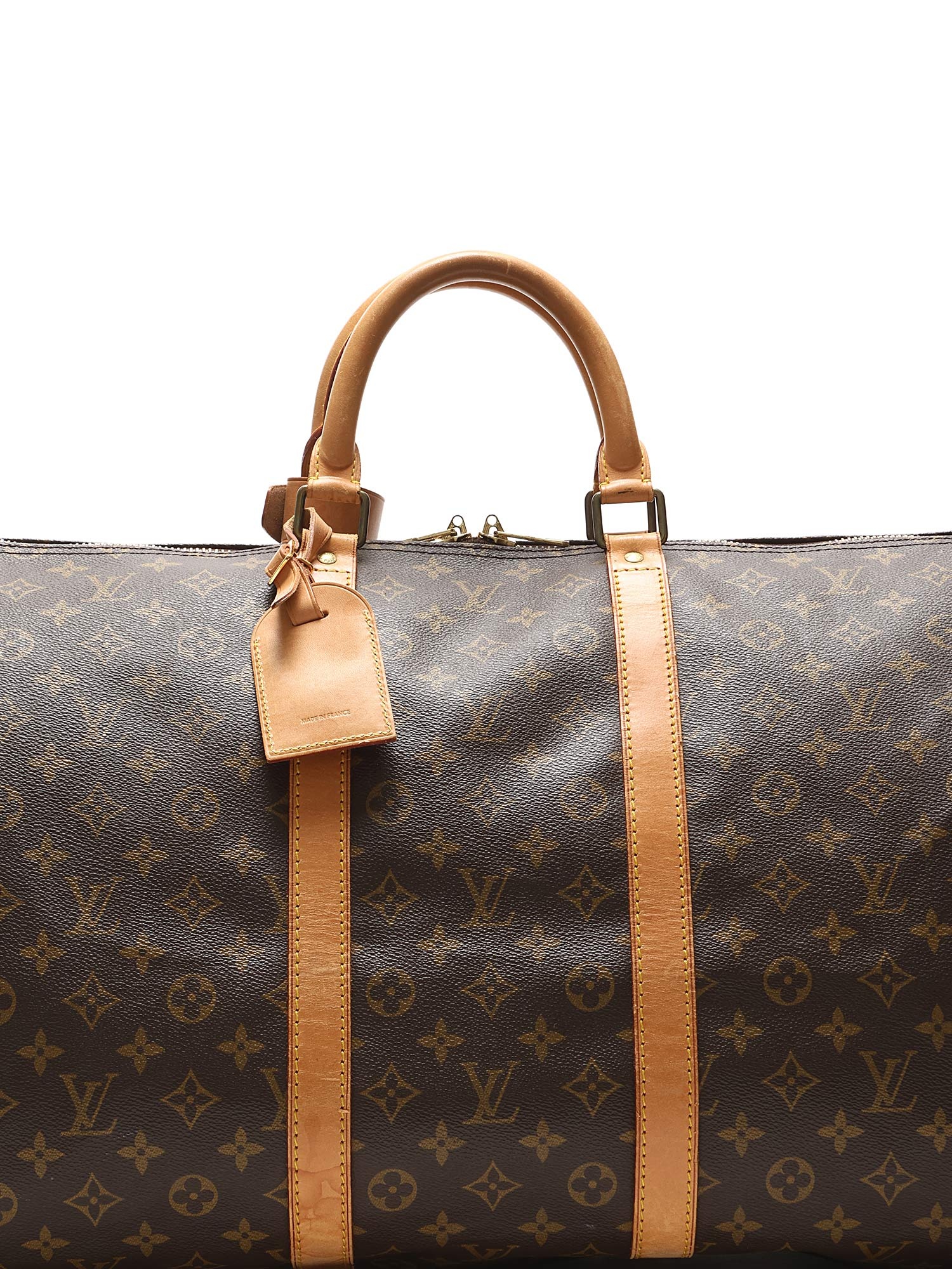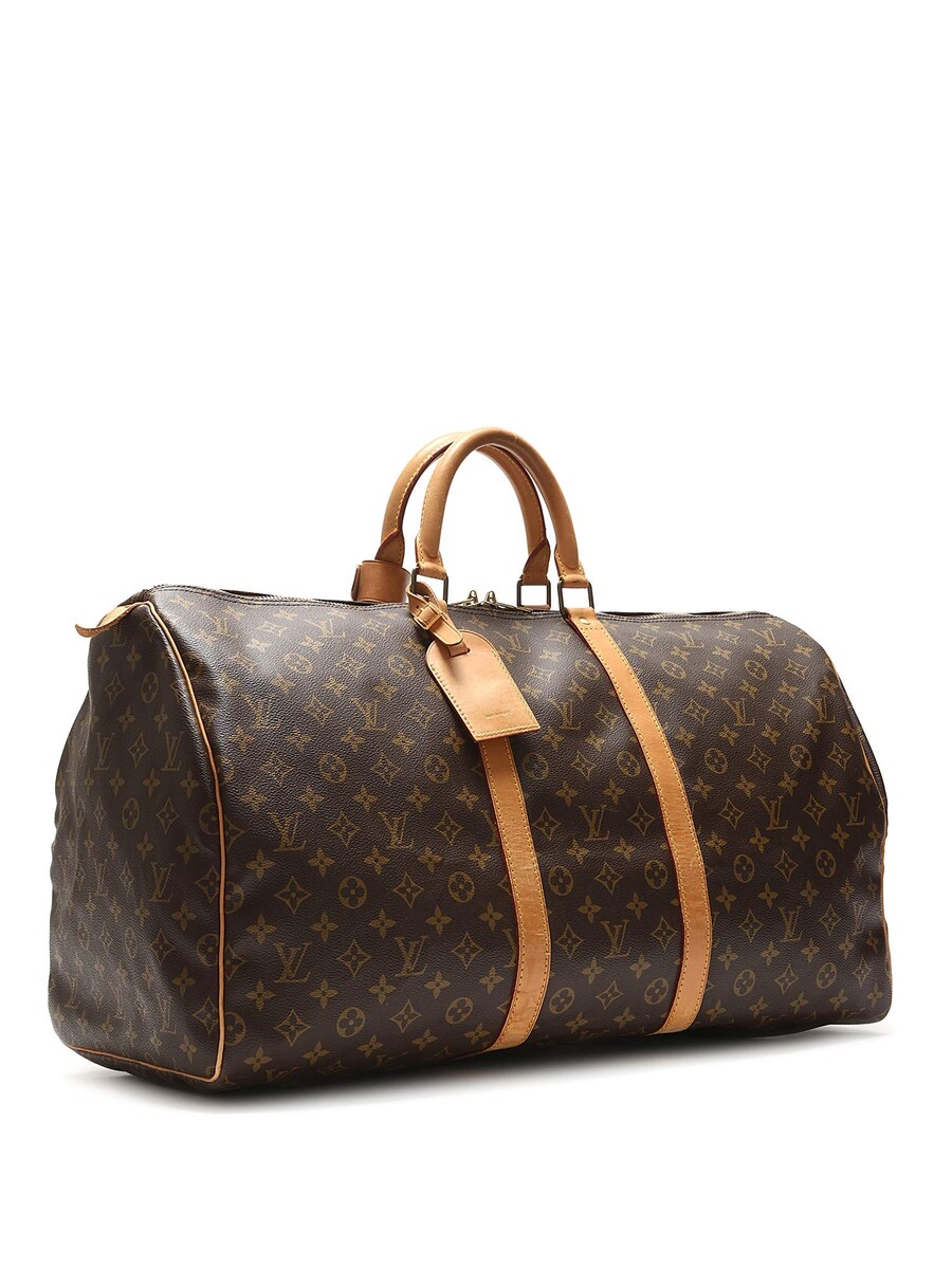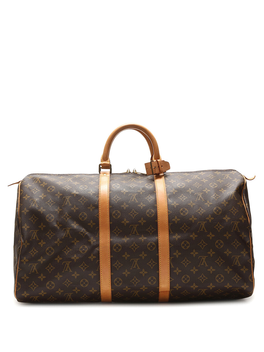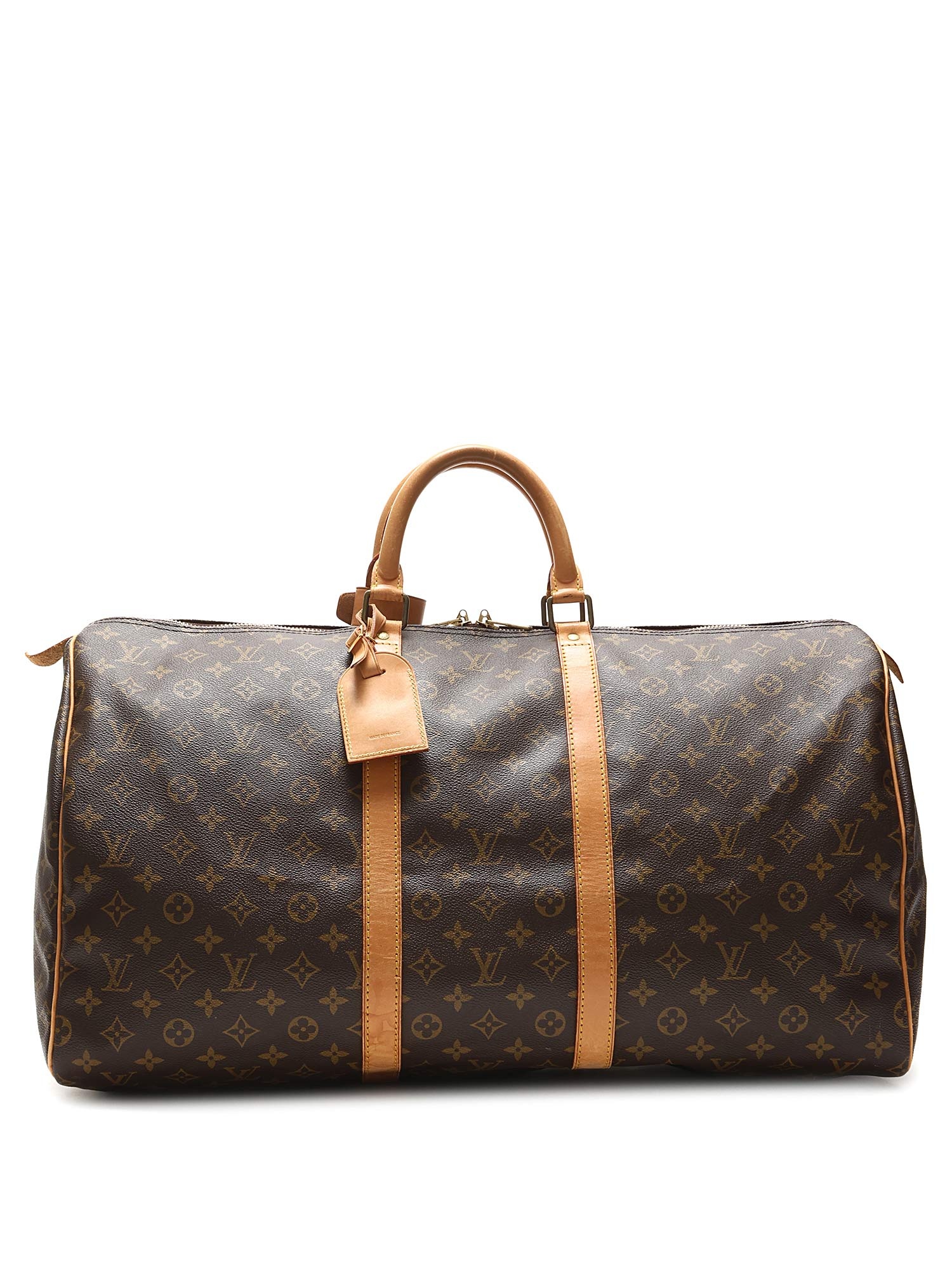 Travel bag in coated canvas featuring iconic monogram pattern in brown tones. Gold-tone metal hardware. Brown leather trim and dual leather handles. Zipper top closure.