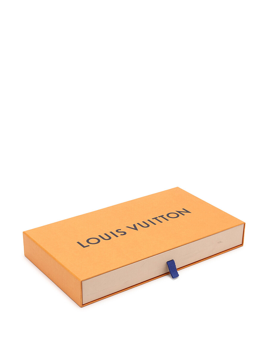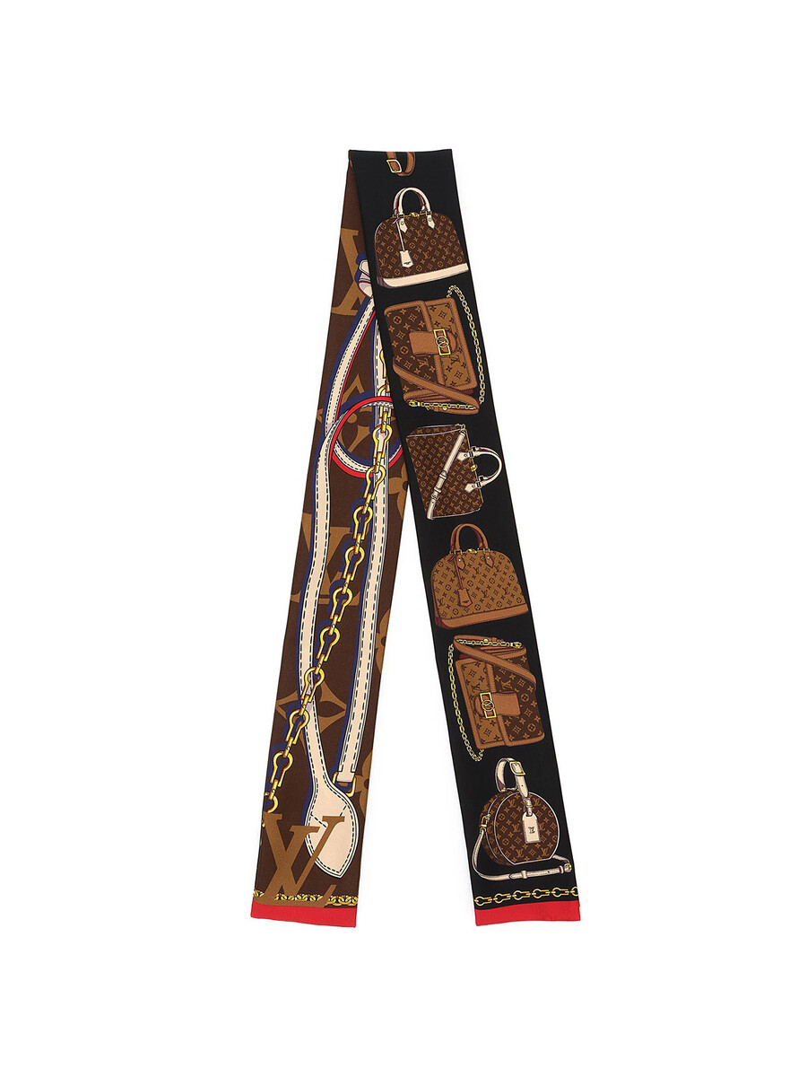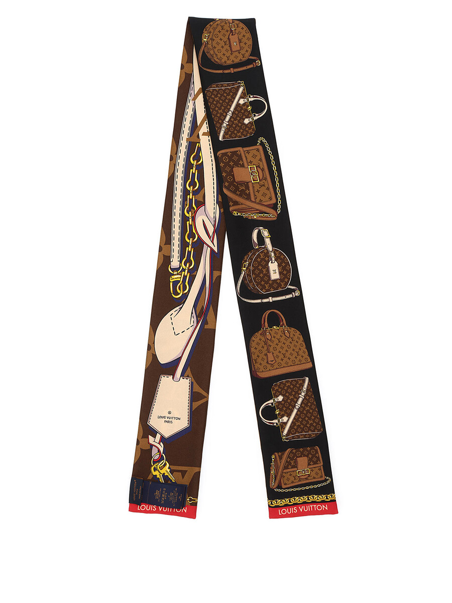 Silk bandeau with iconic Louis Vuitton monogram and bag print in shades of brown, beige, gold, blue, and red accents. Comes with a box and bag.