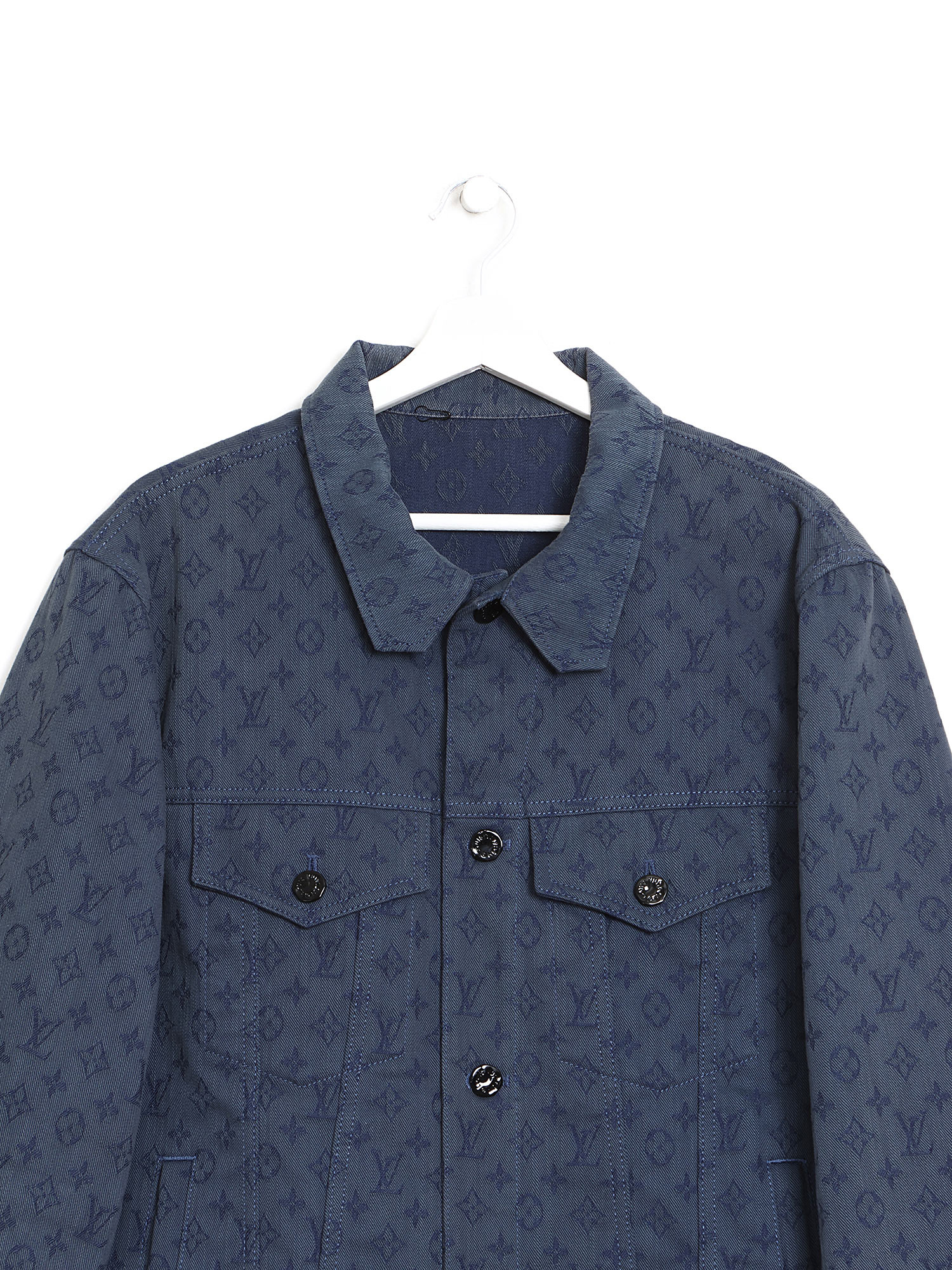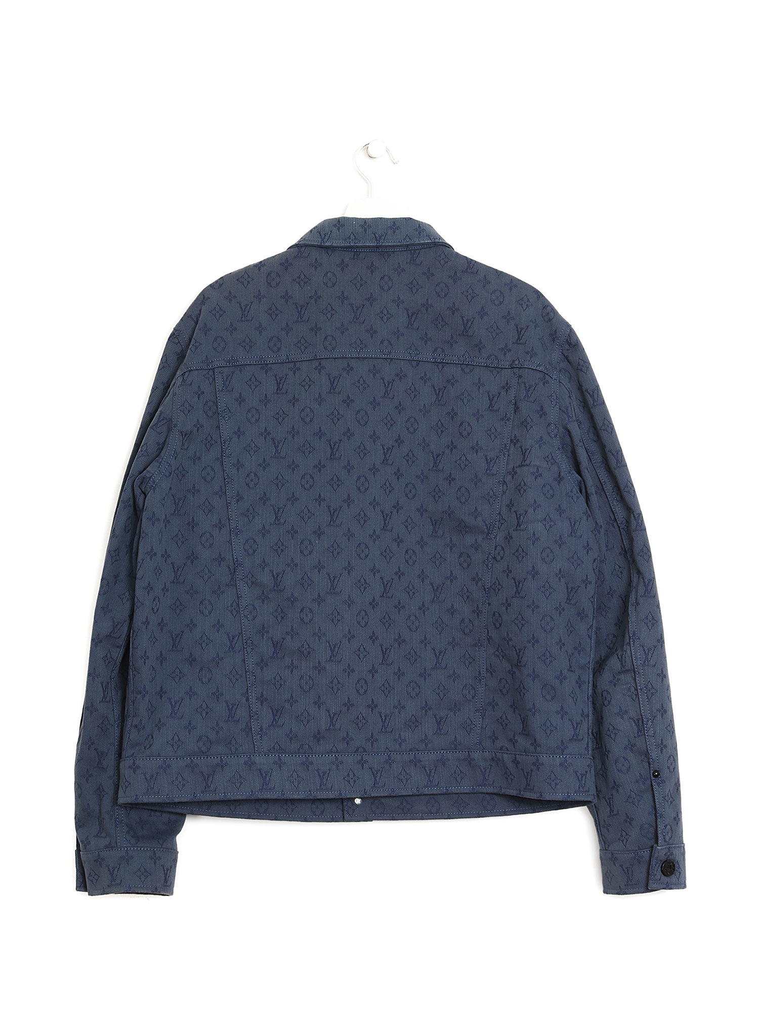 Monogram denim jacket in blue. Button front closure. Classic collar. Two chest flap pockets. Iconic LV monogram pattern throughout.