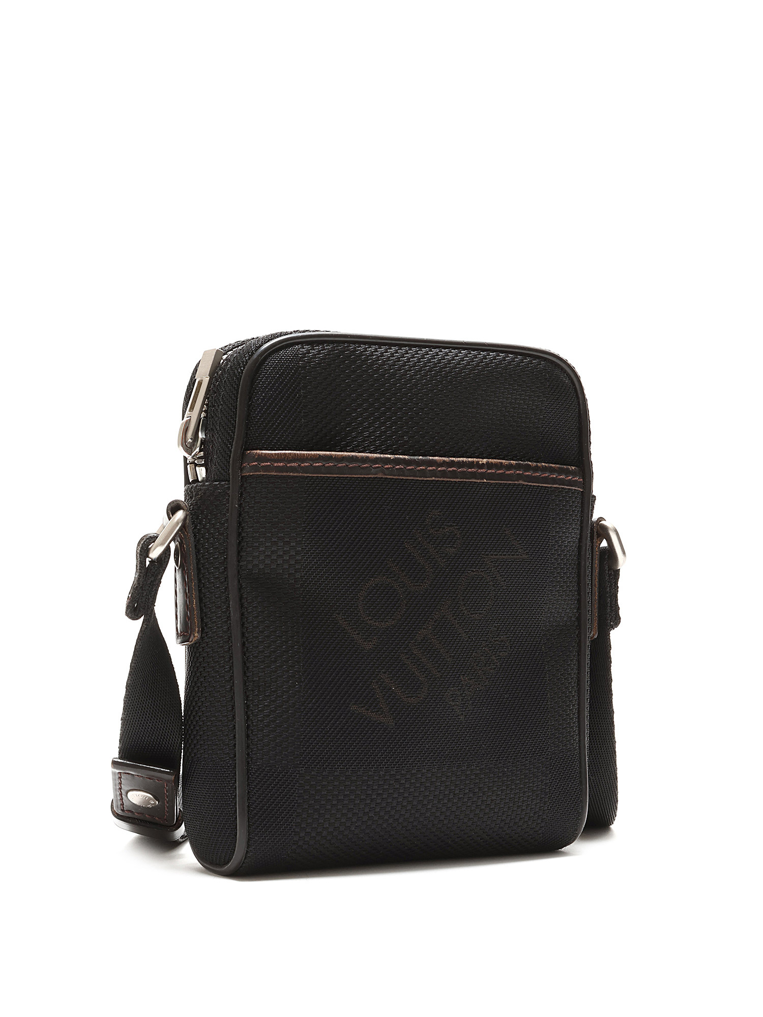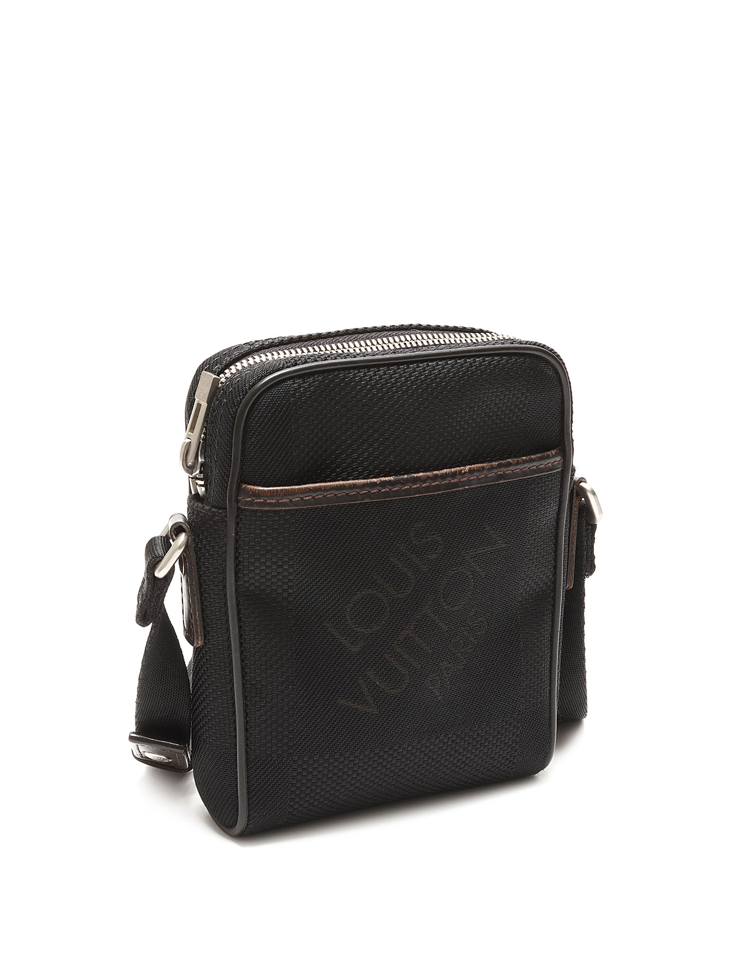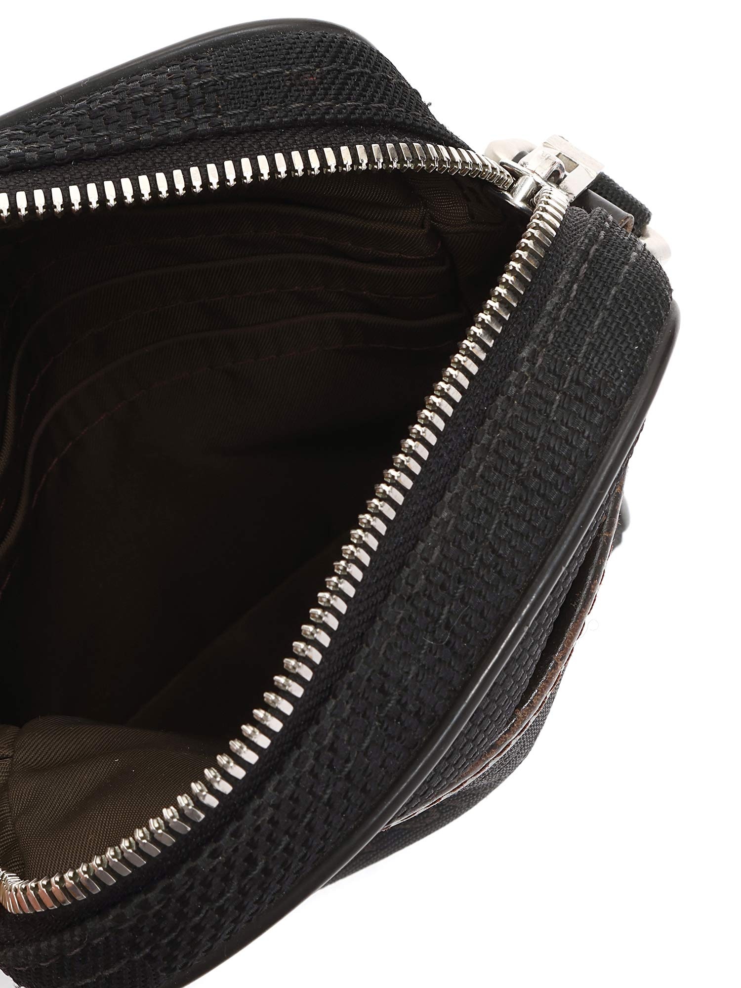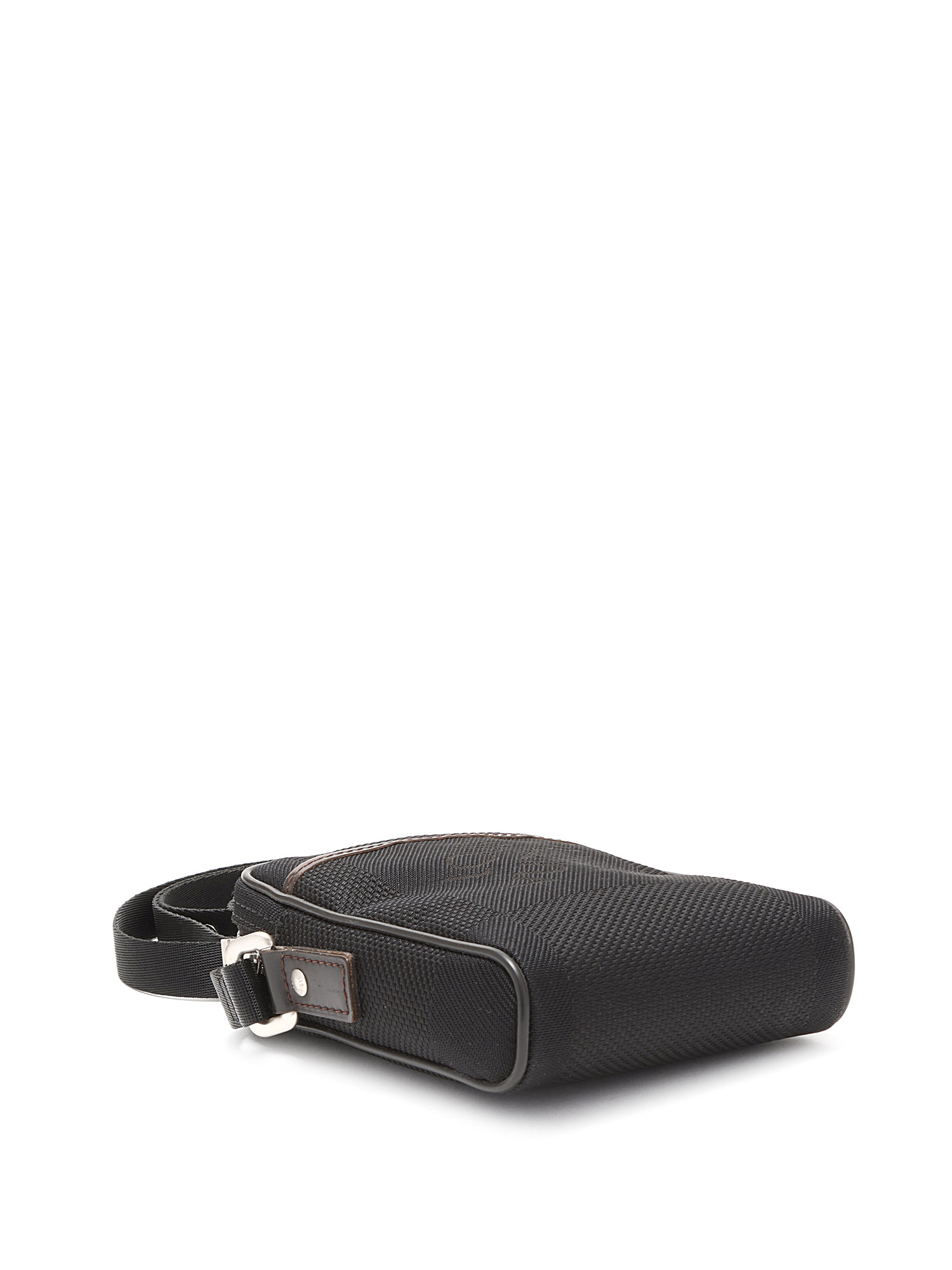Black and brown canvas crossbody bag featuring an adjustable fabric strap and silver-tone hardware. Zipper closure with leather trims. Includes original dustbag.