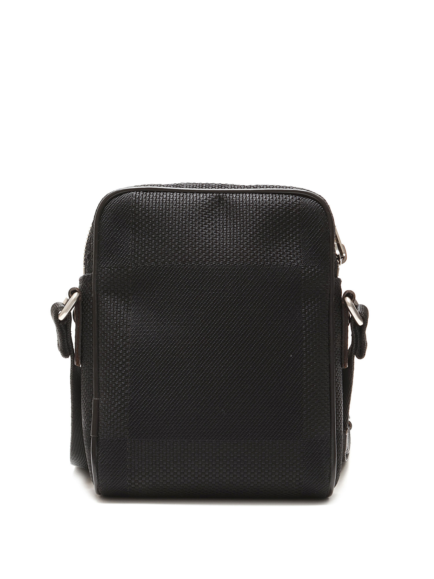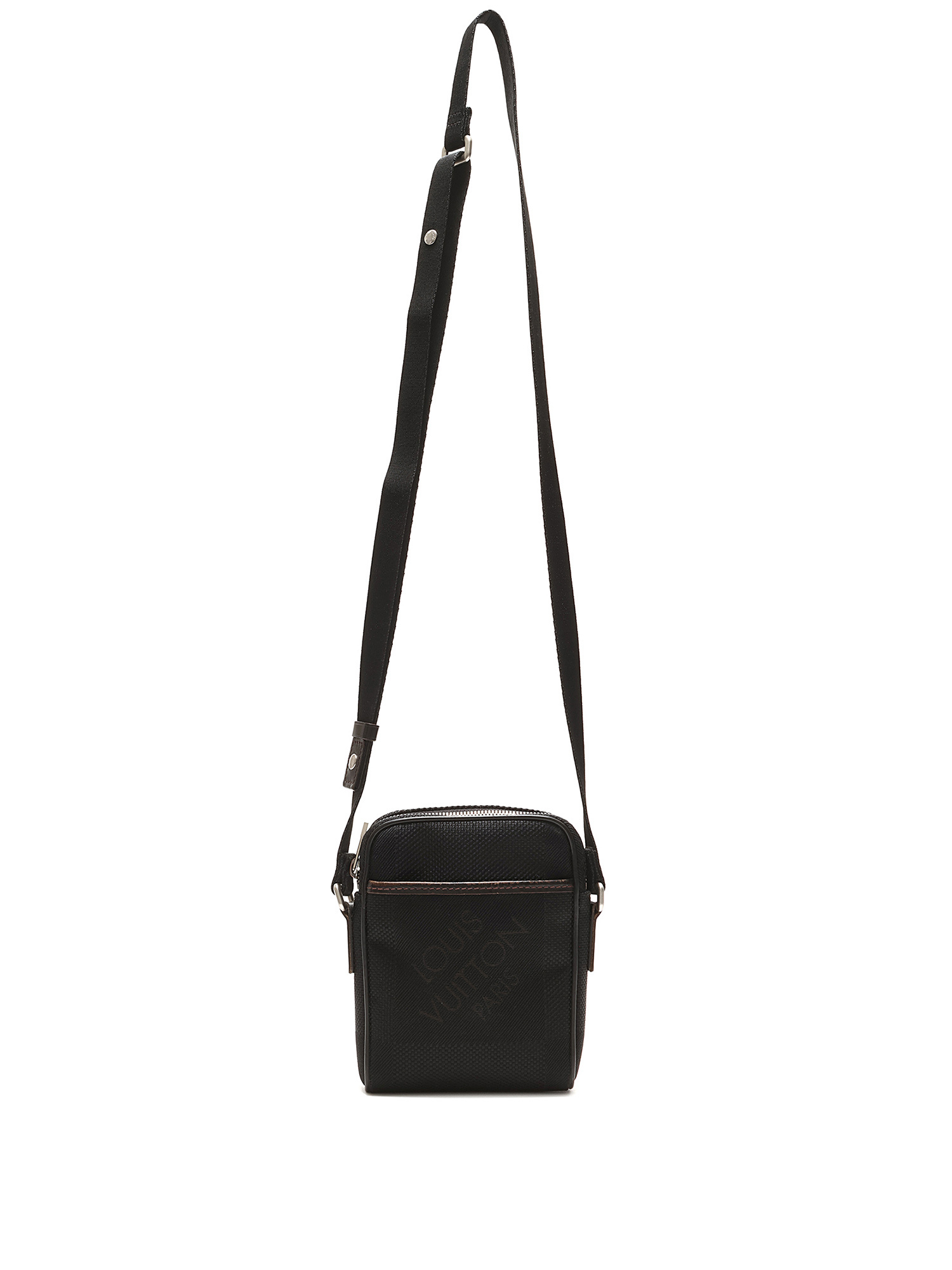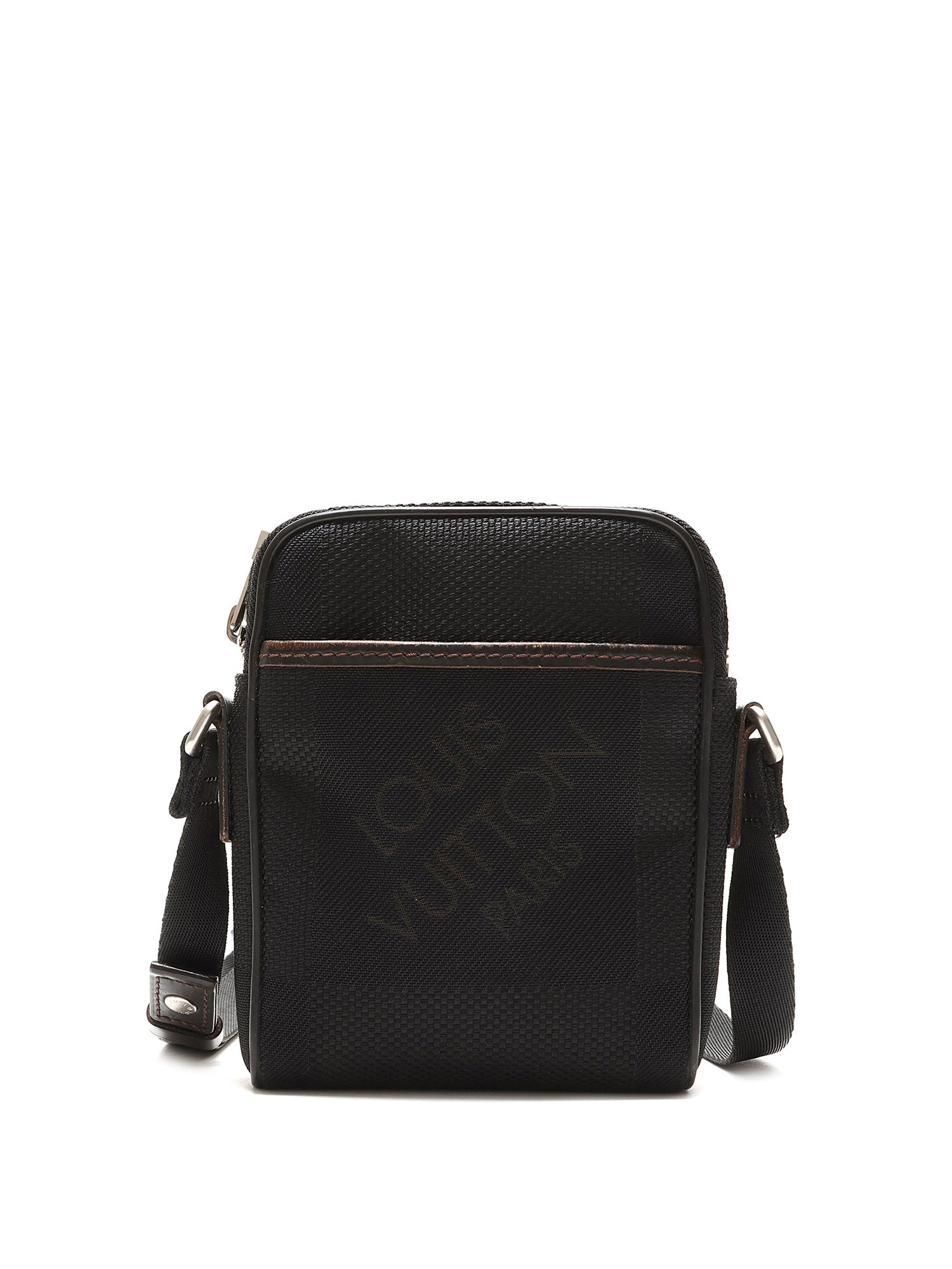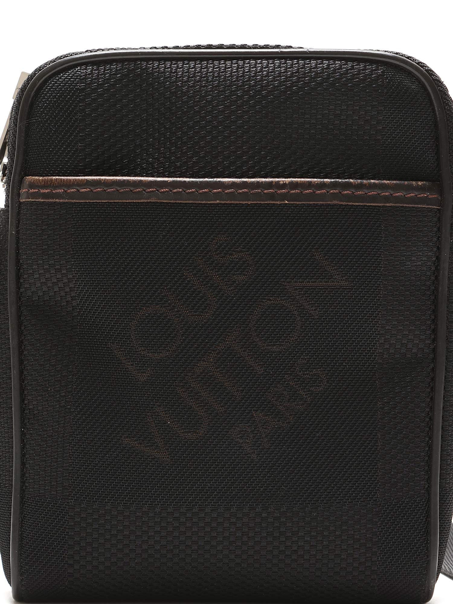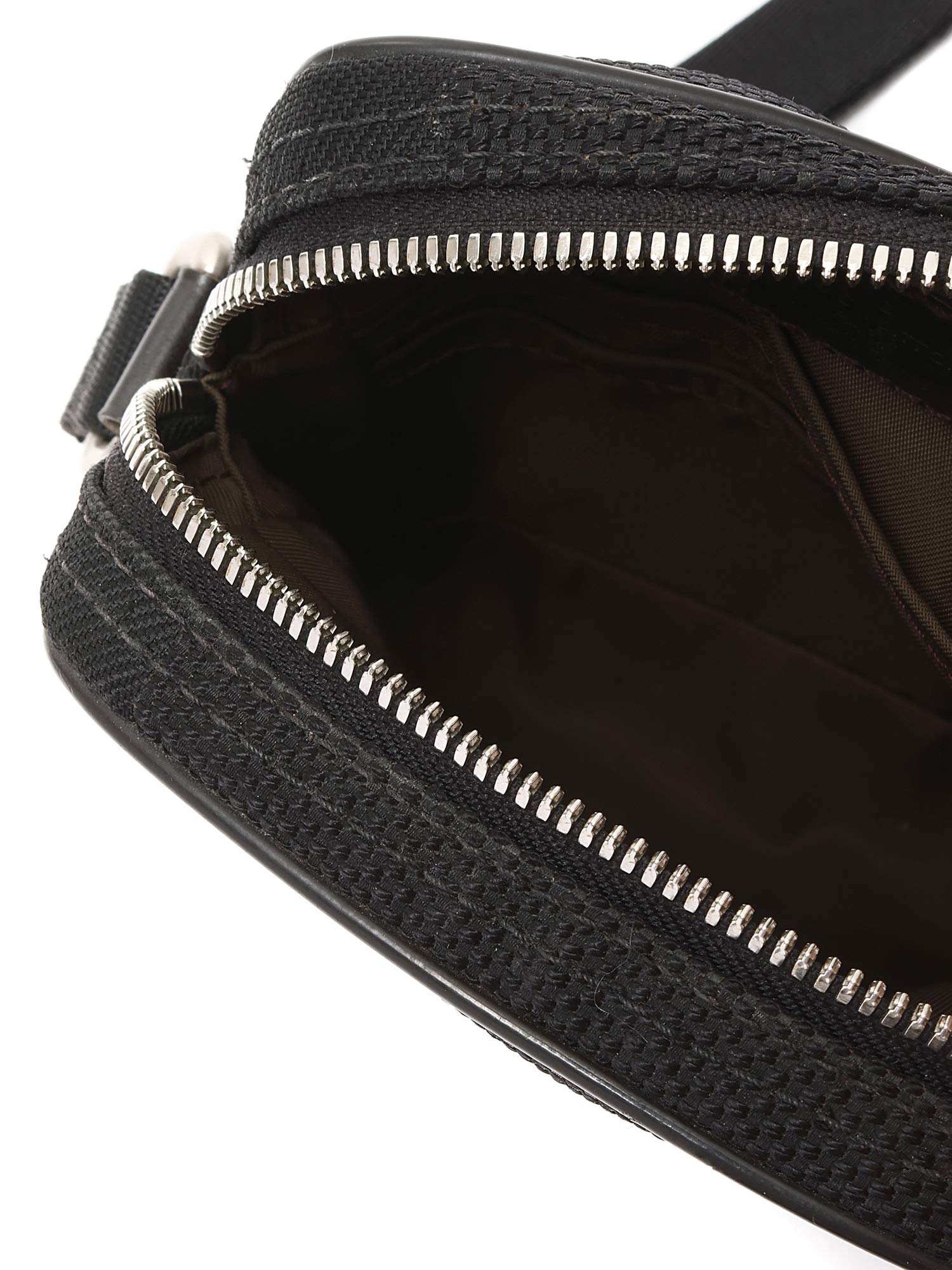 Black and brown canvas crossbody bag featuring an adjustable fabric strap and silver-tone hardware. Zipper closure with leather trims. Includes original dustbag.