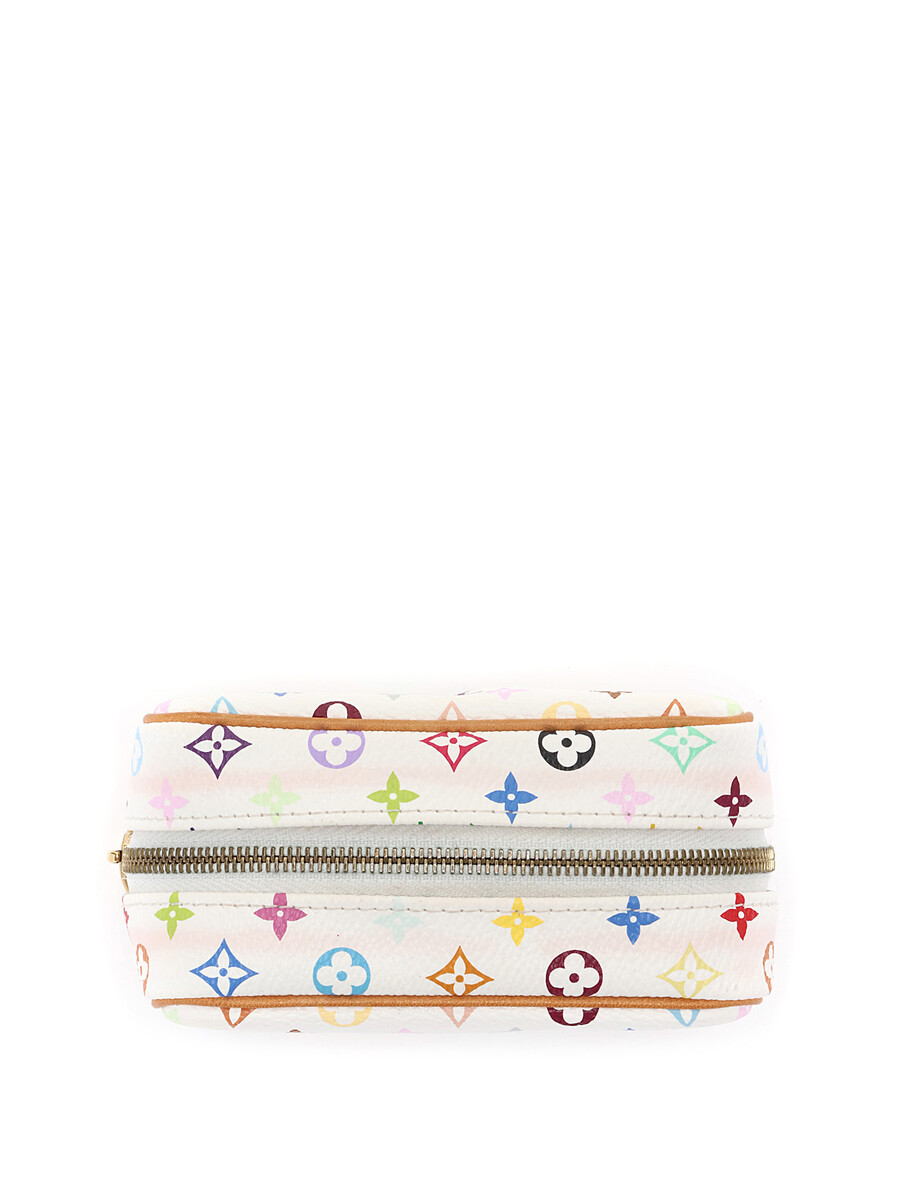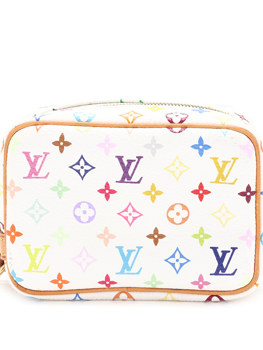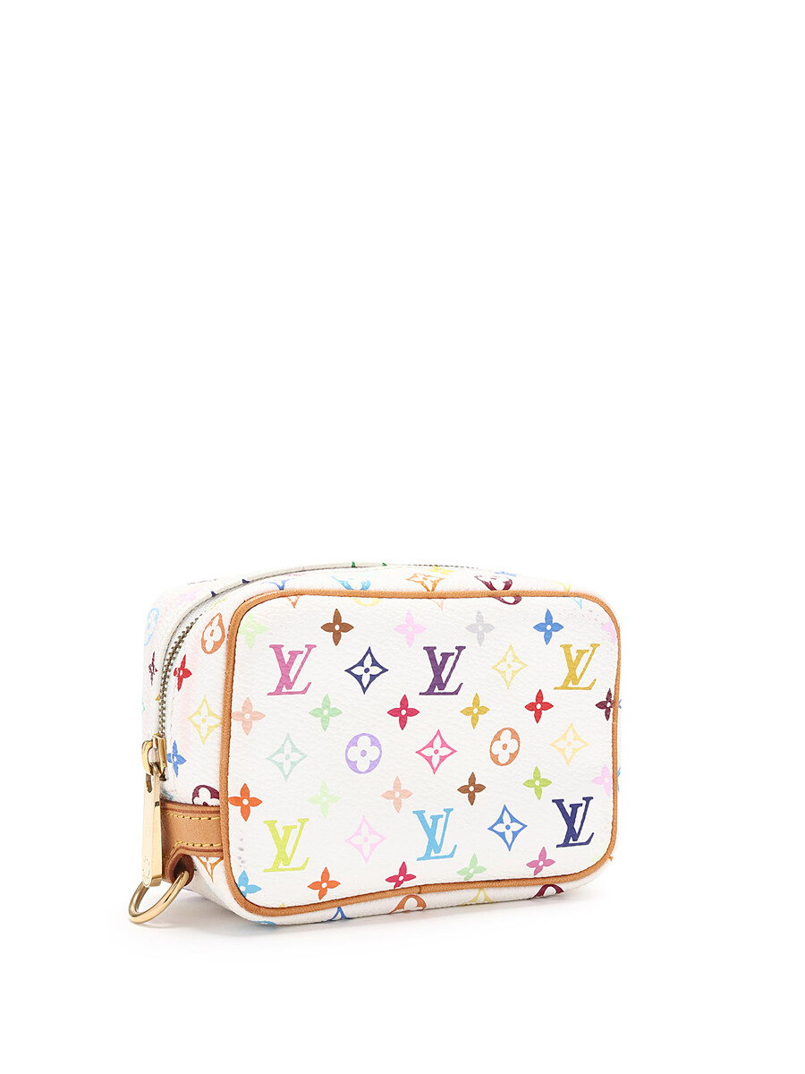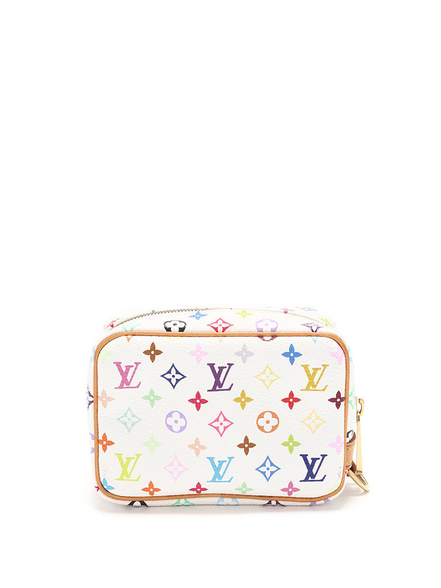 Coated canvas pouch with multicolored monogram pattern. Gold-tone hardware. Zip closure. Compact and chic design.