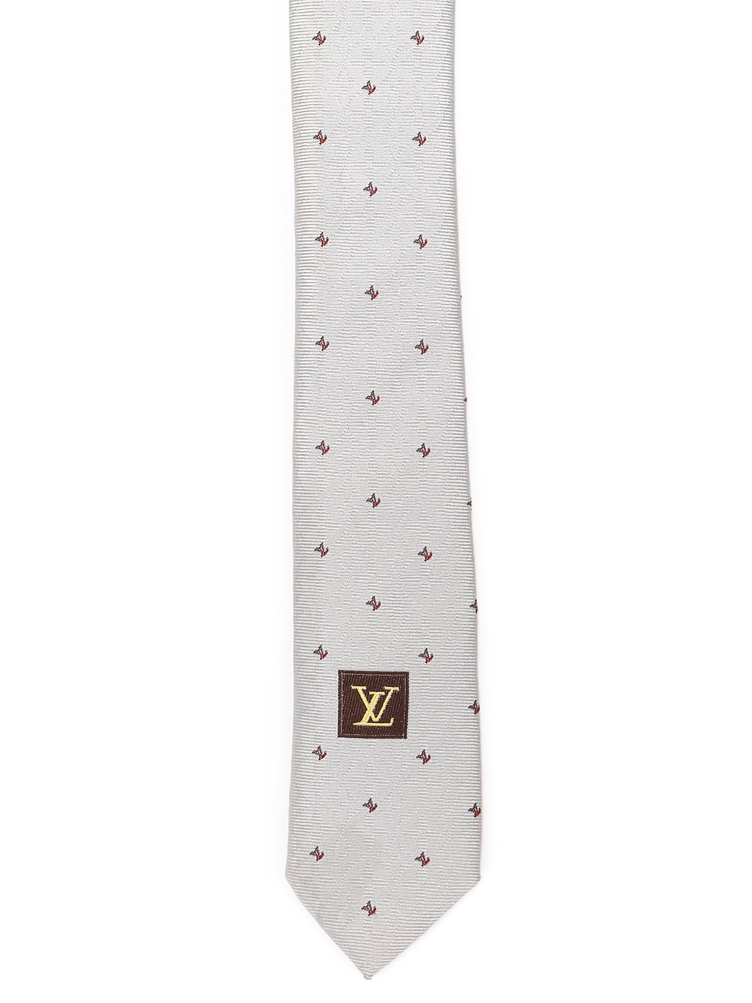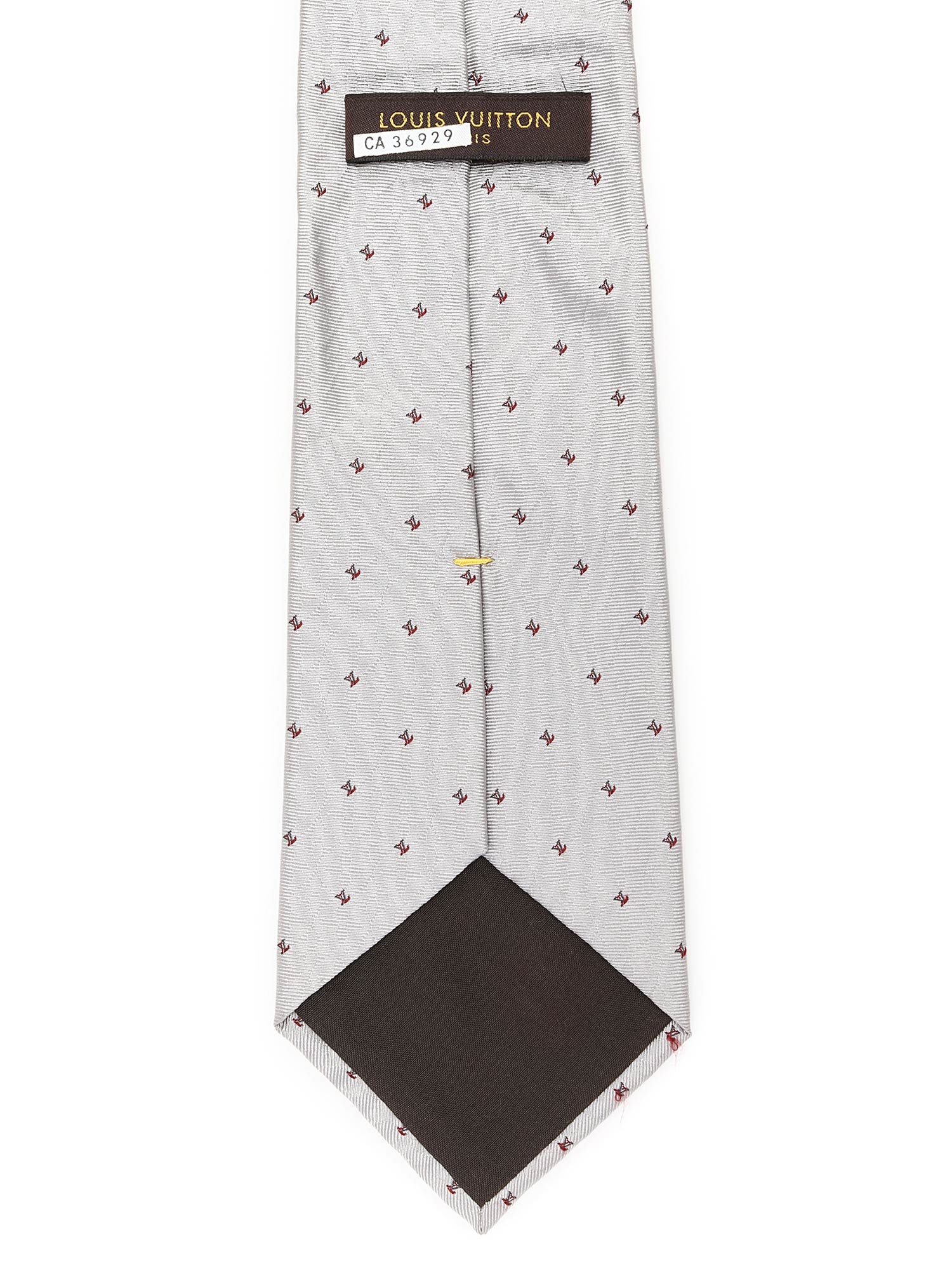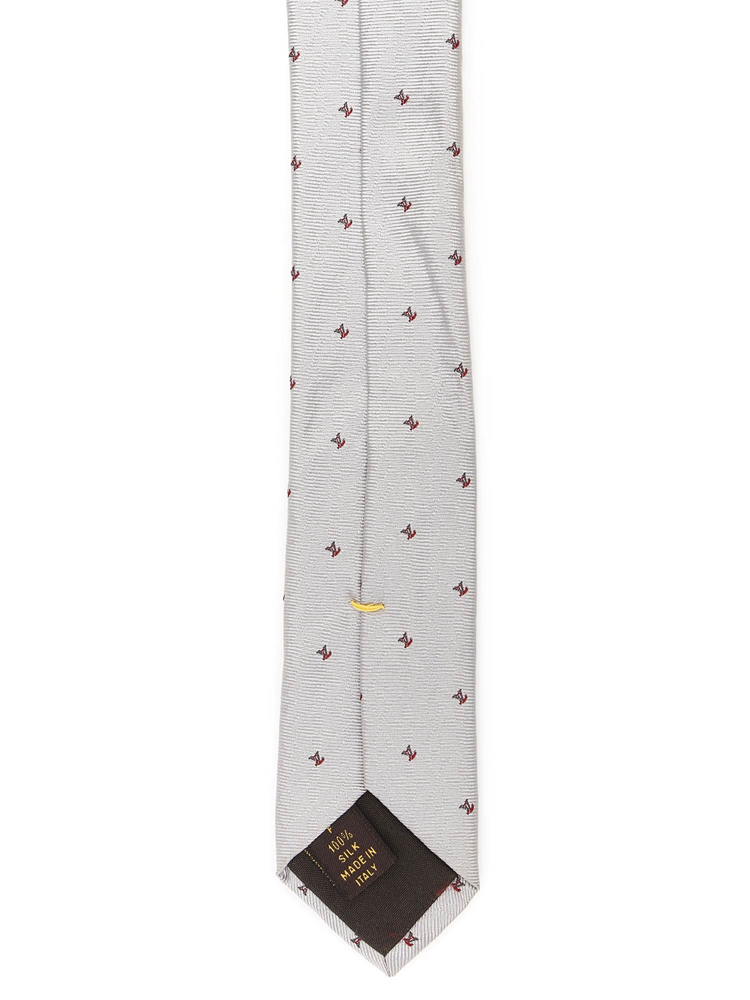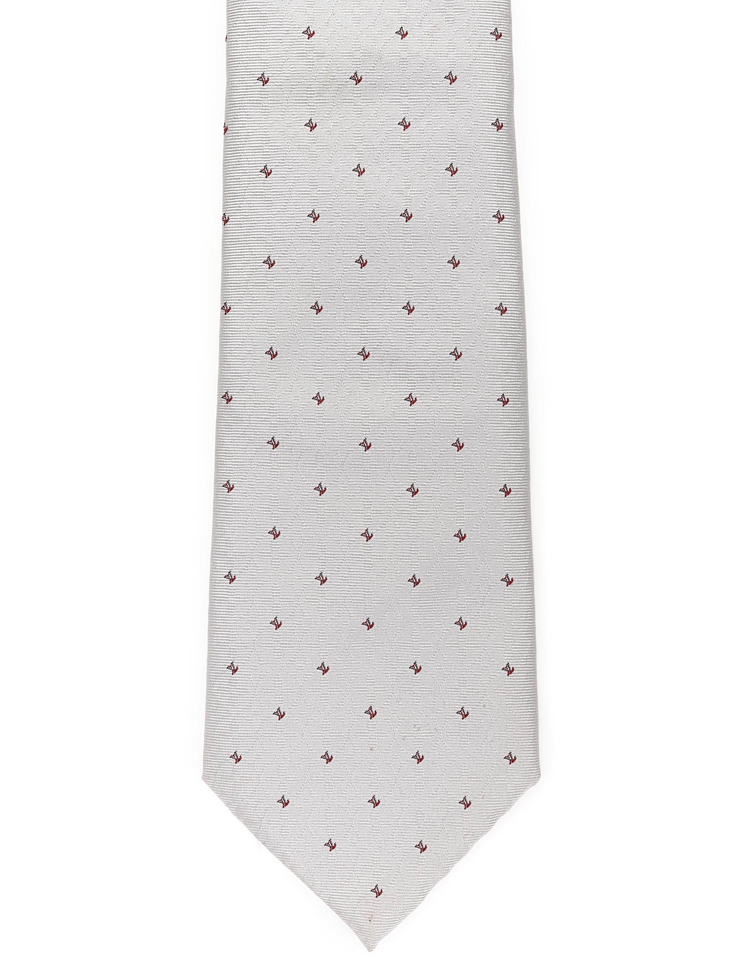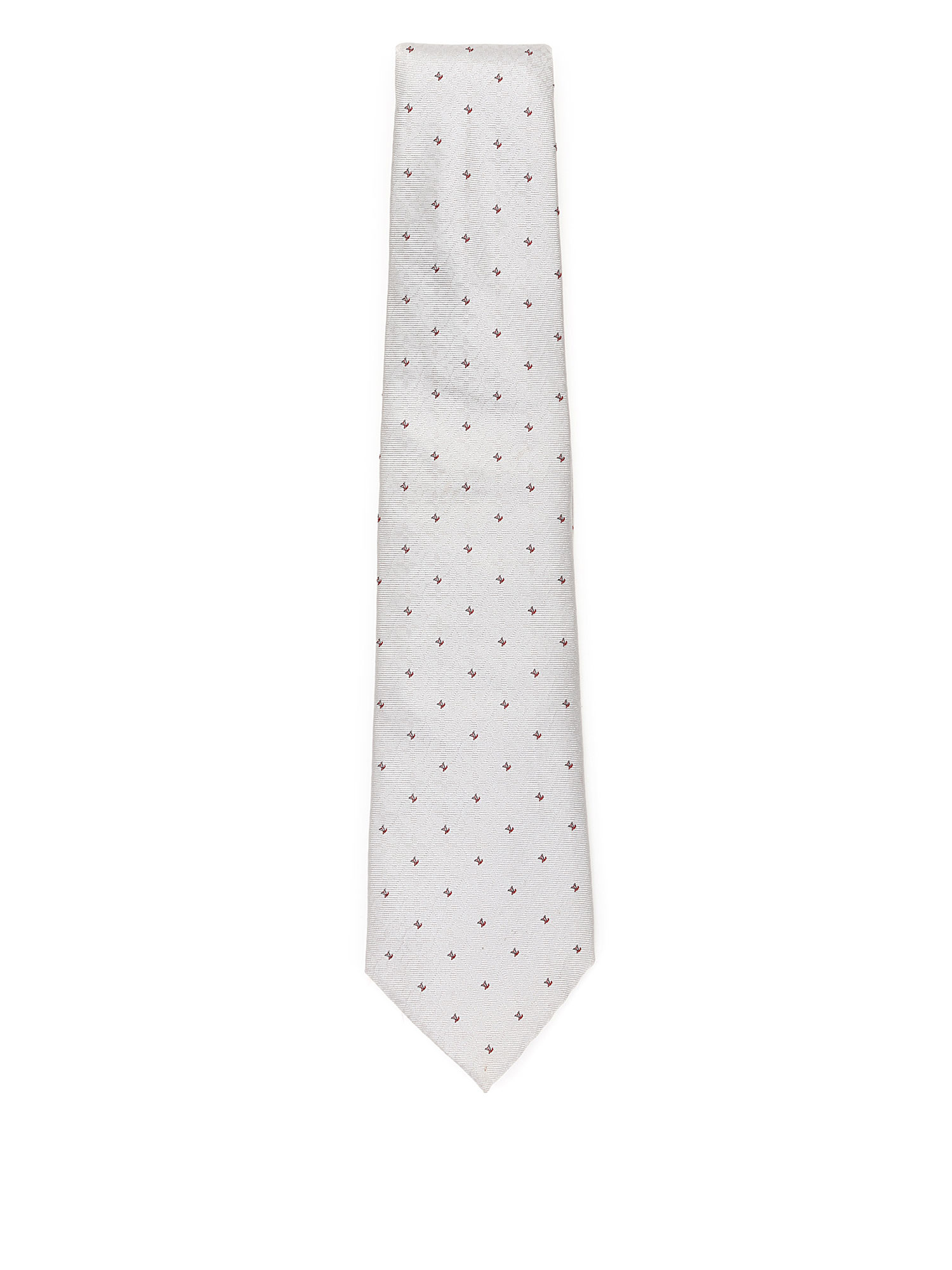 Silk tie with small logo pattern in light grey, featuring small red dots throughout.